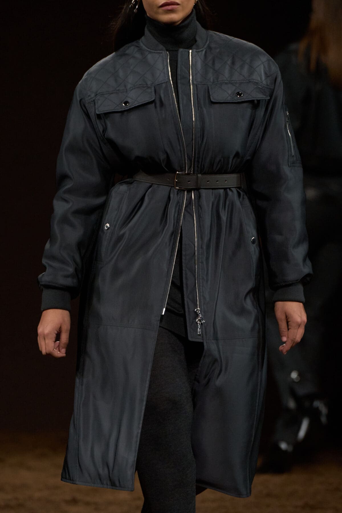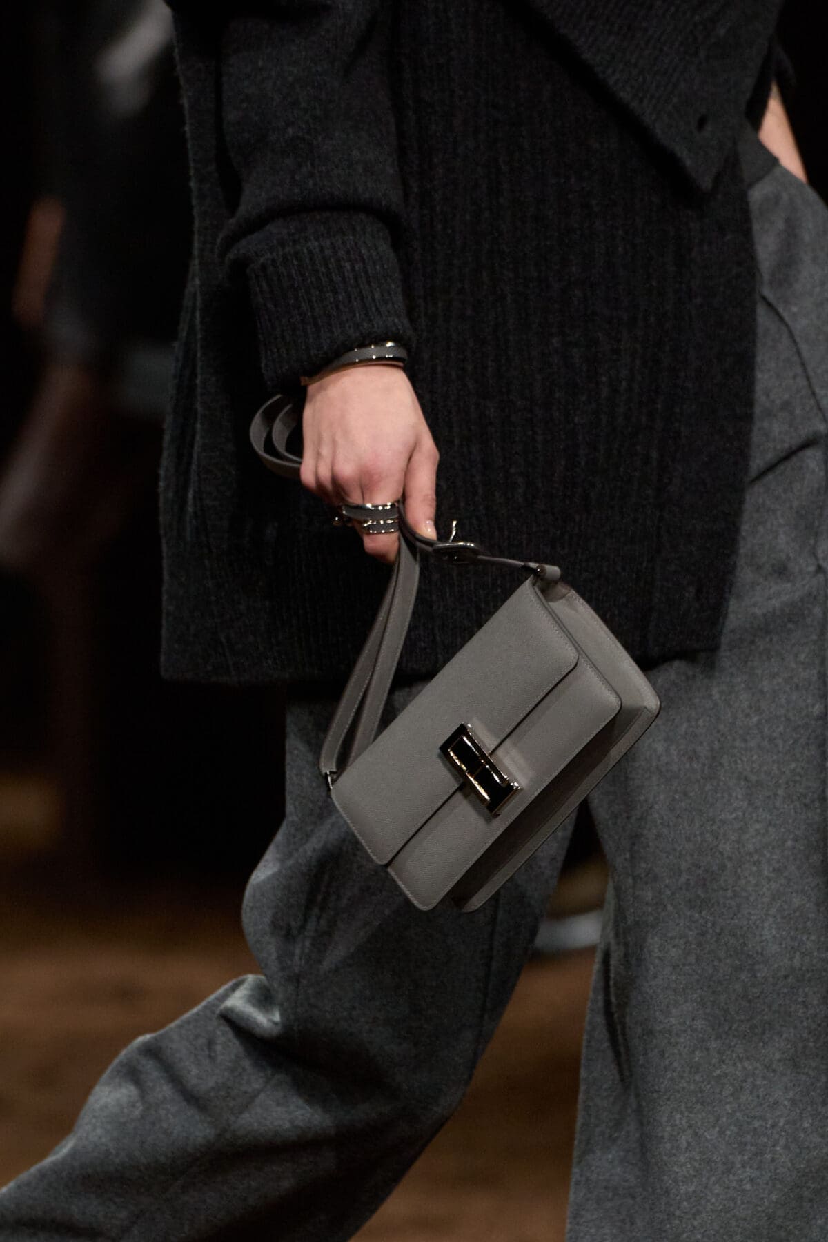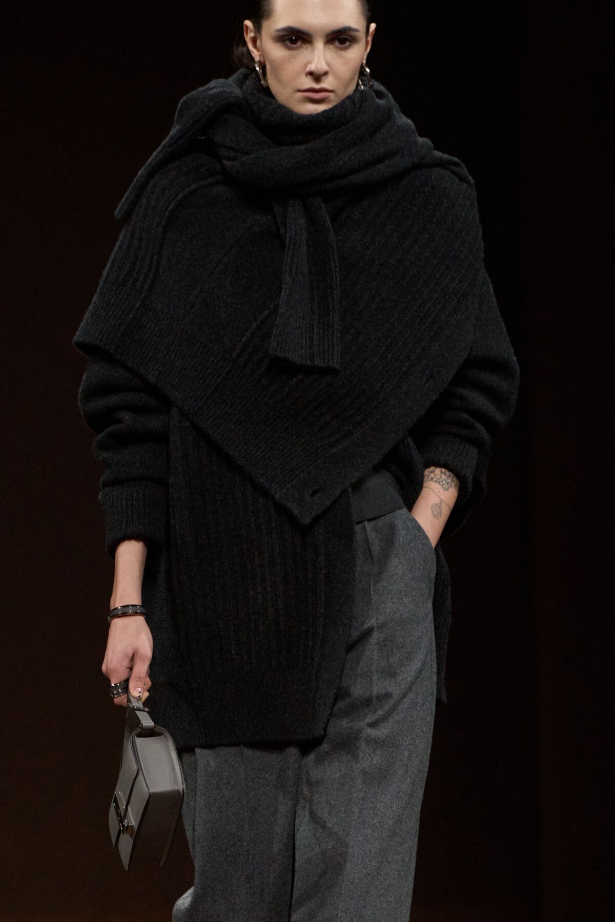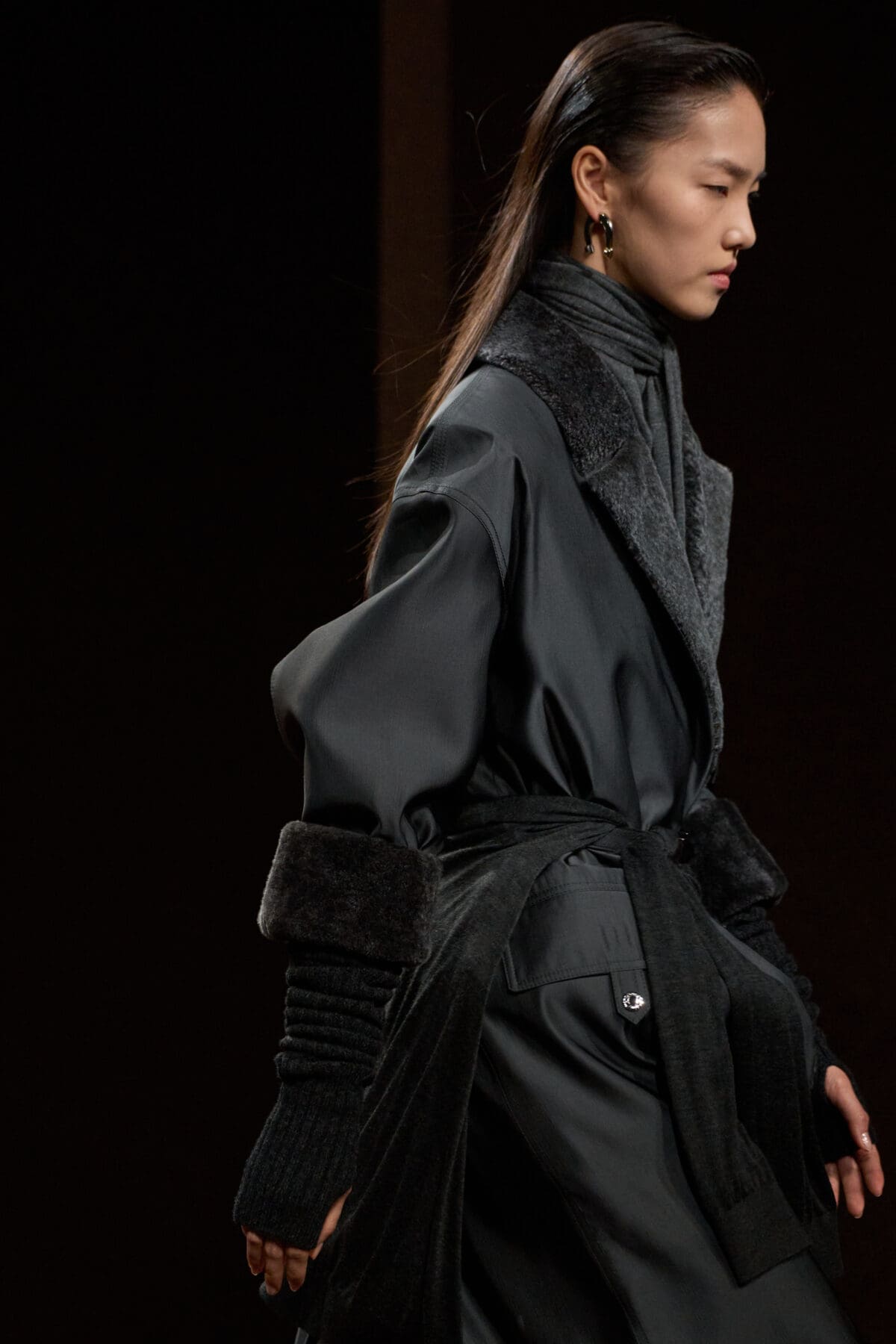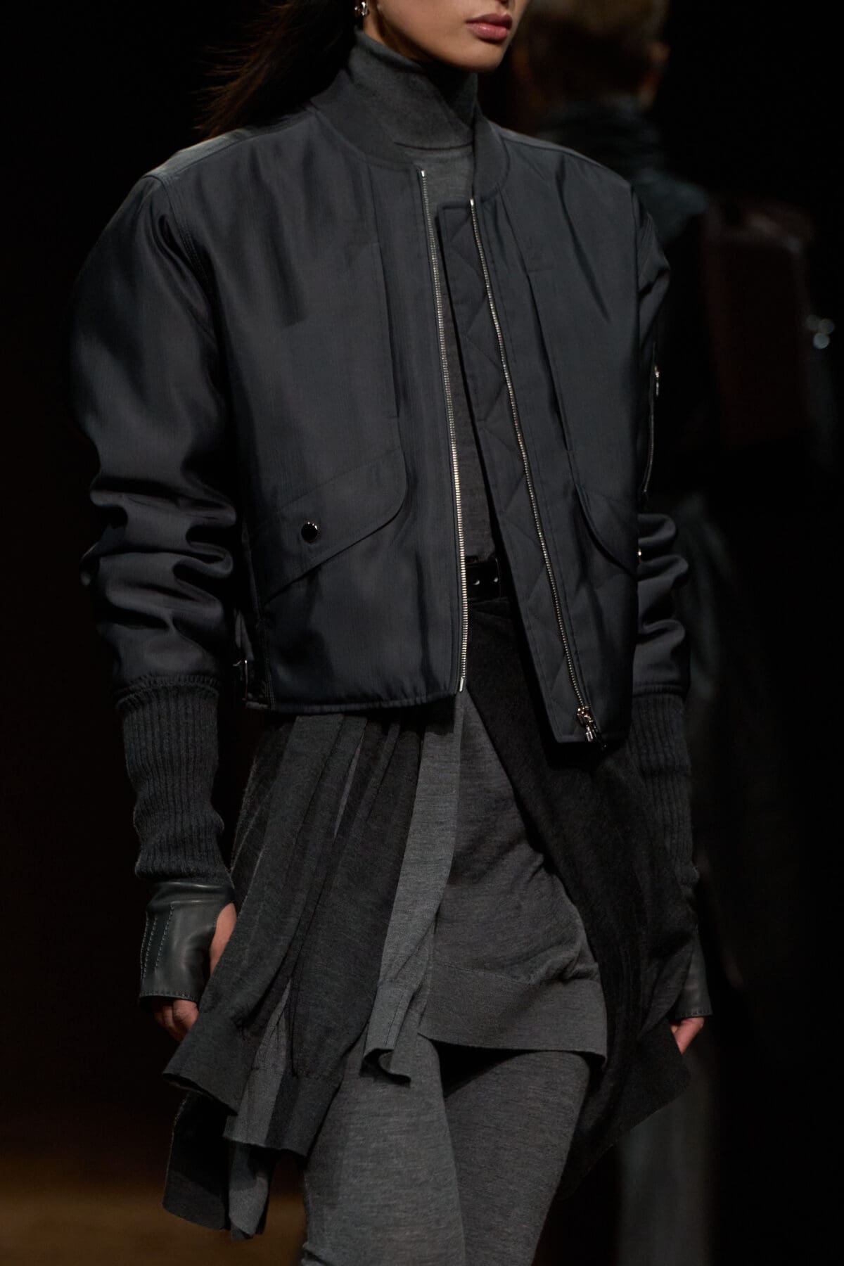 她將這個系列命名為 “Leather Dandy”。到了第六套造型——一件短版絎縫外套,拉鍊敞開露出黑色高領毛衣,搭配高腰窄褲,由光亮的黑色手套皮革製成,展現出一種「馬術騎士」風格——這已經成為Vanhée加入品牌十年來最出色的系列。為甚麼?因為Hermès的核心在於極致精緻的皮革材質與工藝,馬術元素的細膩詮釋,以及令收藏家心動的細節。Vanhée觸及了這些元素中略帶戀物癖的一面,並首次將其從中產階級的框架中解放出來。