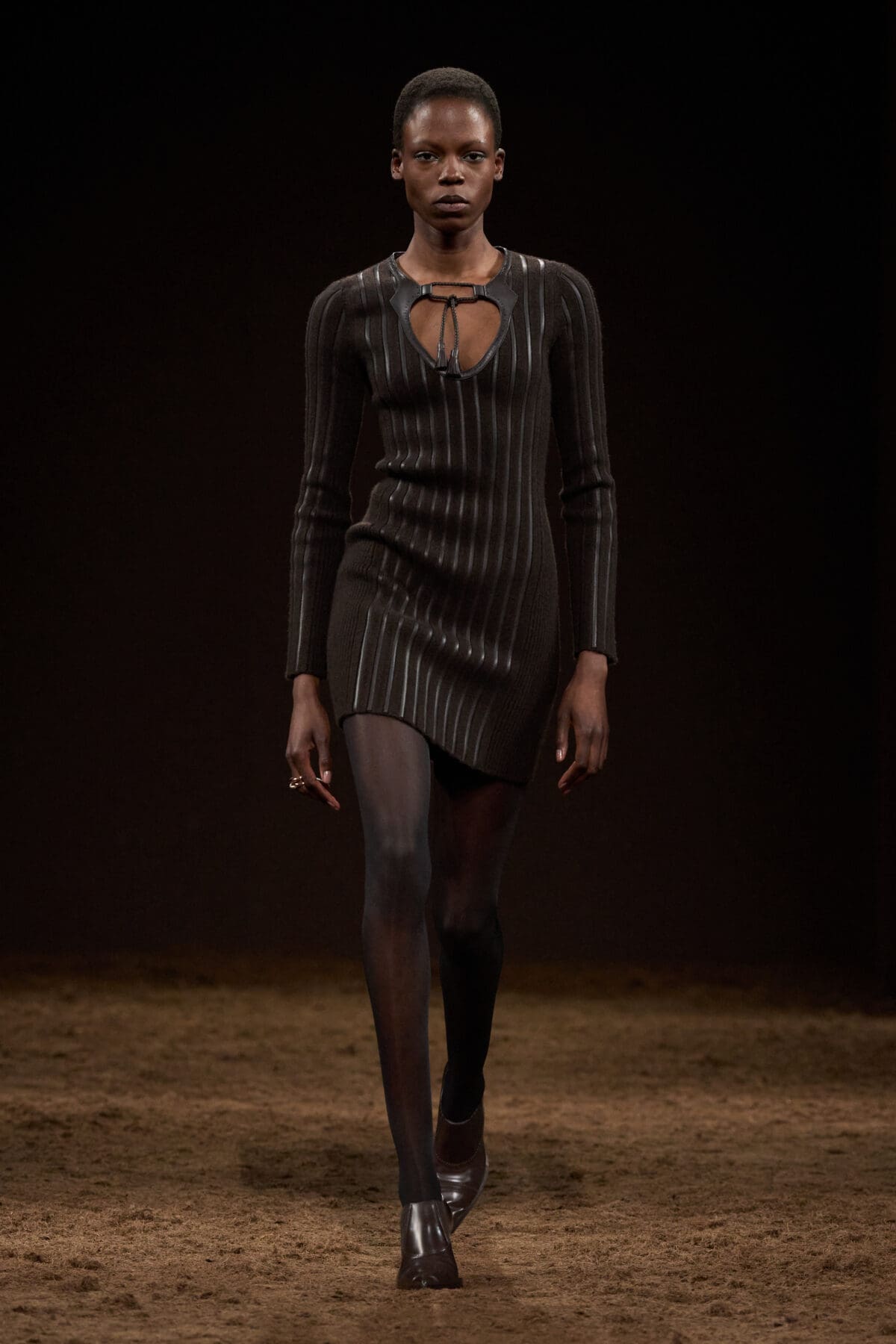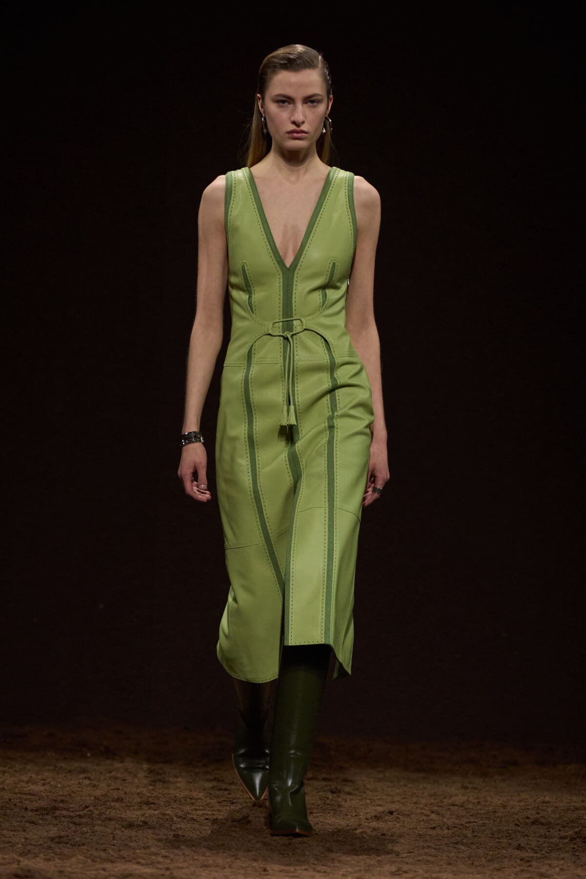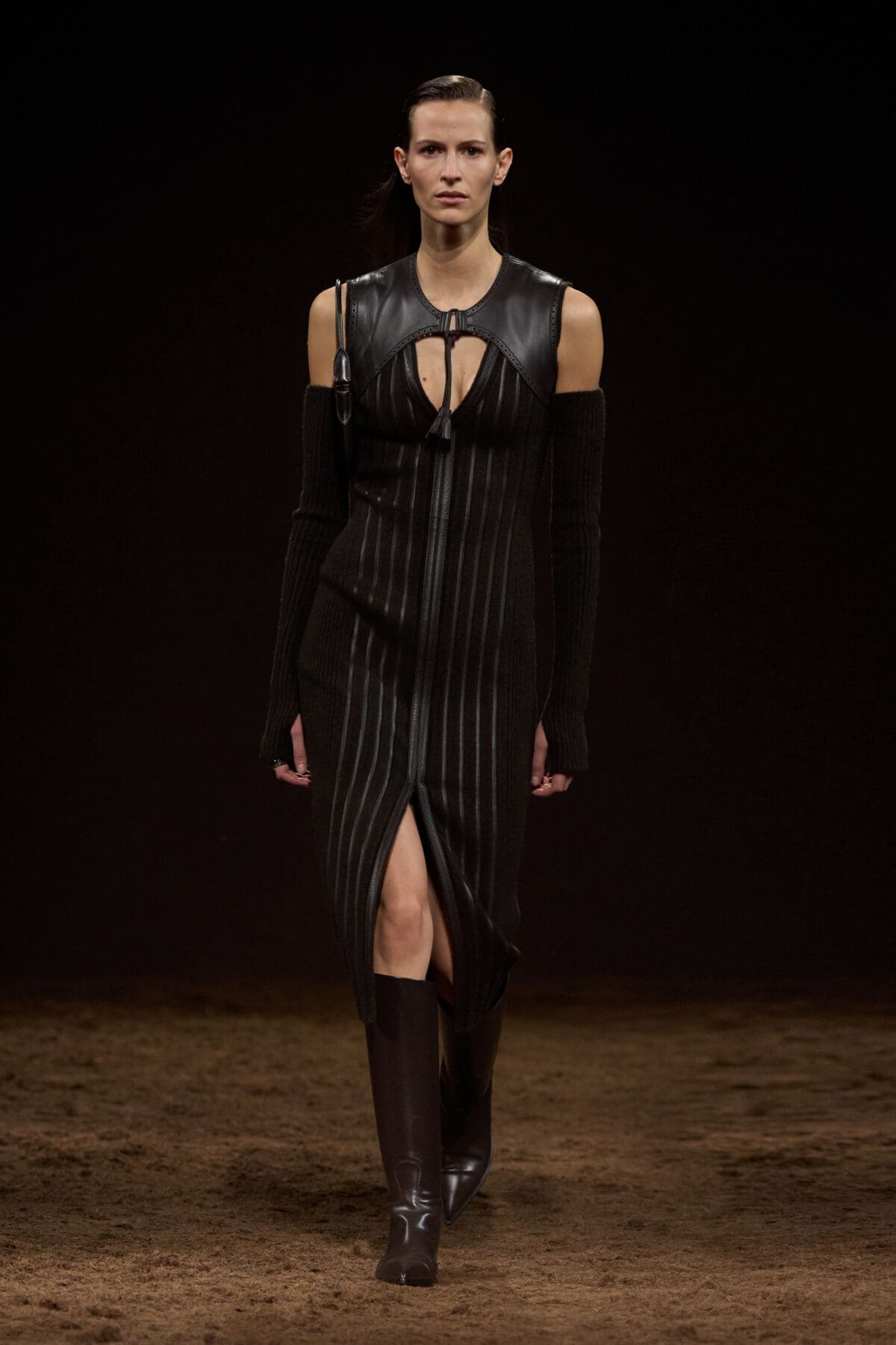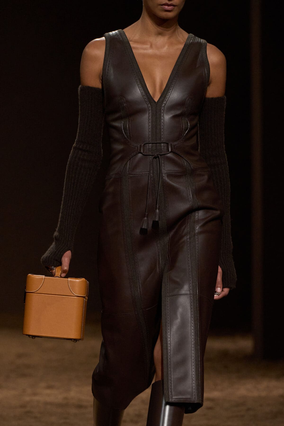 她描述創作起點的方式聽起來相當平凡:「最初,它是毛氈——皮革的好朋友與支持者。還有雕花鞋。」直到你看到這些元素如何在超修身深V禮服中完美結合,禮服由皮革與毛氈面料製成,飾以雕花工具的穿孔線條,並以繫帶、環扣與流蘇點綴。這並非意味著顛覆性的女性力量與過於誇張的性感,實際上這些設計是被限制在實用主義、隨性時尚與極致性感之間的一種極簡平衡中,反而更加有力。