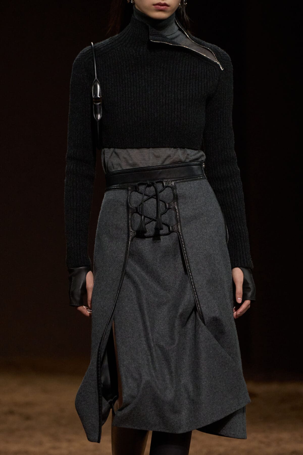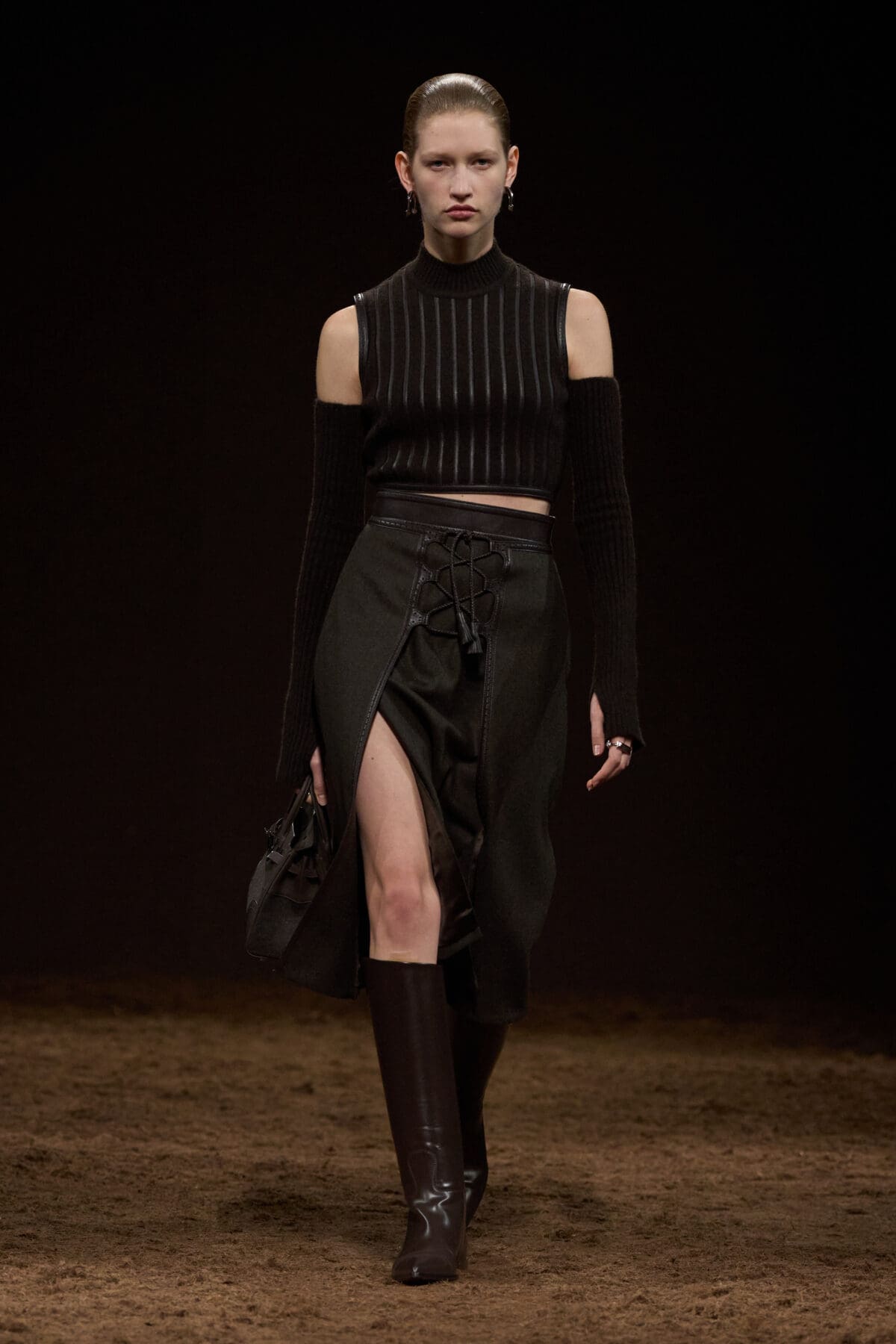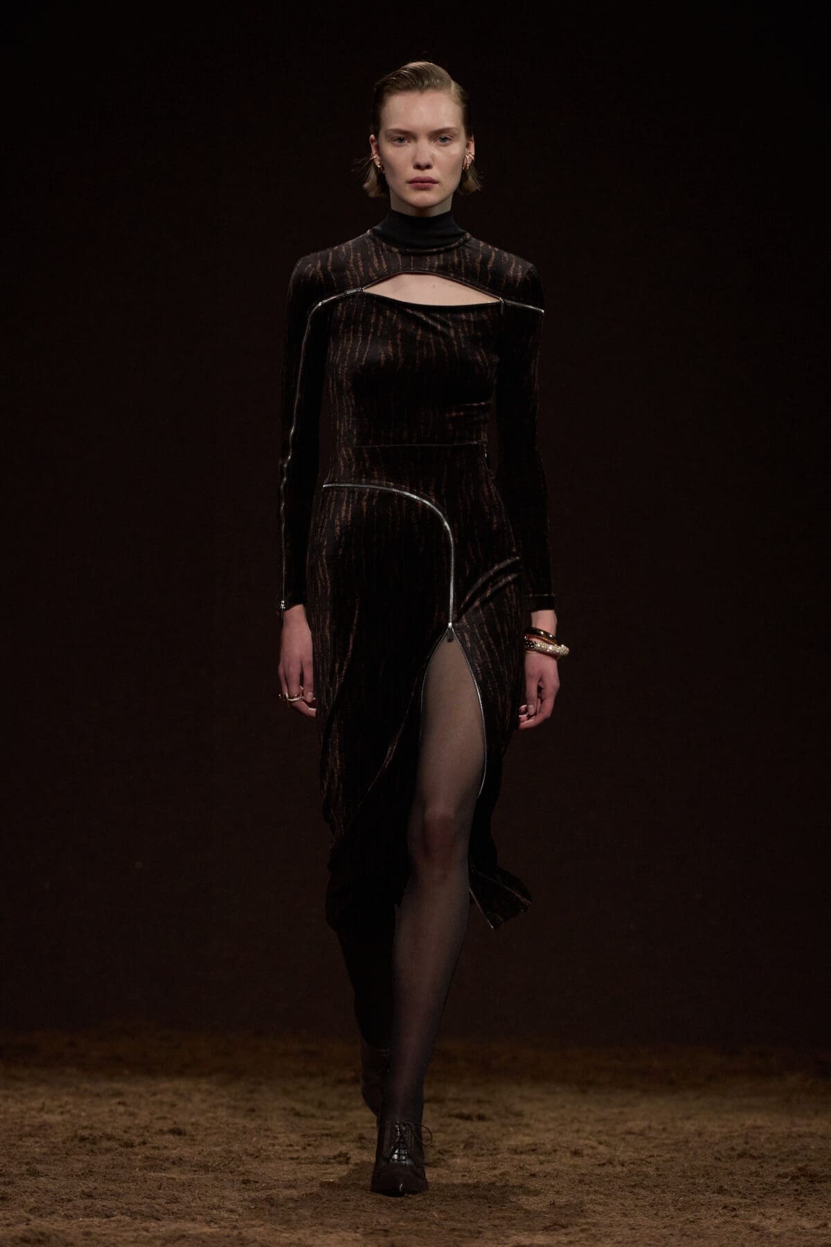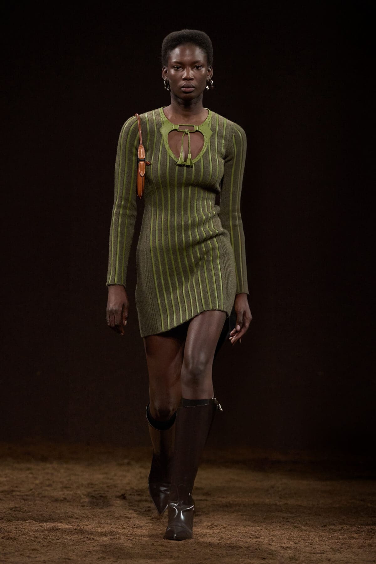 她描述創作起點的方式聽起來相當平凡:「最初,它是毛氈——皮革的好朋友與支持者。還有雕花鞋。」直到你看到這些元素如何在超修身深V禮服中完美結合,禮服由皮革與毛氈面料製成,飾以雕花工具的穿孔線條,並以繫帶、環扣與流蘇點綴。這並非意味著顛覆性的女性力量與過於誇張的性感,實際上這些設計是被限制在實用主義、隨性時尚與極致性感之間的一種極簡平衡中,反而更加有力。