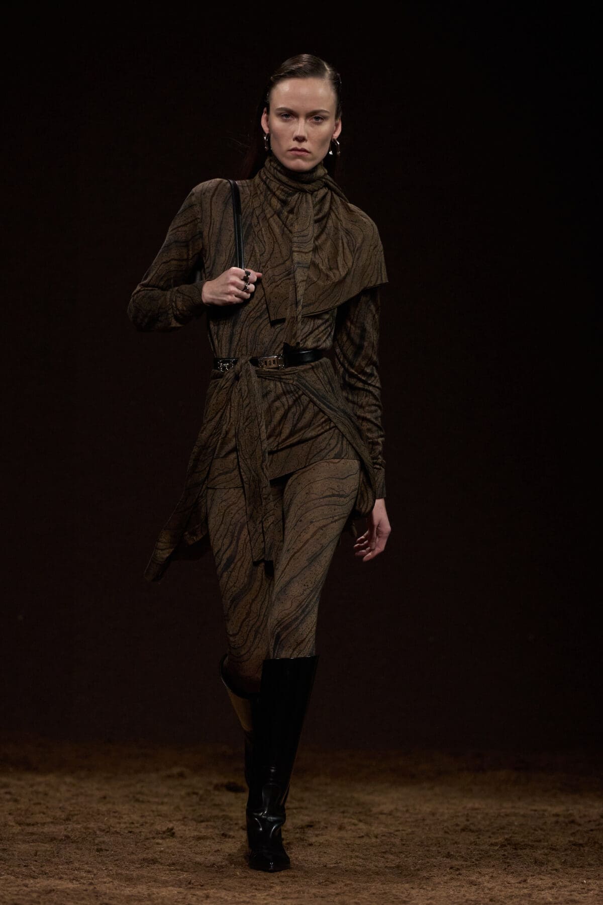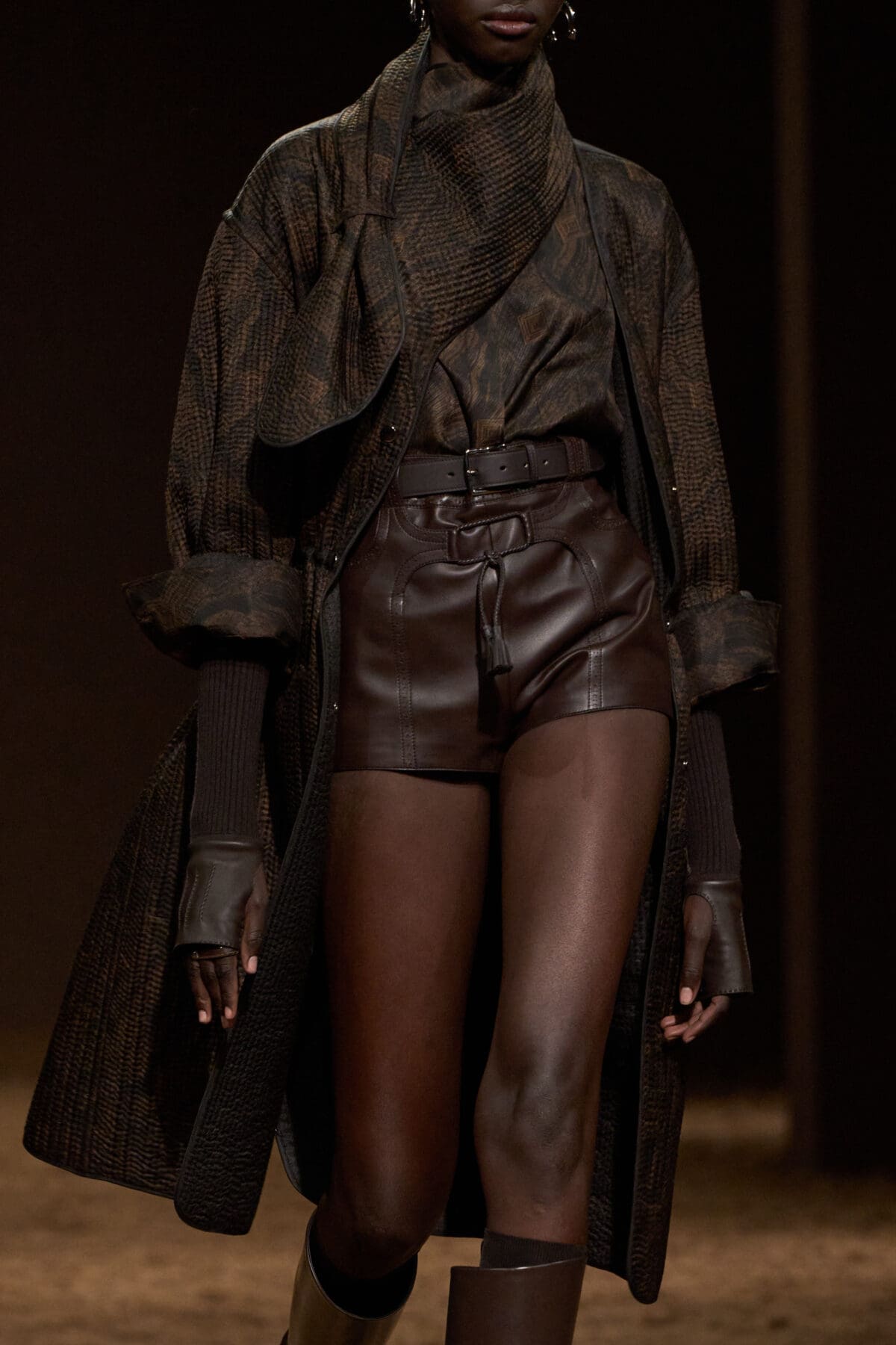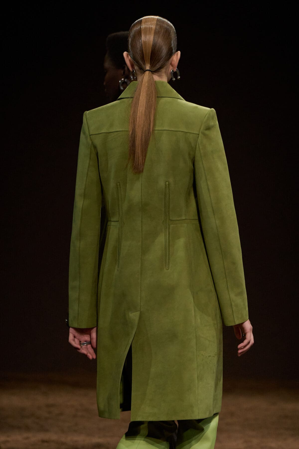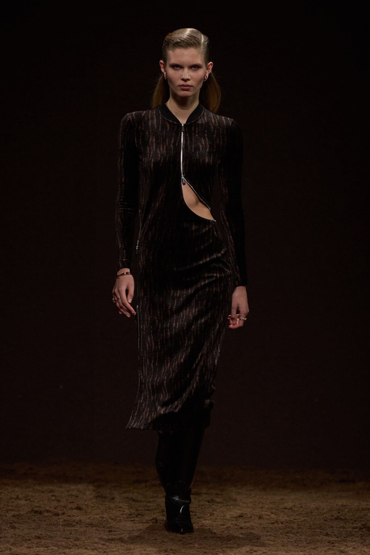 她描述創作起點的方式聽起來相當平凡:「最初,它是毛氈——皮革的好朋友與支持者。還有雕花鞋。」直到你看到這些元素如何在超修身深V禮服中完美結合,禮服由皮革與毛氈面料製成,飾以雕花工具的穿孔線條,並以繫帶、環扣與流蘇點綴。這並非意味著顛覆性的女性力量與過於誇張的性感,實際上這些設計是被限制在實用主義、隨性時尚與極致性感之間的一種極簡平衡中,反而更加有力。
