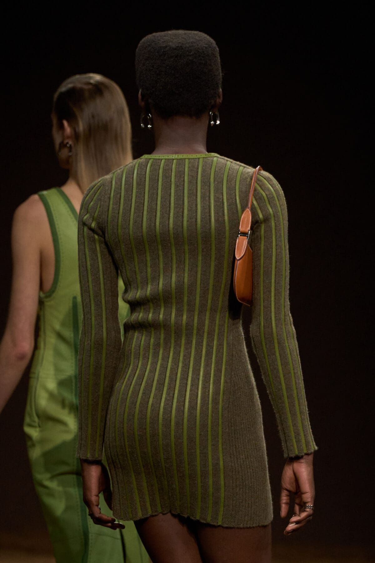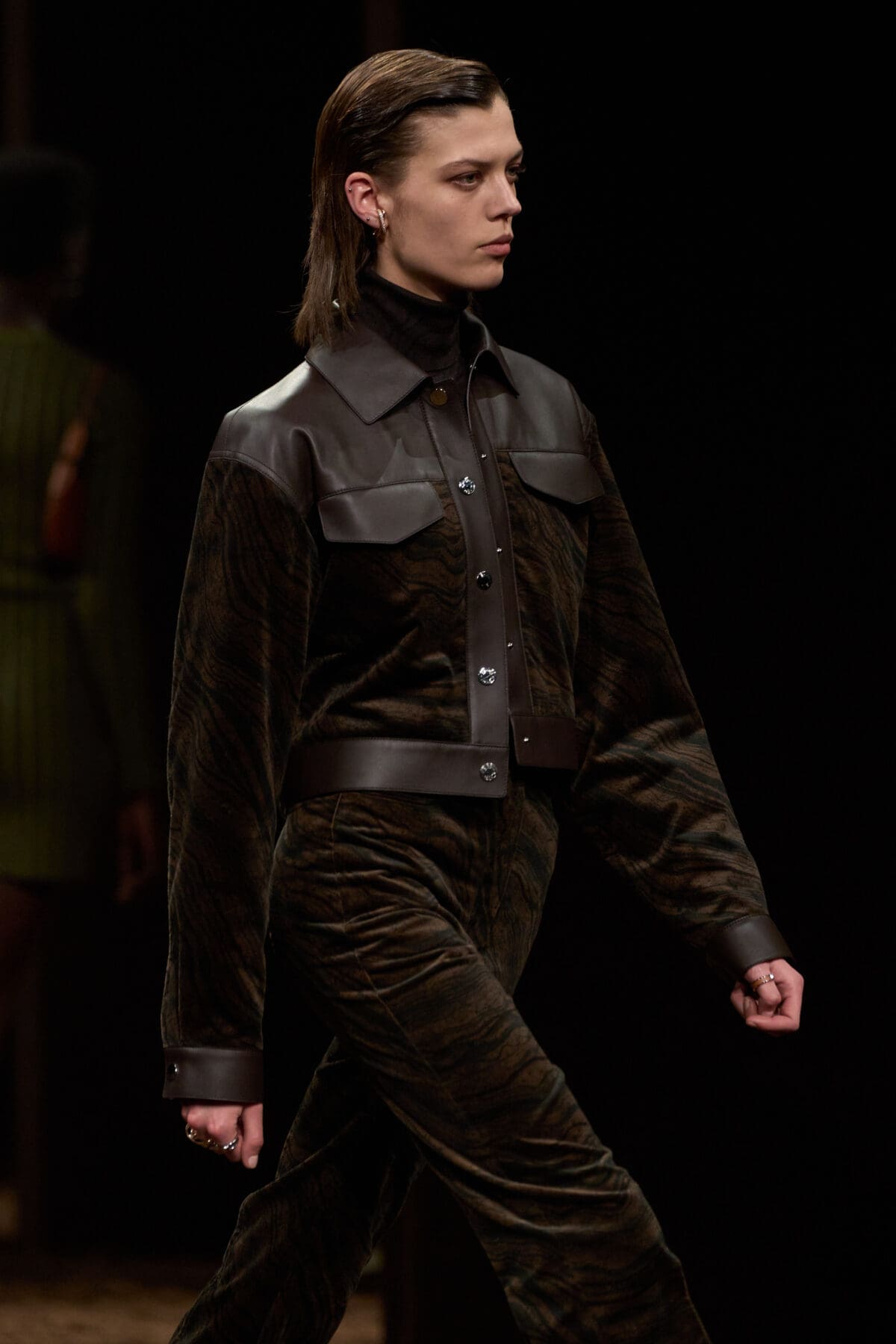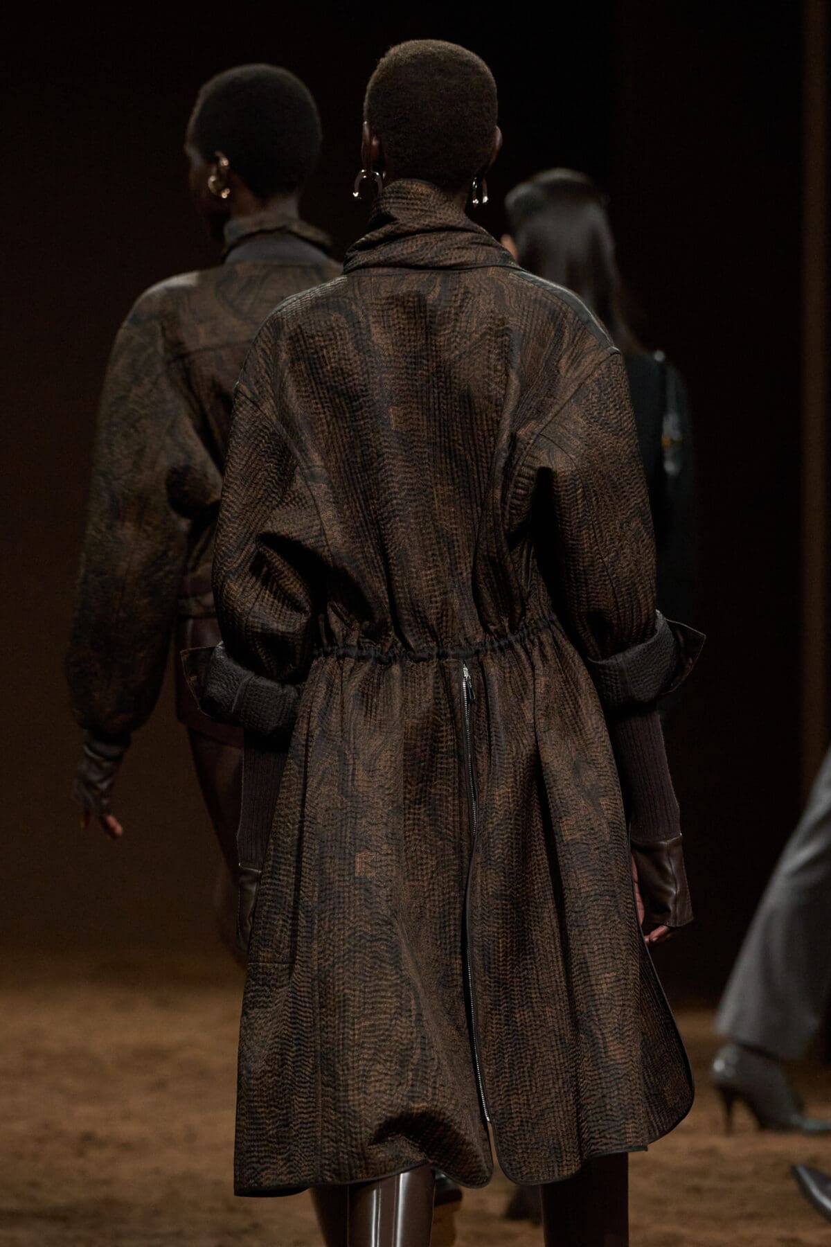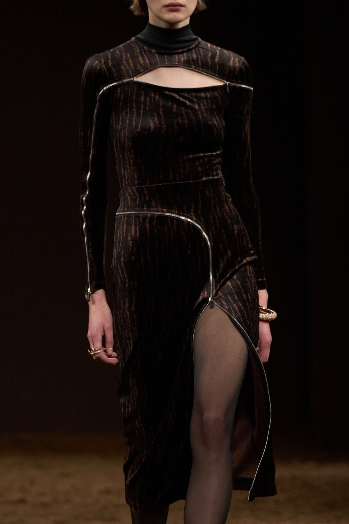 她描述創作起點的方式聽起來相當平凡:「最初,它是毛氈——皮革的好朋友與支持者。還有雕花鞋。」直到你看到這些元素如何在超修身深V禮服中完美結合,禮服由皮革與毛氈面料製成,飾以雕花工具的穿孔線條,並以繫帶、環扣與流蘇點綴。這並非意味著顛覆性的女性力量與過於誇張的性感,實際上這些設計是被限制在實用主義、隨性時尚與極致性感之間的一種極簡平衡中,反而更加有力。