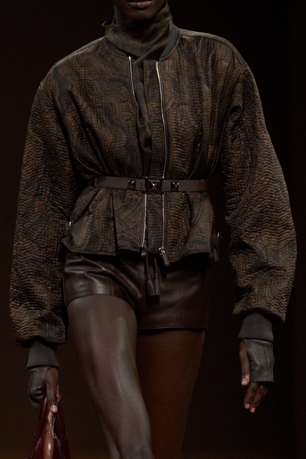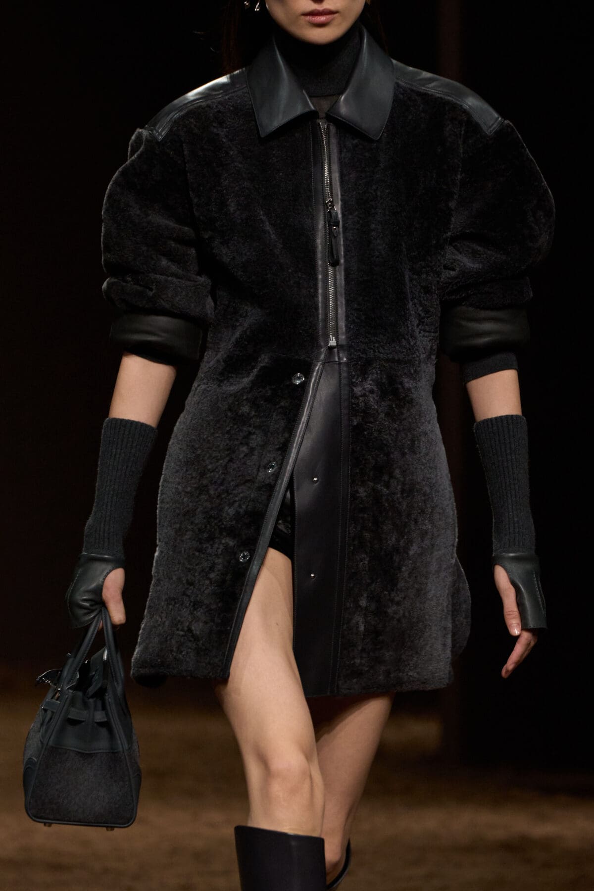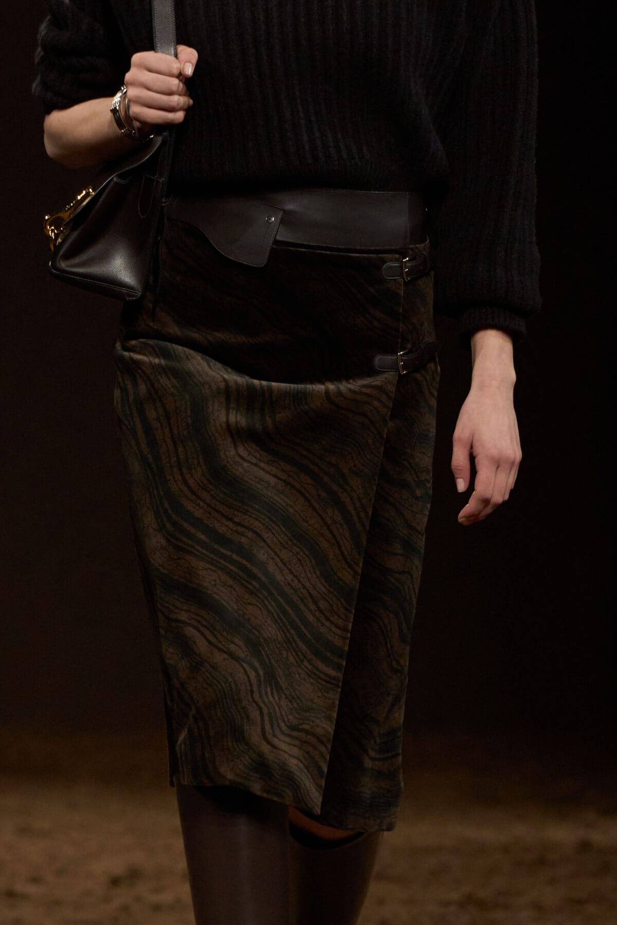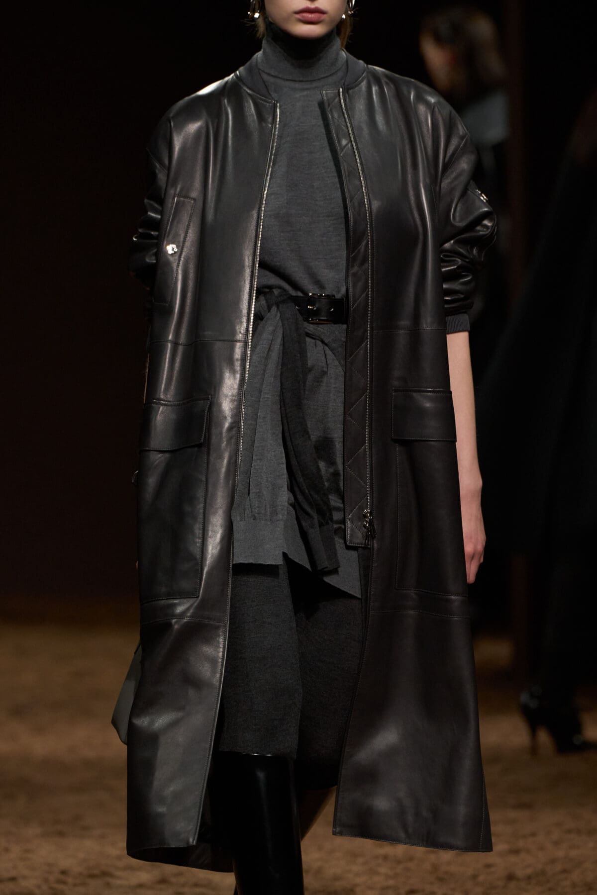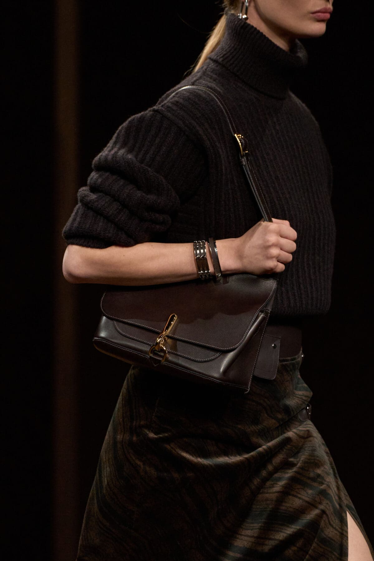 一些具體例子:一件有著強勢肩線的棕色皮革無領Spencer外套,搭配一種馬鞍袋式裙襬,以鉻扣固定;一件拉鍊直達背部的騎行外套,露出絎縫皮革內襯,這件內襯本身也可作為第二件外套呈現。還有許多皮革短褲、喇叭皮革褲,以及小巧迷人的「小手袋」夾在腋下,還有一個單獨的小型、符合人體工學的梅紫色馬鞍袋,配以大型銀色馬銜扣。
