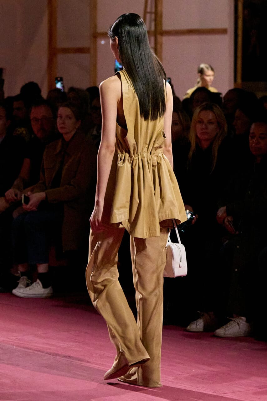 一個造型,猶如人生的縮影,又恰似一幅精心雕琢的素描,在Hermès 2025春夏系列中呈現出層層堆疊的豐富內涵。首先映入眼簾的是大地色透視造型,具備流暢線條的不規則皮革外套,與網眼面料背心和透視闊腿褲相映成趣,整套造型在設計上別出心裁地融入了口袋和金屬扣環,既展現了現代技術的精湛,又蘊含着傳統工藝的溫度。而抽繩背心和短款外套等款式更是與不同元素進行疊加,為打造高級而不失設計感的多元穿搭方式提供靈感。