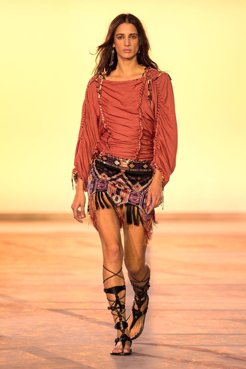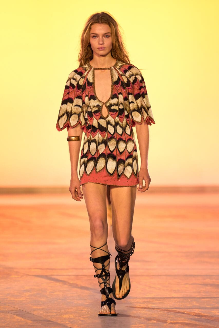 「我想回到我們的根基,做一些真正手工藝的東西,這是關於一群非常強大的女性。而且有一點亞馬遜的氛圍。」Marant在《Vogue》Runway的採訪中說。系列的熱帶元素引人注目,如絲線編織圖案針織裙,靈感來自南美的蝴蝶。品牌工藝和DNA非常顯著,彩虹色調流蘇的絲質外套、米色和抽象印花拼接而成的上衣,還有由銀色珍珠光澤物料構成的金屬灰色長裙,透出身體肌膚,賦予性感又慵懶的氣息。