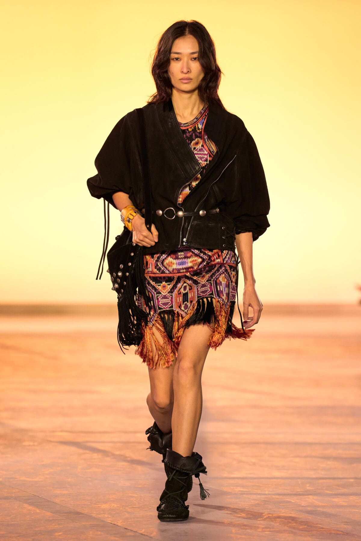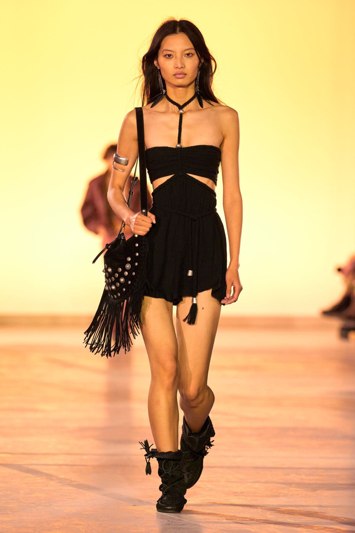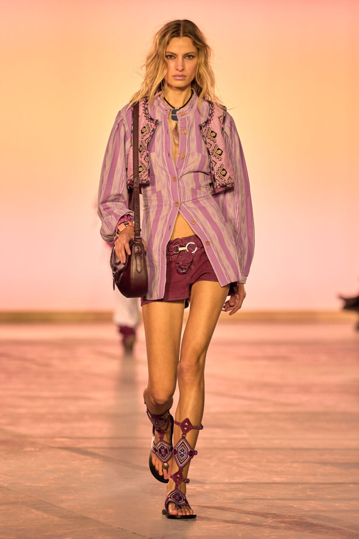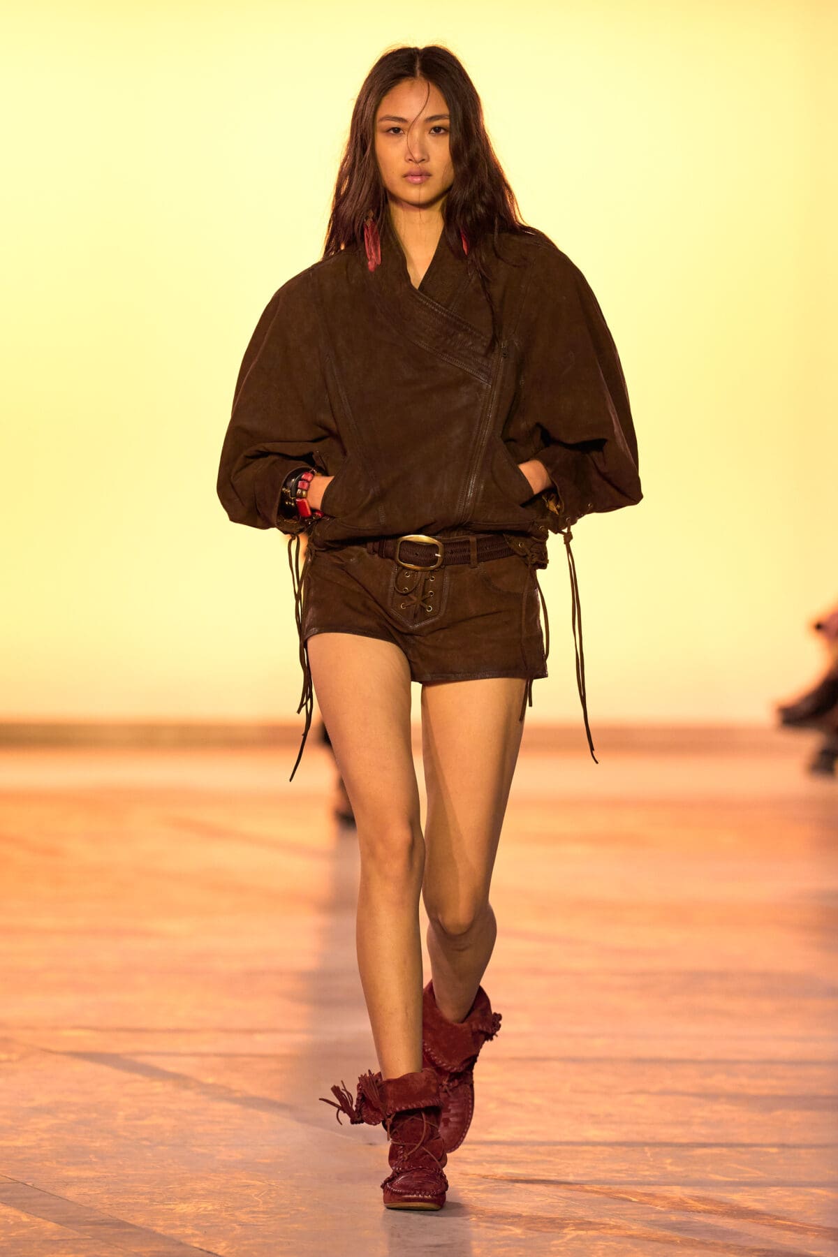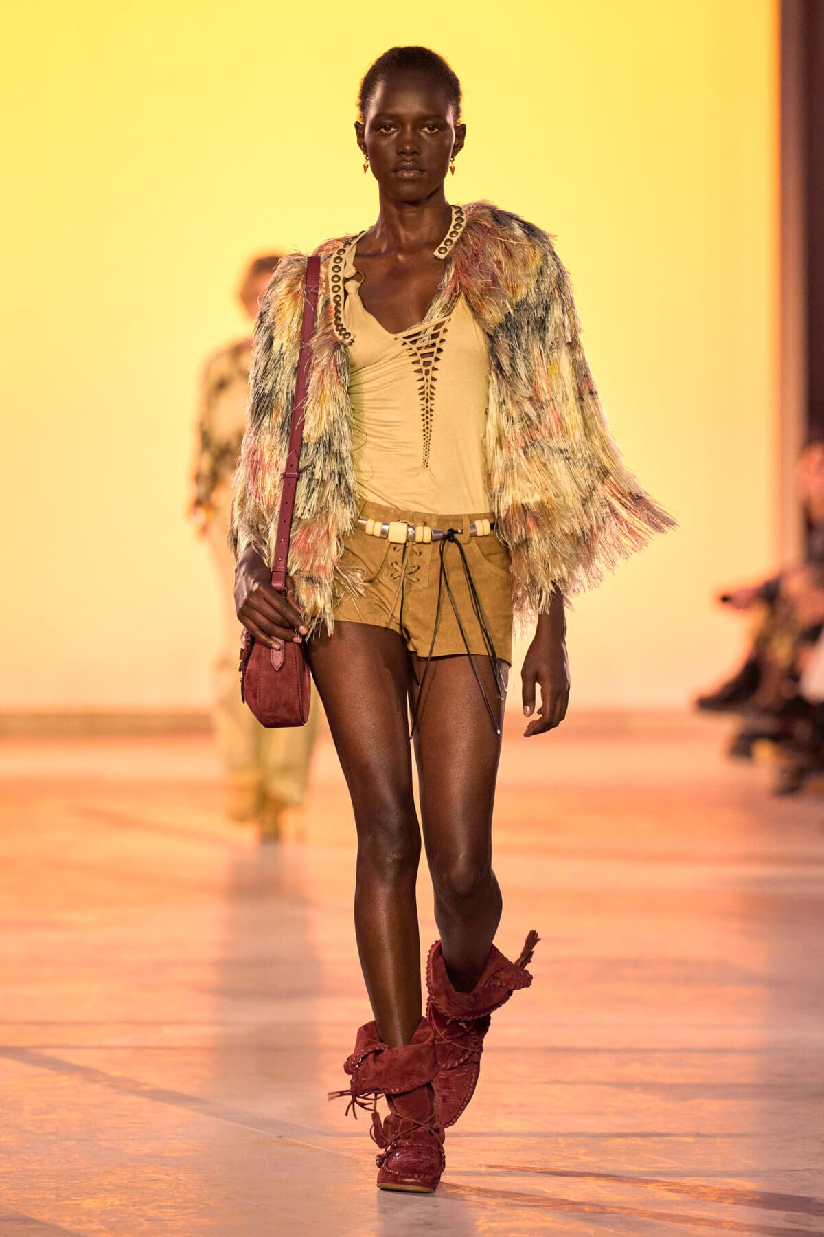 在Isabel Marant 2025春夏系列,你會看到許多精緻的編織和刺繡,色彩繽紛的絲綢印花短裙、黑灰色牛仔外套、鉚釘黑色皮短褲,還有大量的麂皮與皮革,其中更以羽毛般的流蘇點綴,這些都是Isabel Marant非常標誌性的元素,此外,平底靴、麂皮嬉皮風格的肩背袋、金色手鐲⋯⋯透出一種具力量的女性氣質,以及一種波希米亞融合龐克風格的影響。