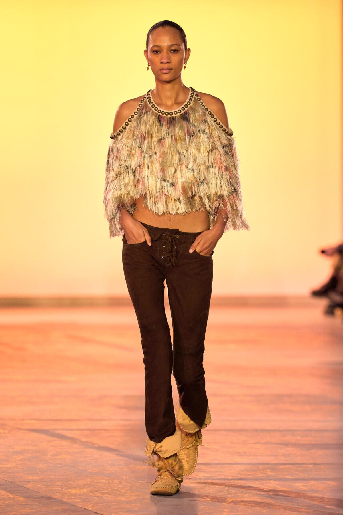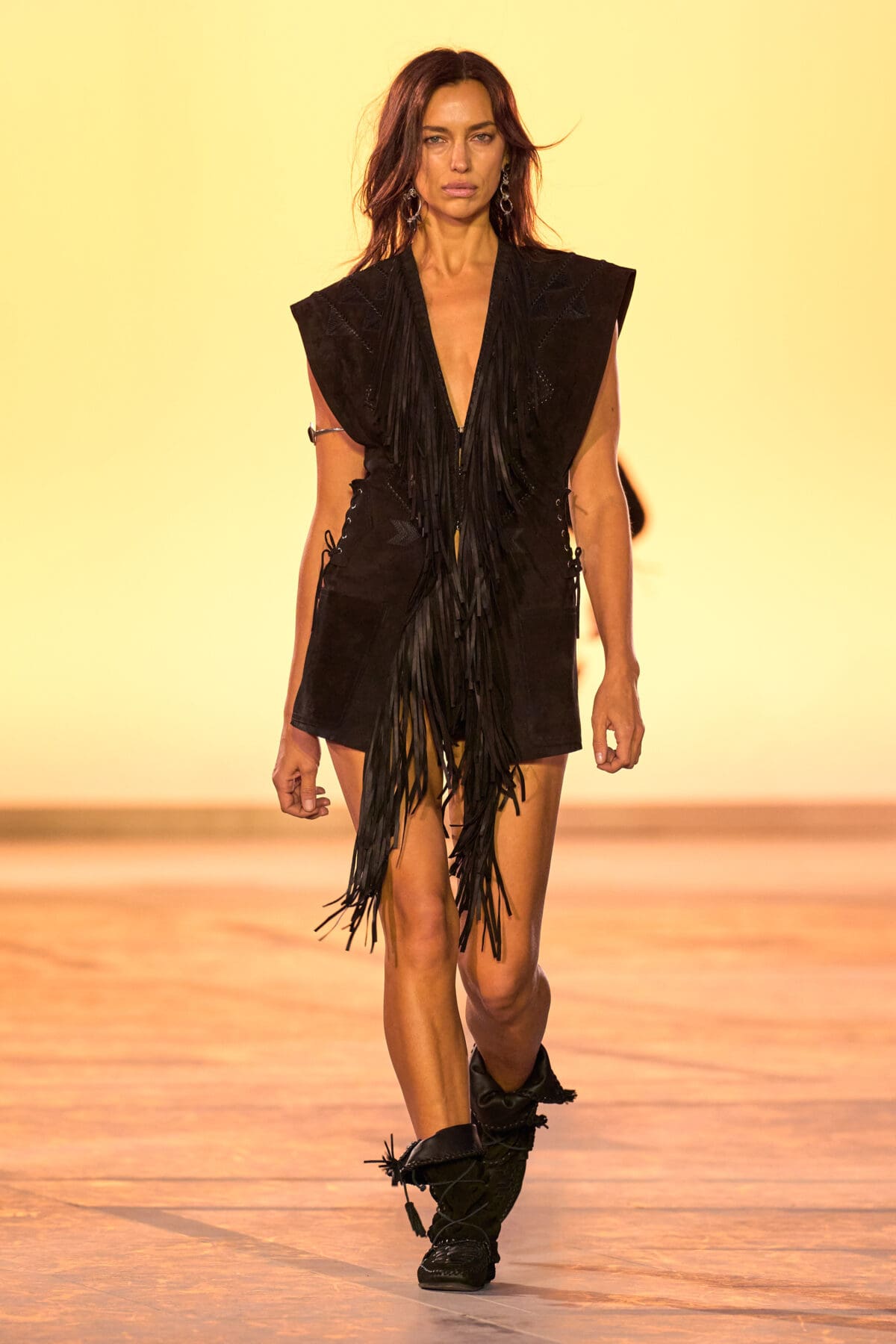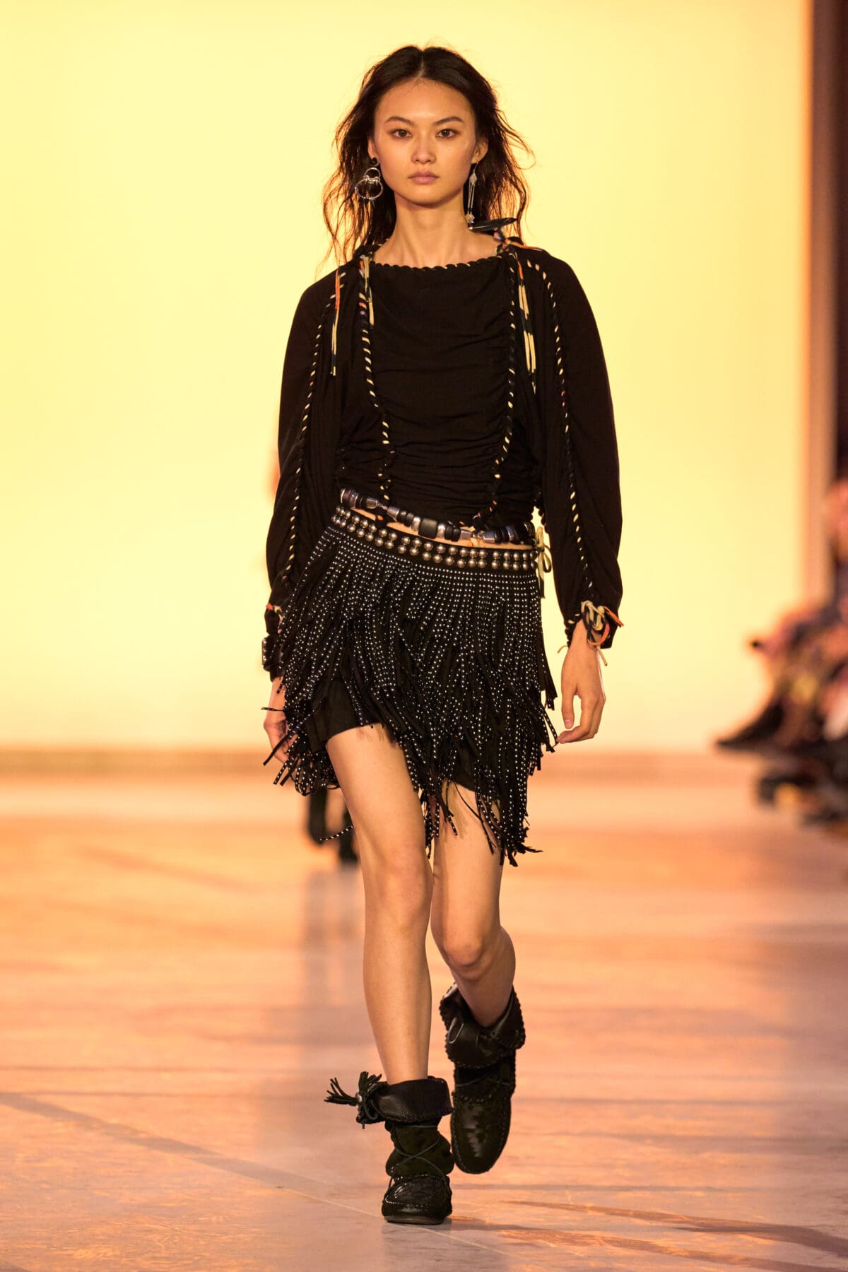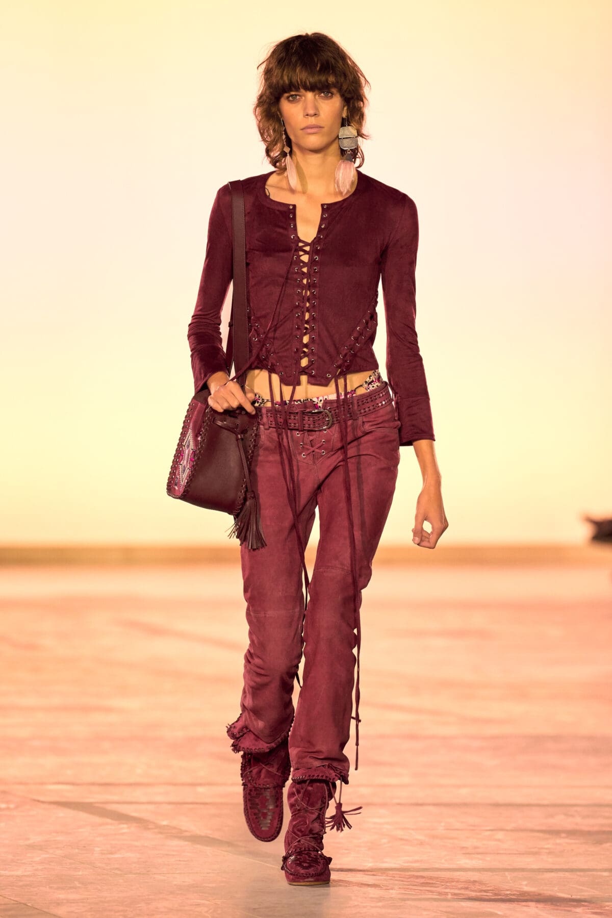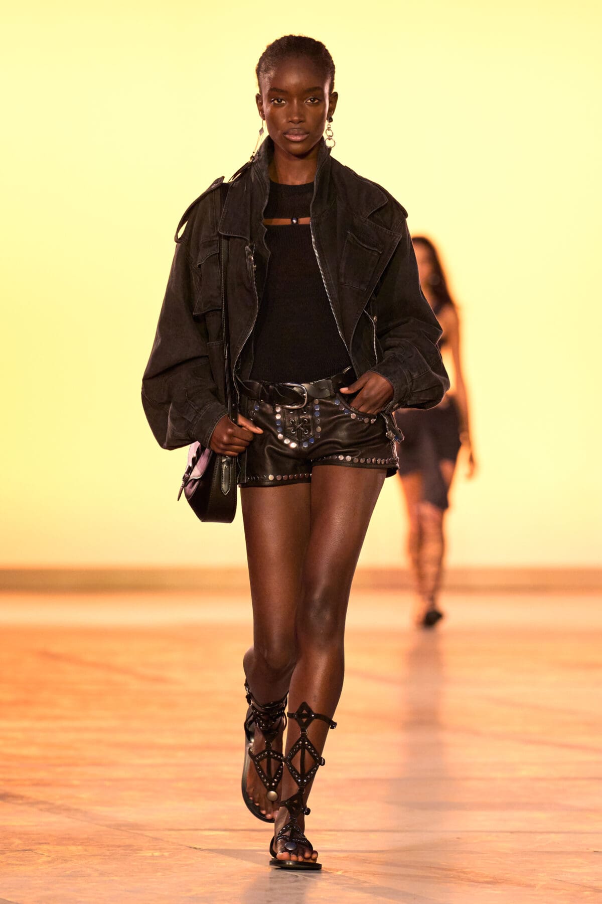 在Isabel Marant 2025春夏系列,你會看到許多精緻的編織和刺繡,色彩繽紛的絲綢印花短裙、黑灰色牛仔外套、鉚釘黑色皮短褲,還有大量的麂皮與皮革,其中更以羽毛般的流蘇點綴,這些都是Isabel Marant非常標誌性的元素,此外,平底靴、麂皮嬉皮風格的肩背袋、金色手鐲⋯⋯透出一種具力量的女性氣質,以及一種波希米亞融合龐克風格的影響。