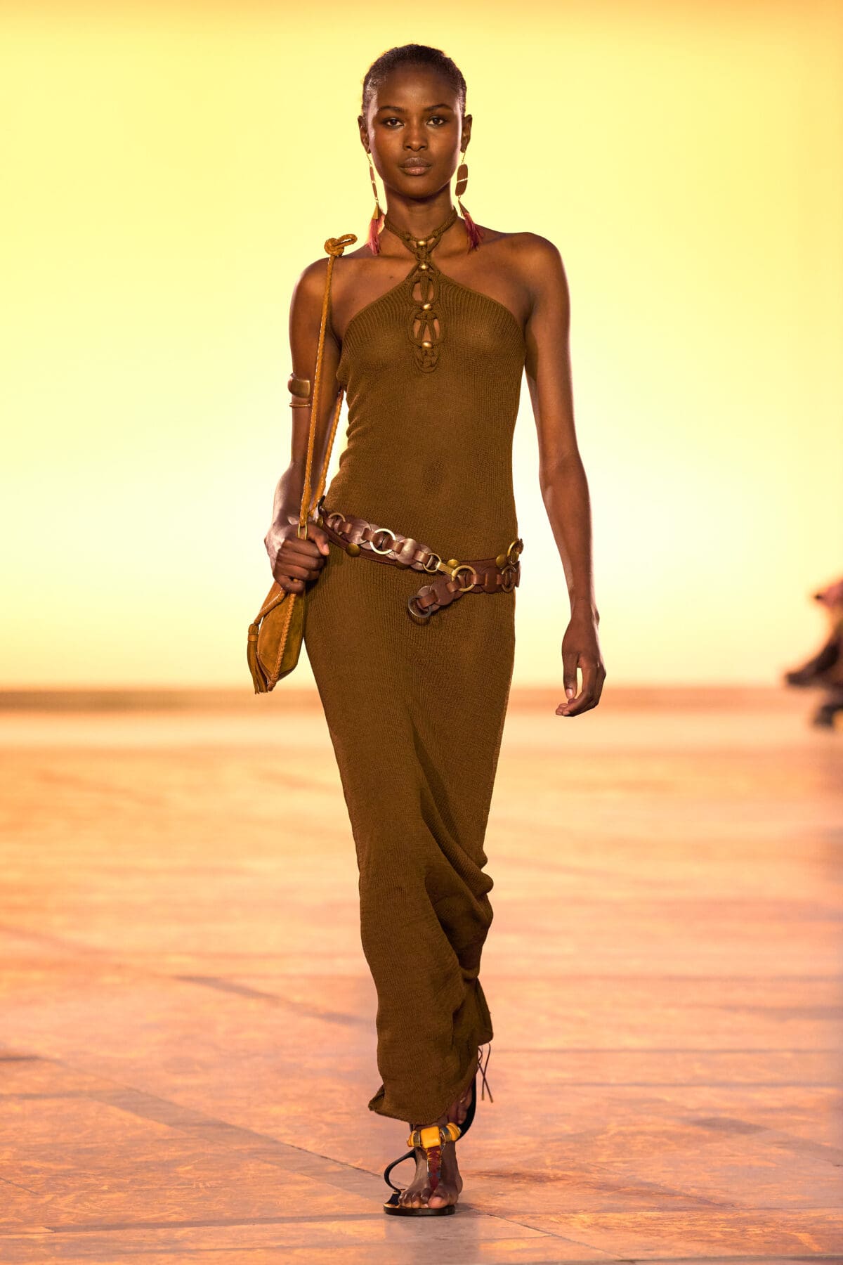 這一季,平底鞋成為另一主角,寬鬆的麂皮靴、裝飾着閃亮鉚釘的羅馬涼鞋,配搭修身的長褲或短褲,勾勒出女性的腿部線條。當然,還有經典的輕盈雪紡裙,隨着每一步飄動,裙子開衩到腰部,並由編織的繩索固定,可收緊可放鬆,成為針織彈力裙和上衣的重要元素。