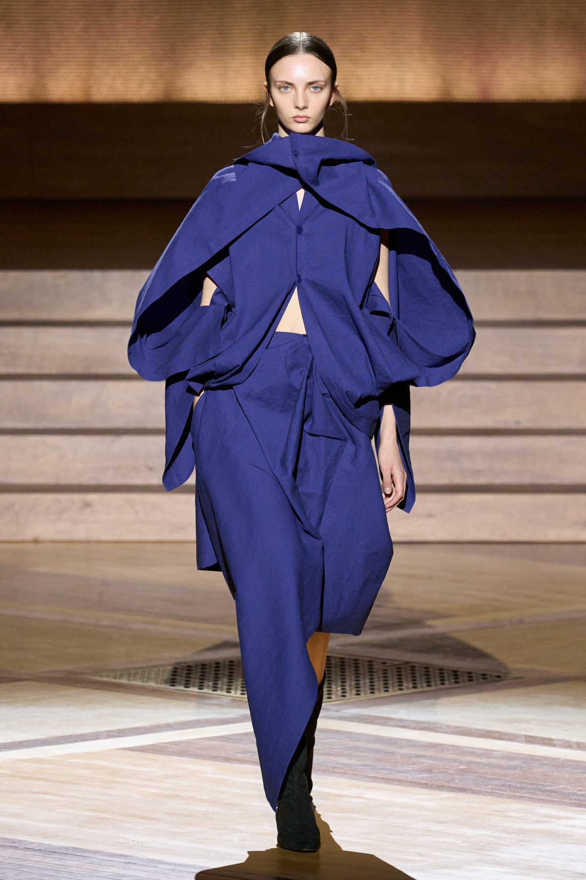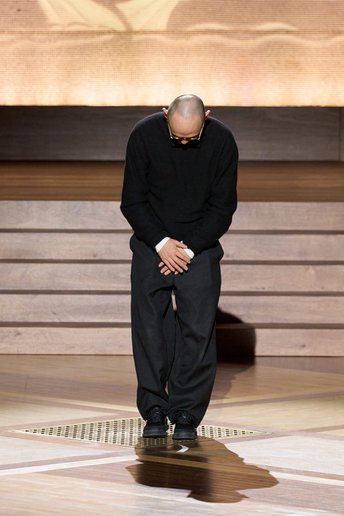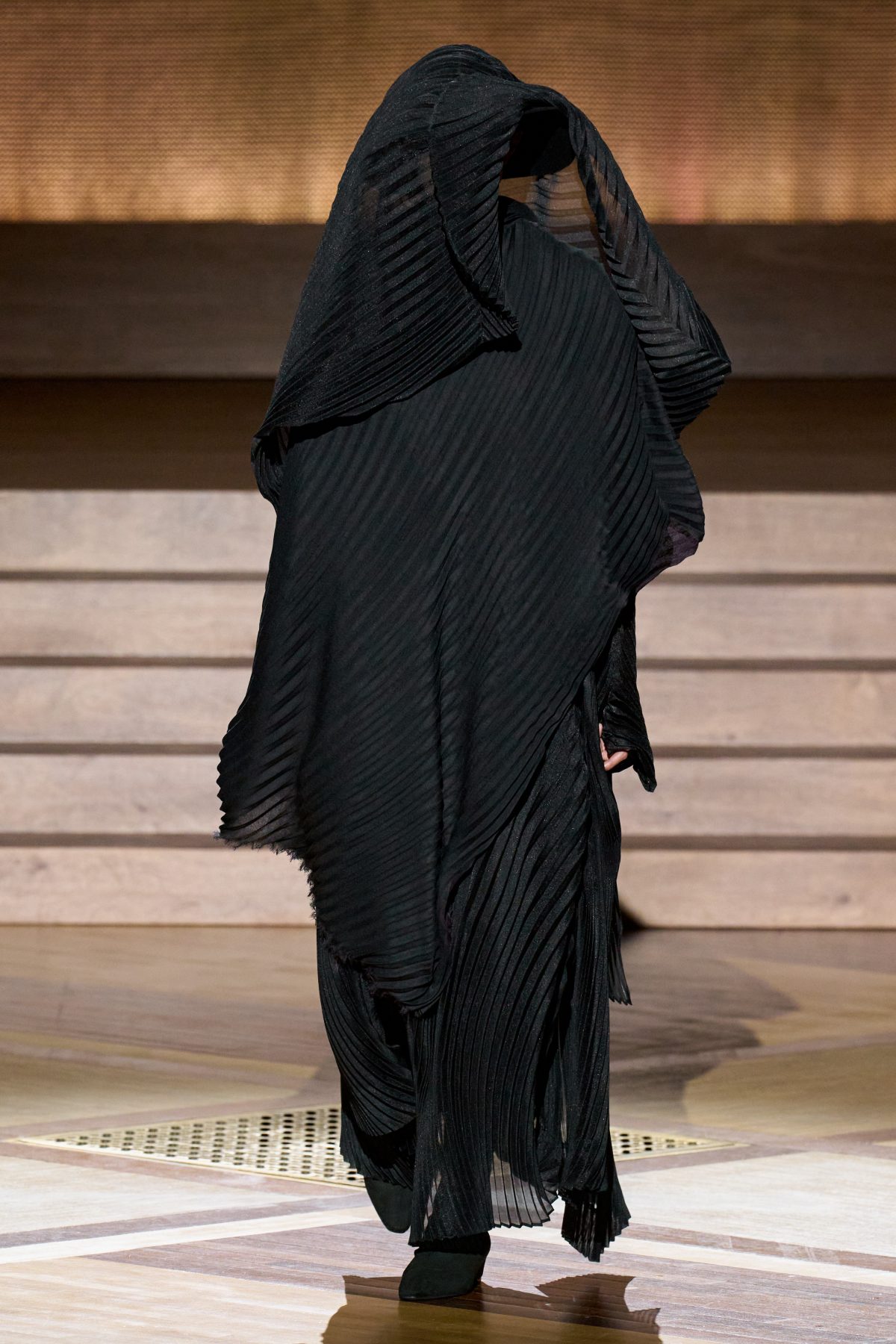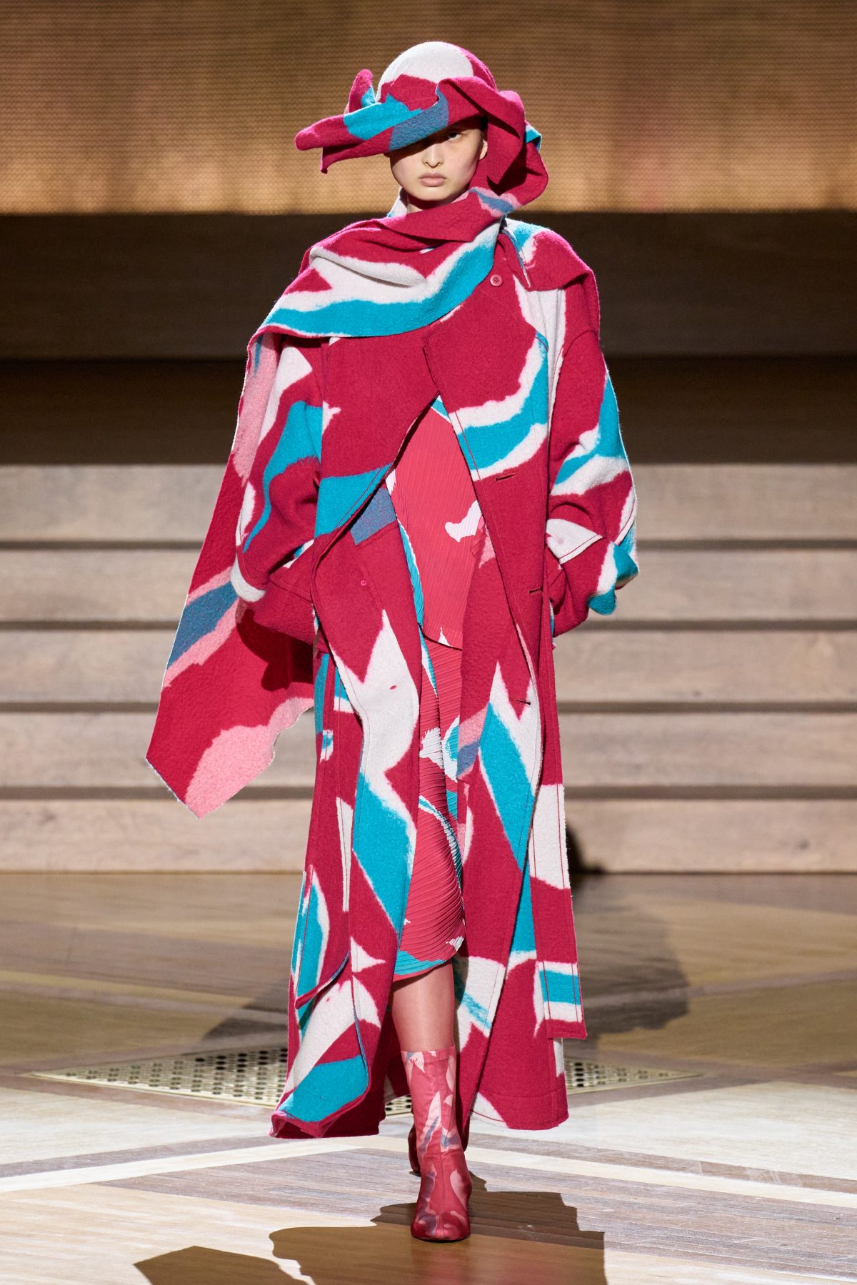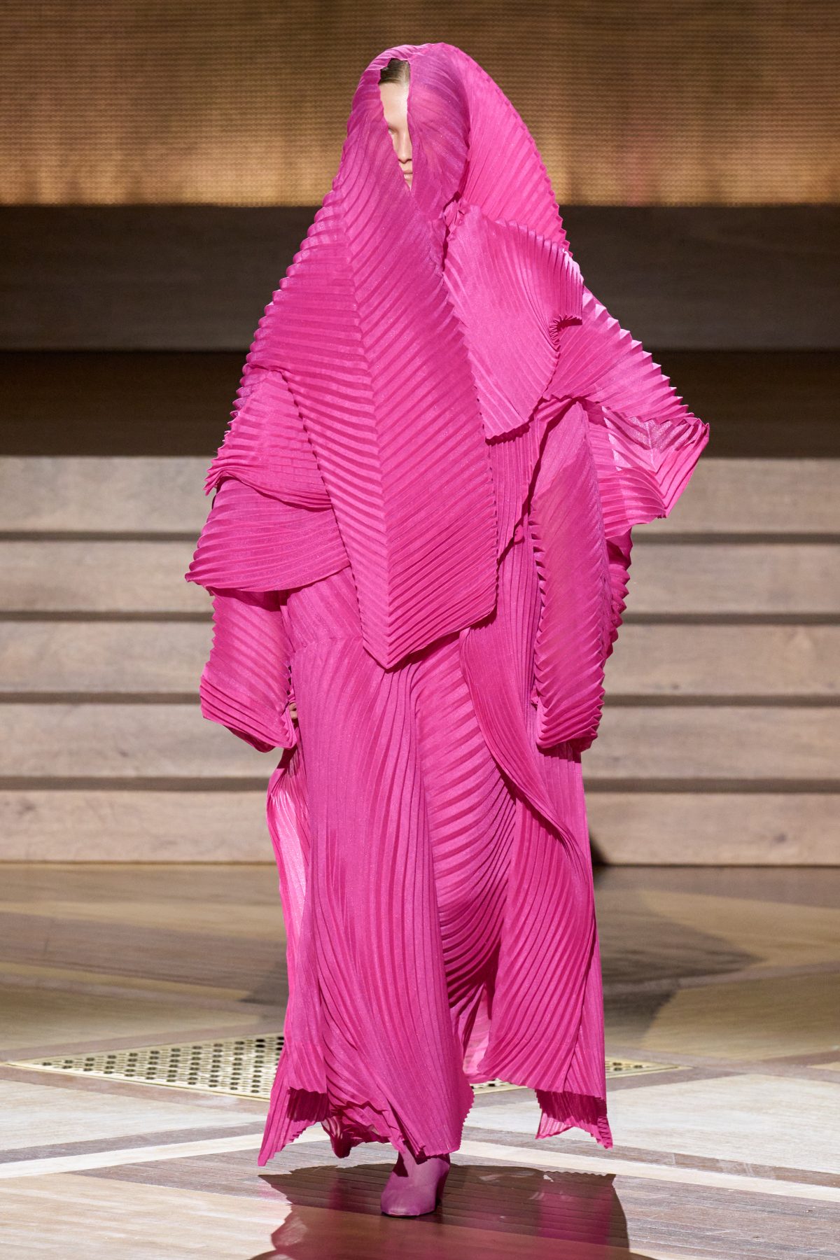 2024秋冬系列時裝騷在這幢法國移民歷史博物館的建築中舉行,背後是壯觀迷人的壁畫裝飾,擁有悠久歷史和故事。在這裏,創意總監近藤悟史(Satoshi Kondo)及設計團隊將Issey Miyake新系列名為“What Has Always Been”,探討衣服的本質。開場的幾個造型中,從腳踝到手臂如長出花蕾——布料似乎自發地由身體延長出去,彷彿衣服在穿着者身上肆意生長。