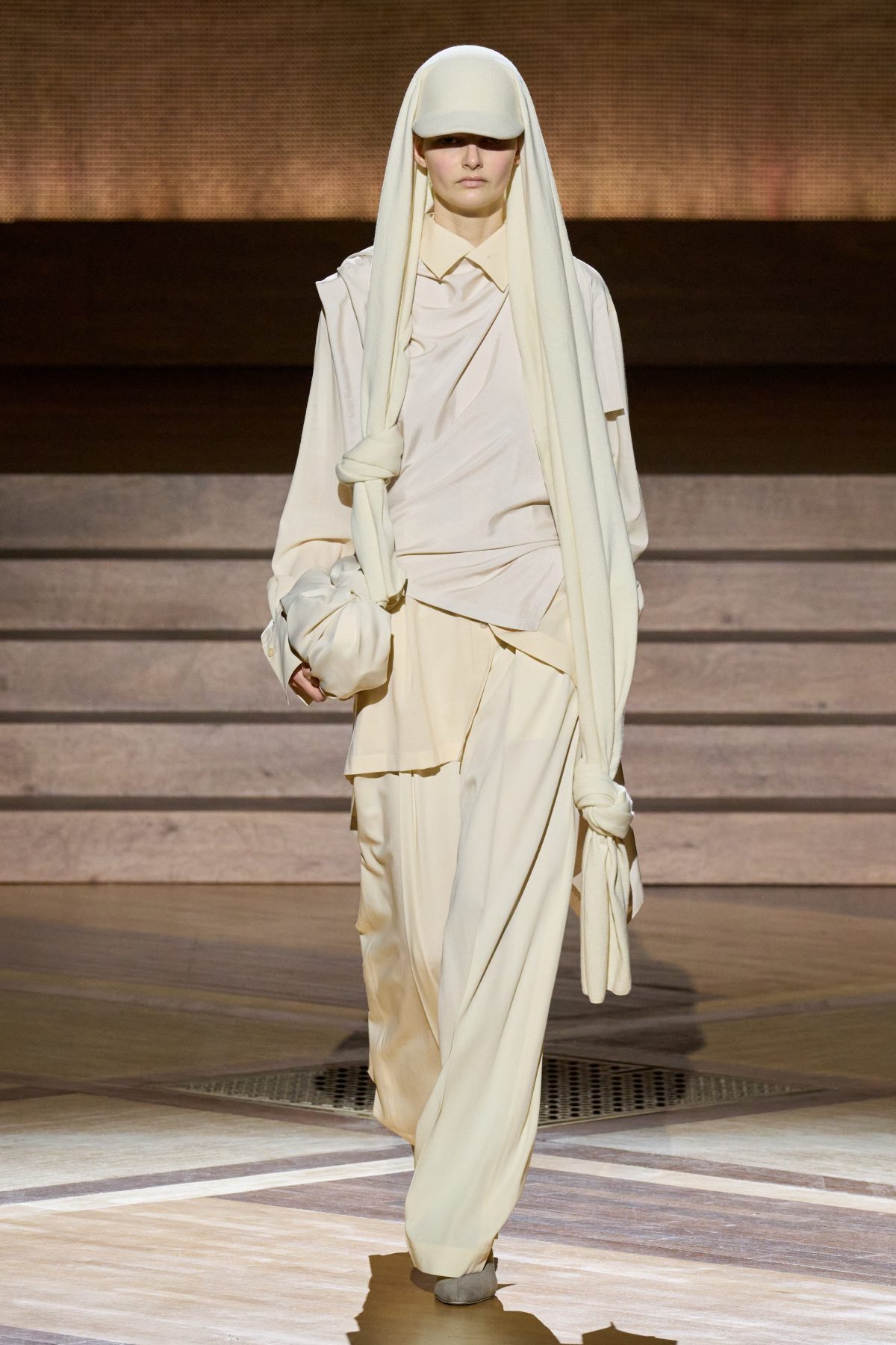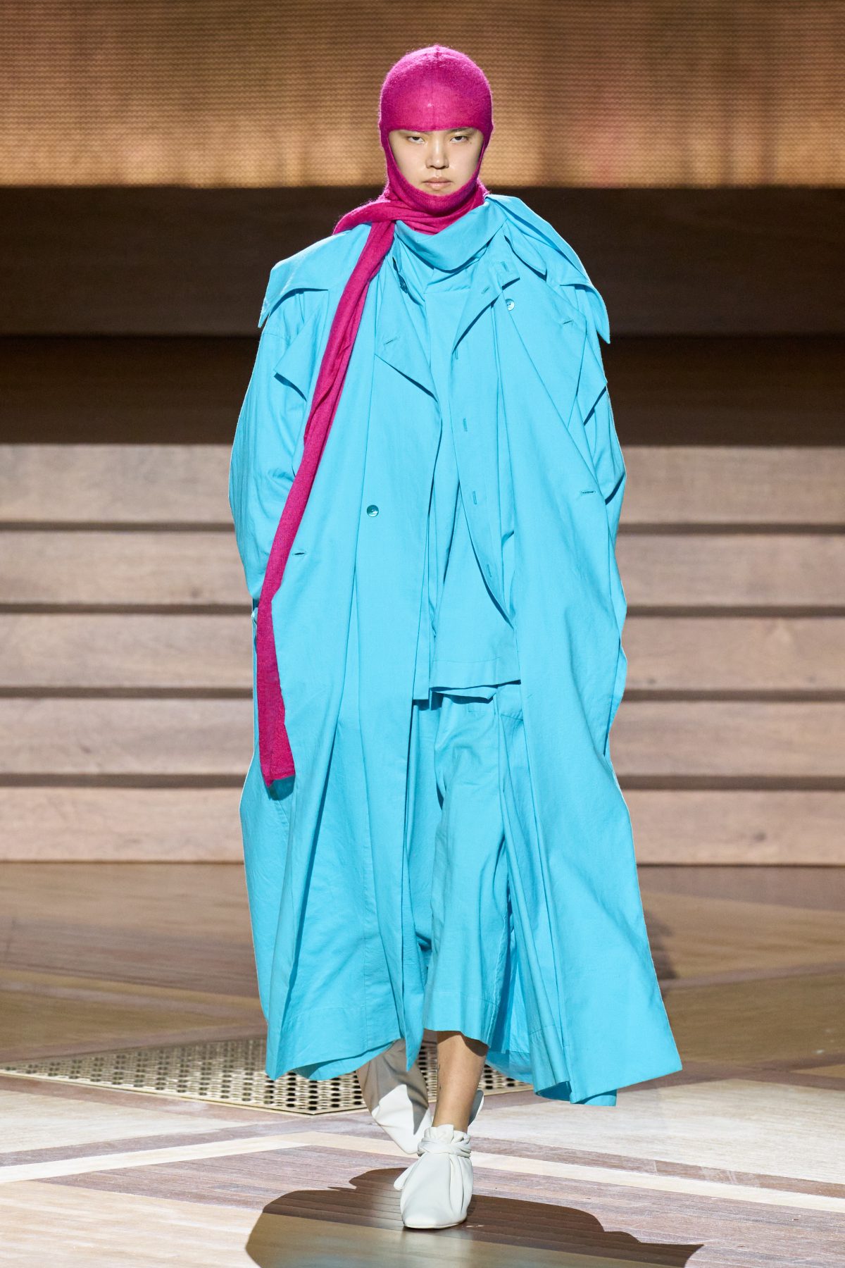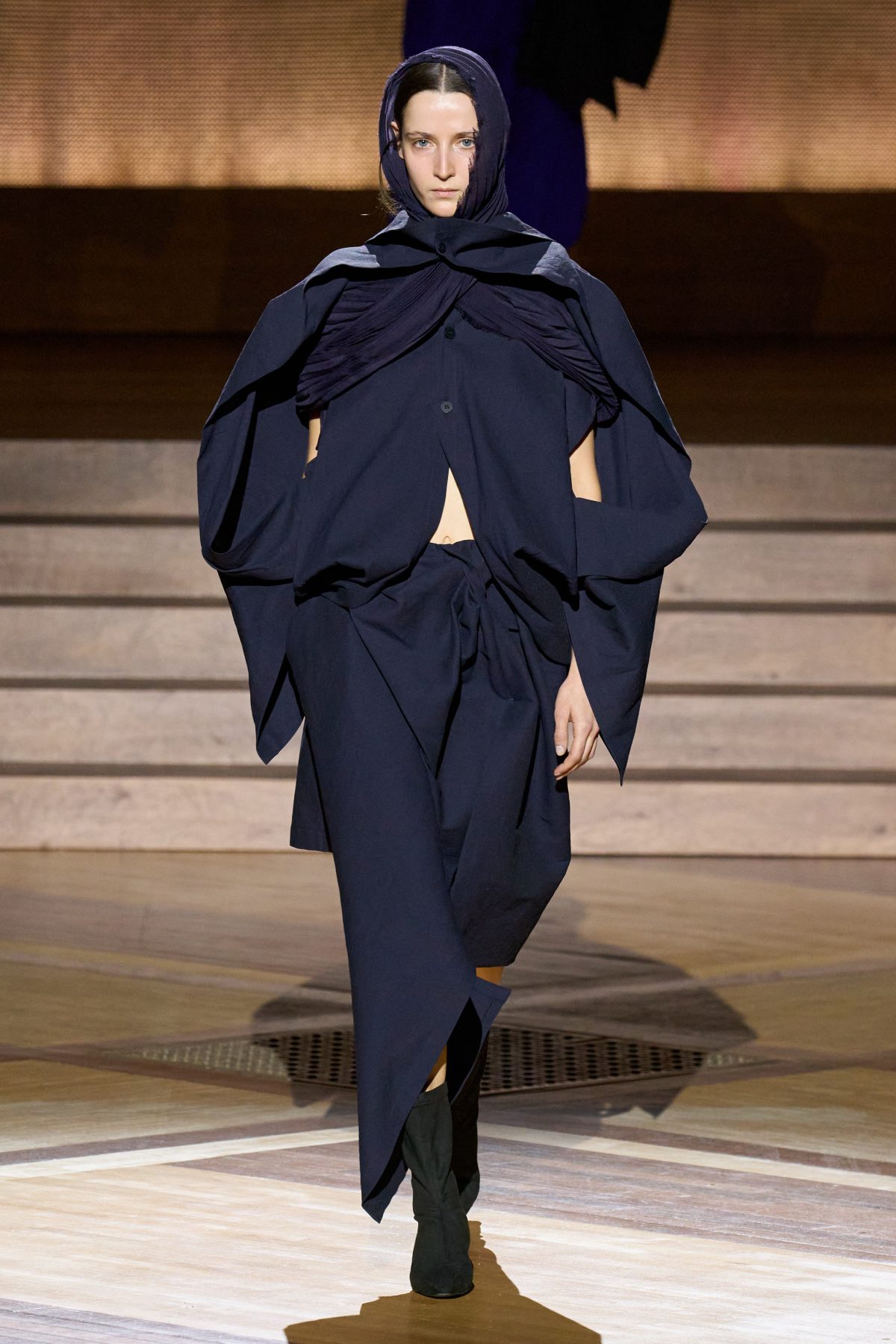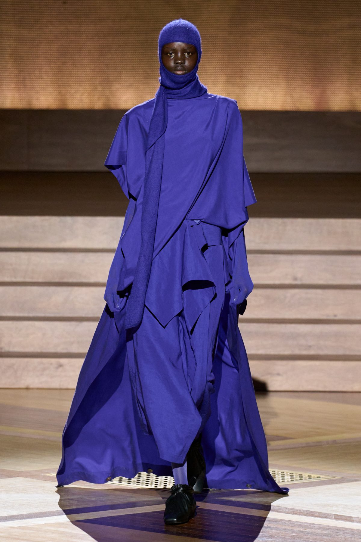 方形剪裁的衣服,布料堆疊或懸垂於身旁,賦予原始、無加工氣息。面料總是充滿神奇與詩意,披掛在頭巾上方的帽簷面罩會產生一種浪漫的遊牧氣息,末尾色彩鮮豔的垂褶造型更引發聯想,更有自我保護的意味,想像石器時代的人類在編織出現之前用皮膚和毛皮包裹自己一樣。