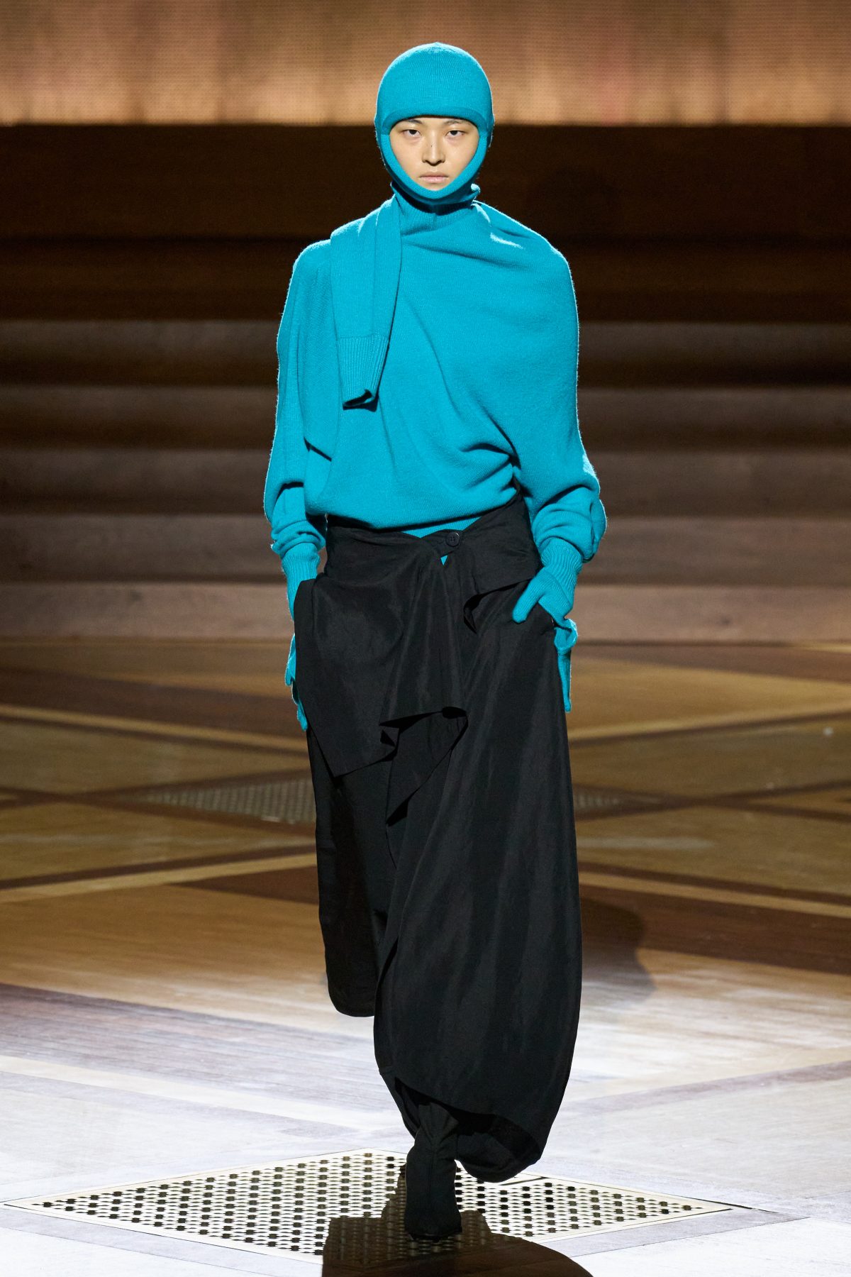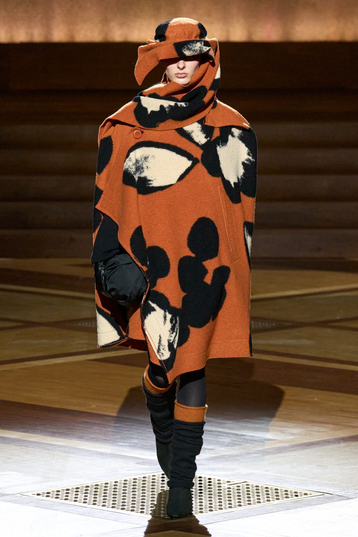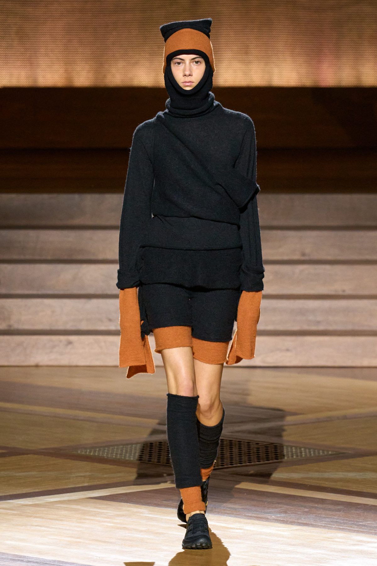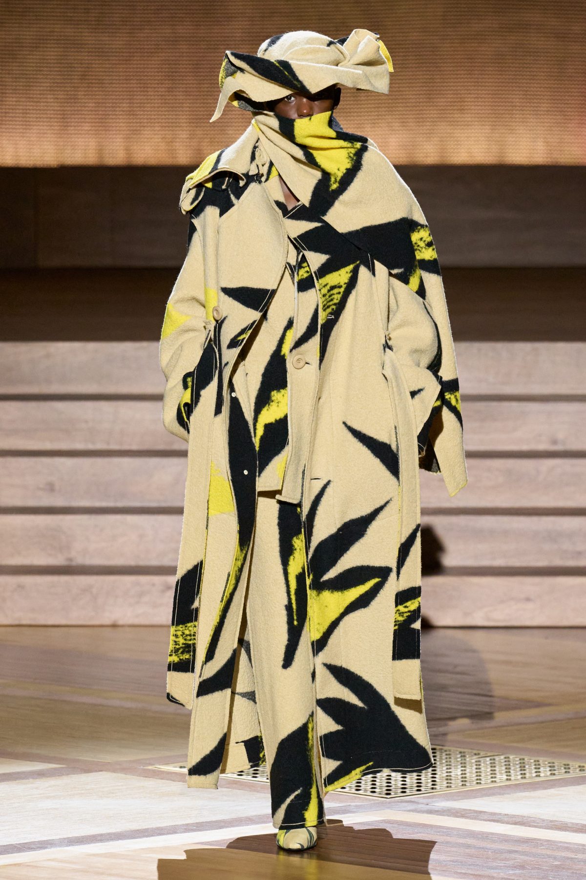 方形剪裁的衣服,布料堆疊或懸垂於身旁,賦予原始、無加工氣息。面料總是充滿神奇與詩意,披掛在頭巾上方的帽簷面罩會產生一種浪漫的遊牧氣息,末尾色彩鮮豔的垂褶造型更引發聯想,更有自我保護的意味,想像石器時代的人類在編織出現之前用皮膚和毛皮包裹自己一樣。