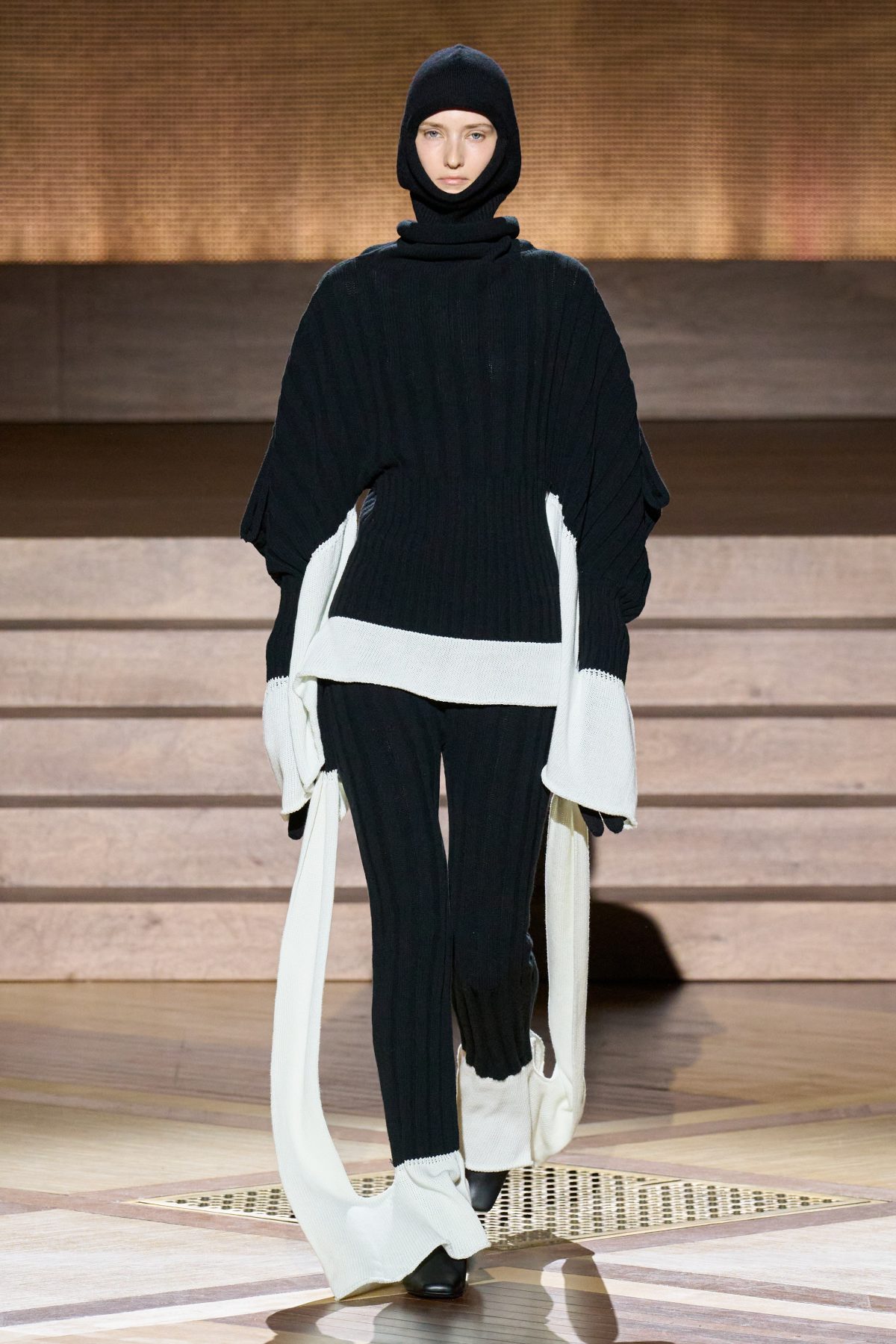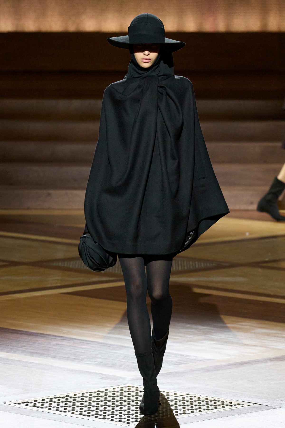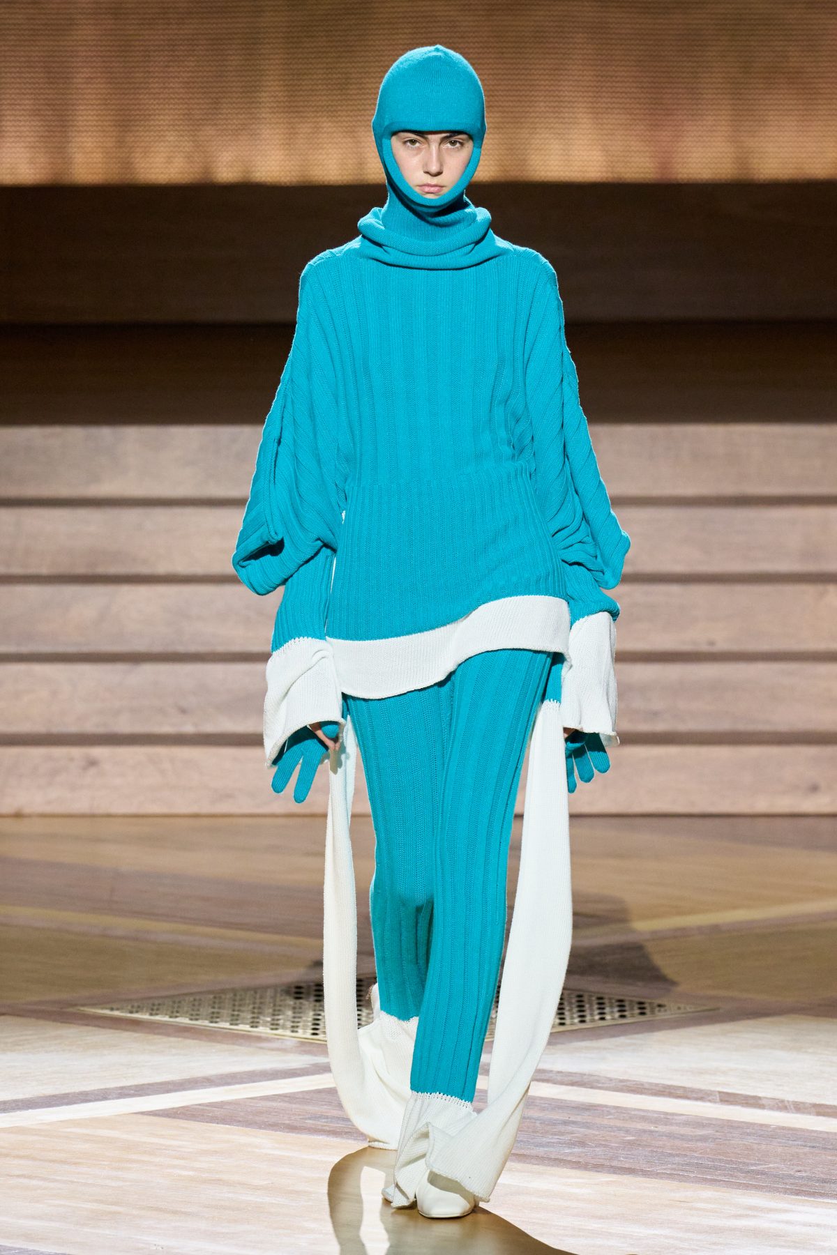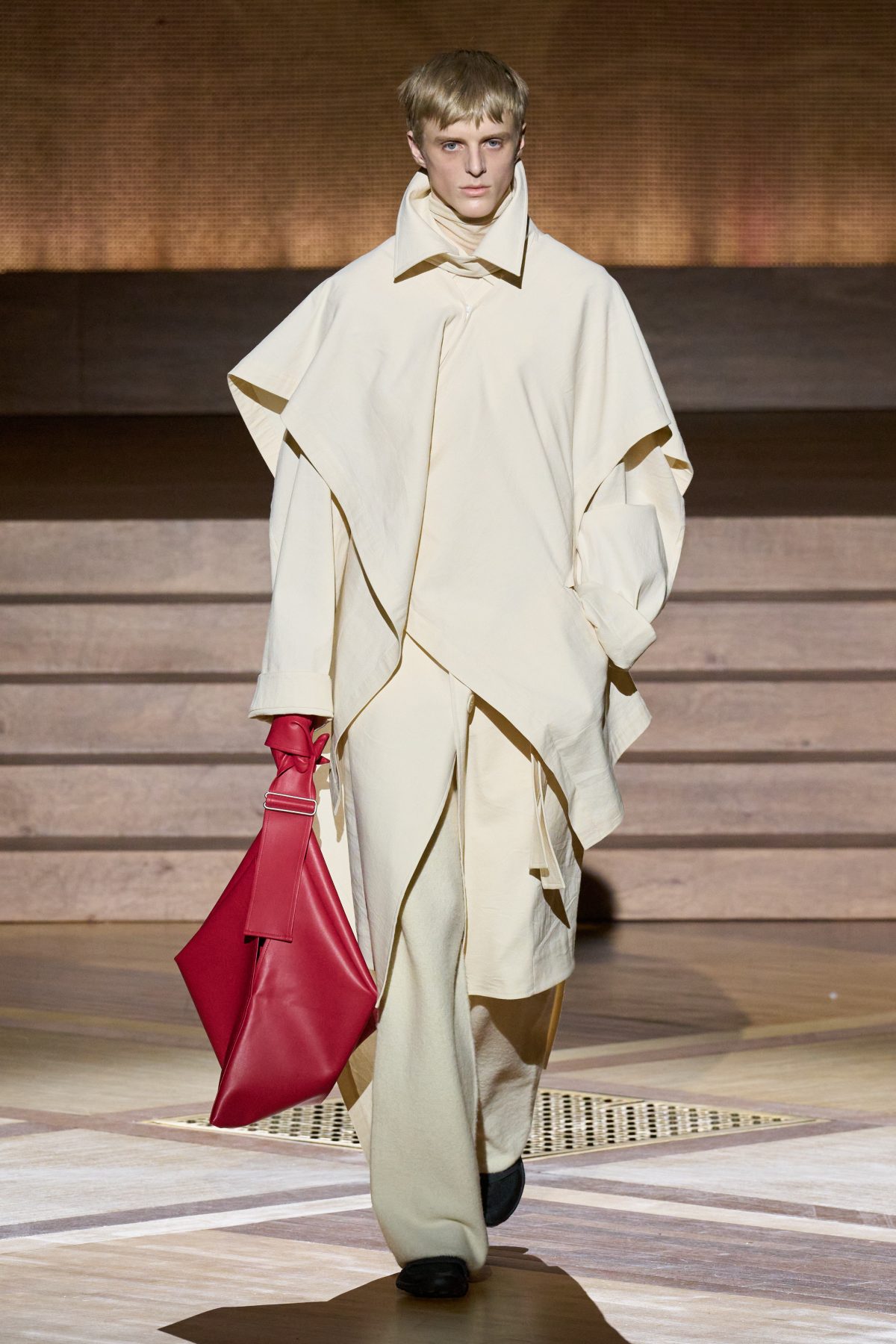 方形剪裁的衣服,布料堆疊或懸垂於身旁,賦予原始、無加工氣息。面料總是充滿神奇與詩意,披掛在頭巾上方的帽簷面罩會產生一種浪漫的遊牧氣息,末尾色彩鮮豔的垂褶造型更引發聯想,更有自我保護的意味,想像石器時代的人類在編織出現之前用皮膚和毛皮包裹自己一樣。