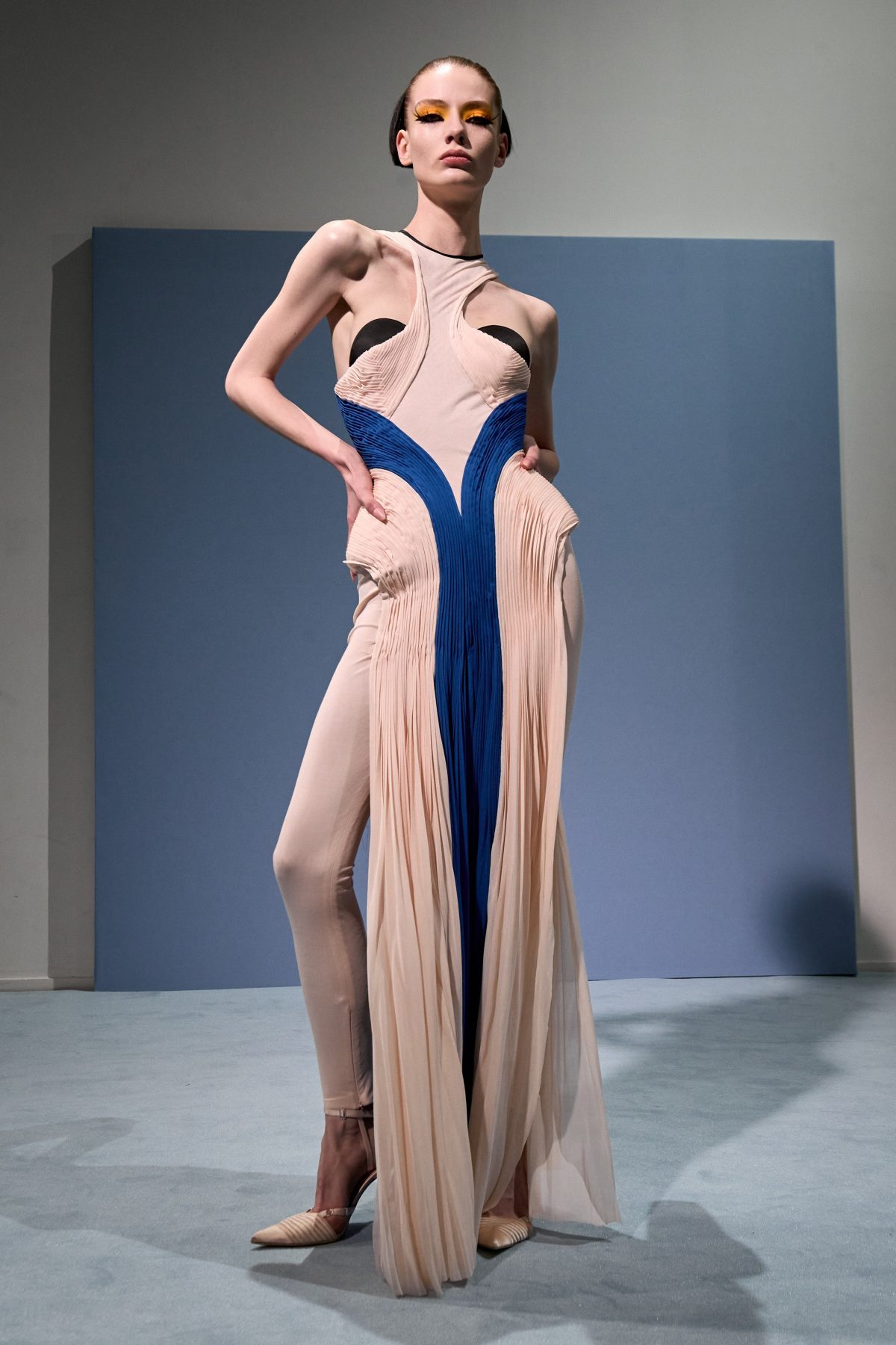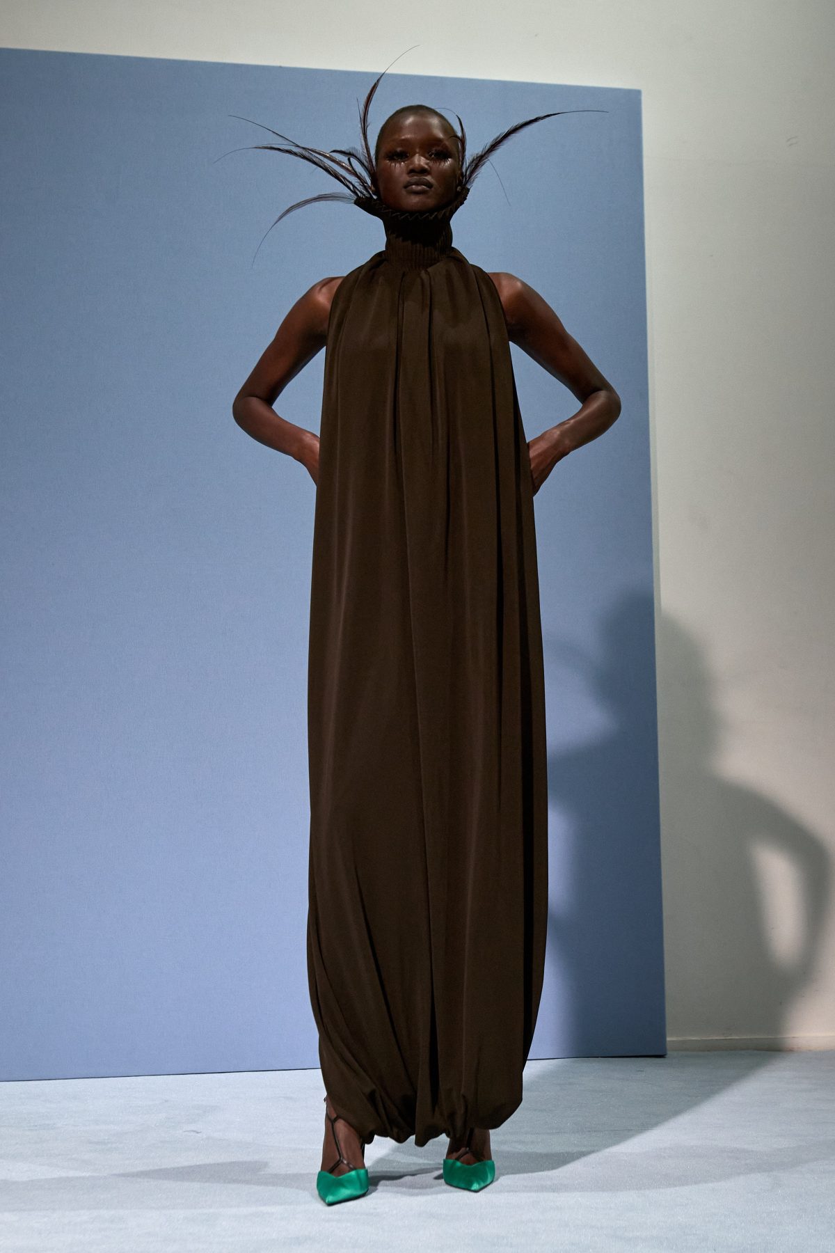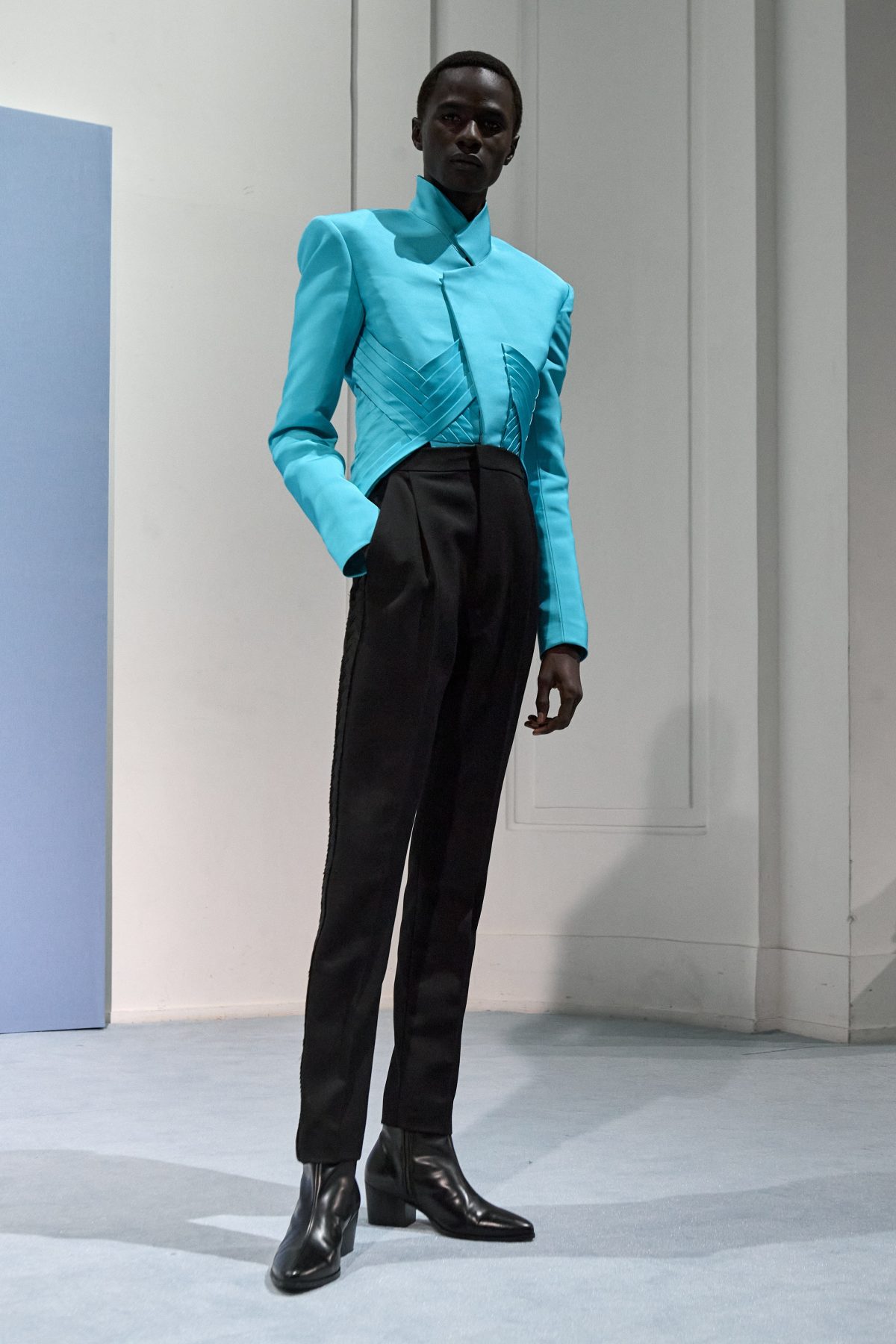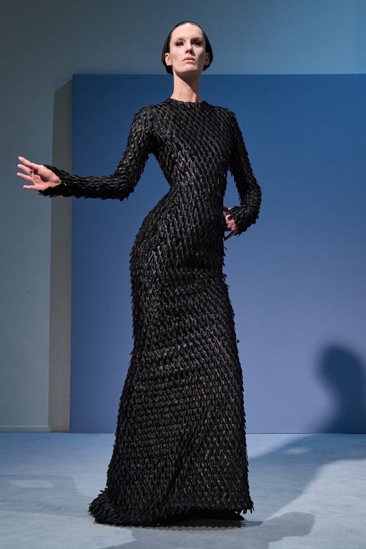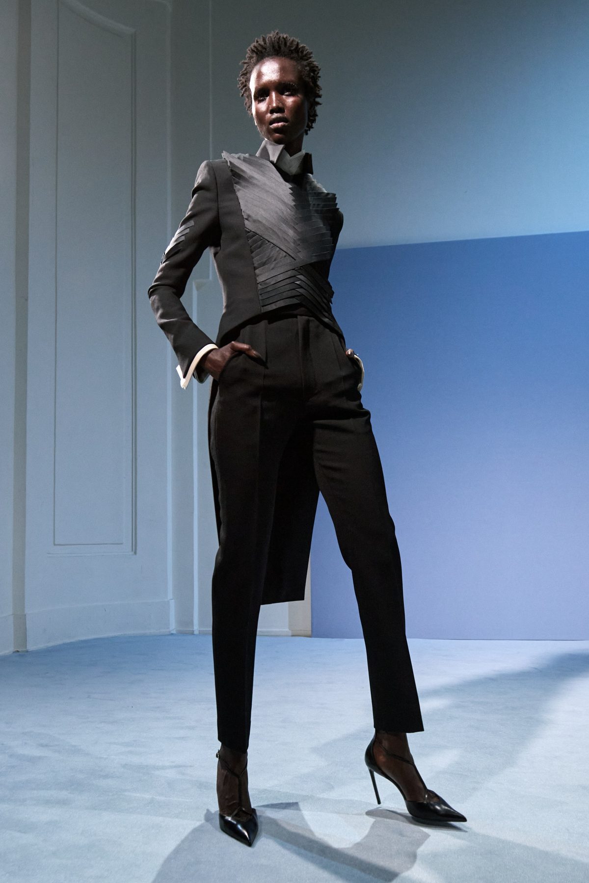 在全新高訂系列,Haider Ackermann 以自己的方式向 Haider Ackermann 致敬,他減少慣常使用絲綢與絲絨等飄逸的用料,反而將西裝元素、緞面的錐形胸衣、進行全新詮釋,同時透過立體羽毛配飾、手工褶皺與硬身廓形設計,不斷的拆解與組合,最終透過服裝展現女性既可優雅,又能硬朗的多變力量。模特兒的妝容同樣是焦點之一,把髮型「方塊」置於後腦的延長線,打造出超光滑具建築風格的髮髻,而在流暢的線條之間,髮型喚起了九十年代的沙龍時尚,是那樣迷人且具韻味。我們常說美好的時尚年代已經回不去,不過從這次的時裝展中,美好的歲月又再一次映在大眾眼前。