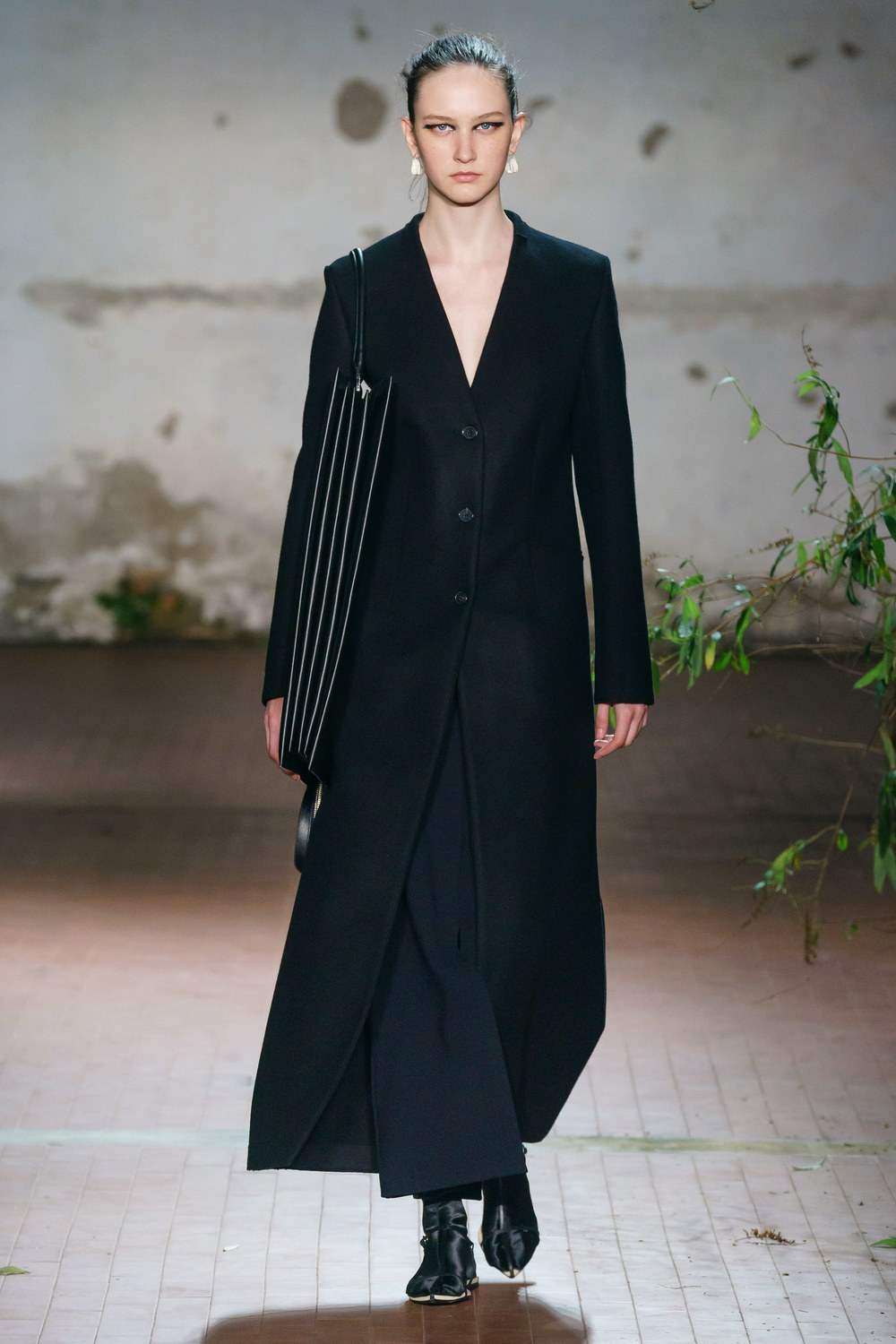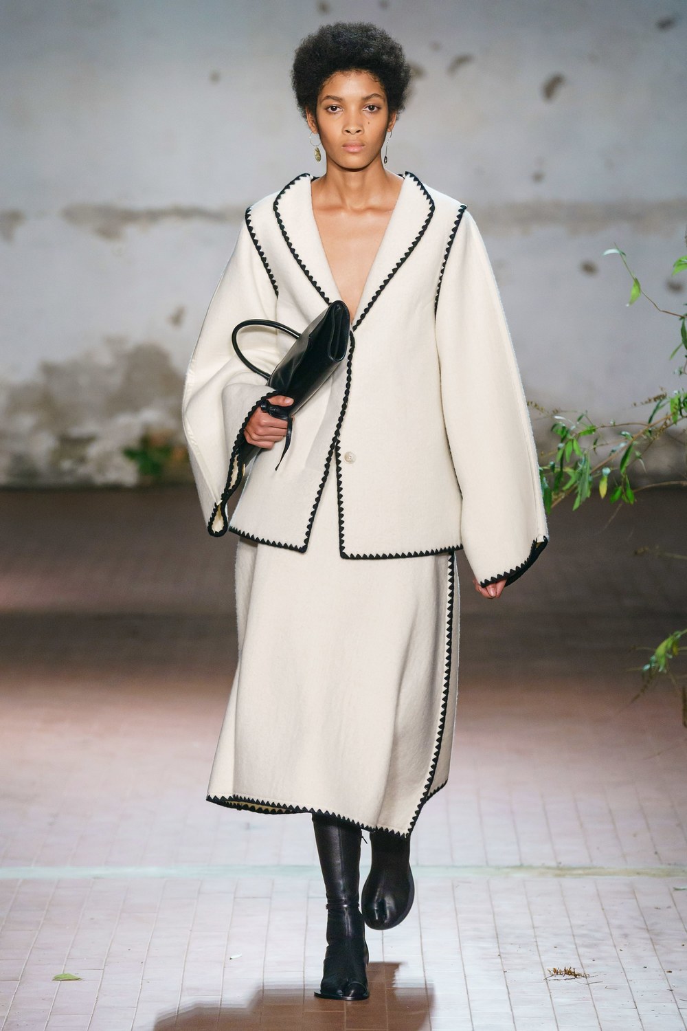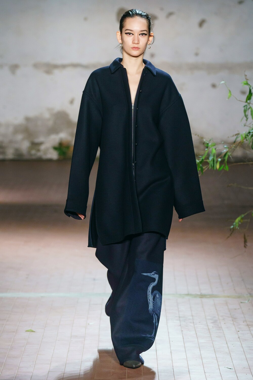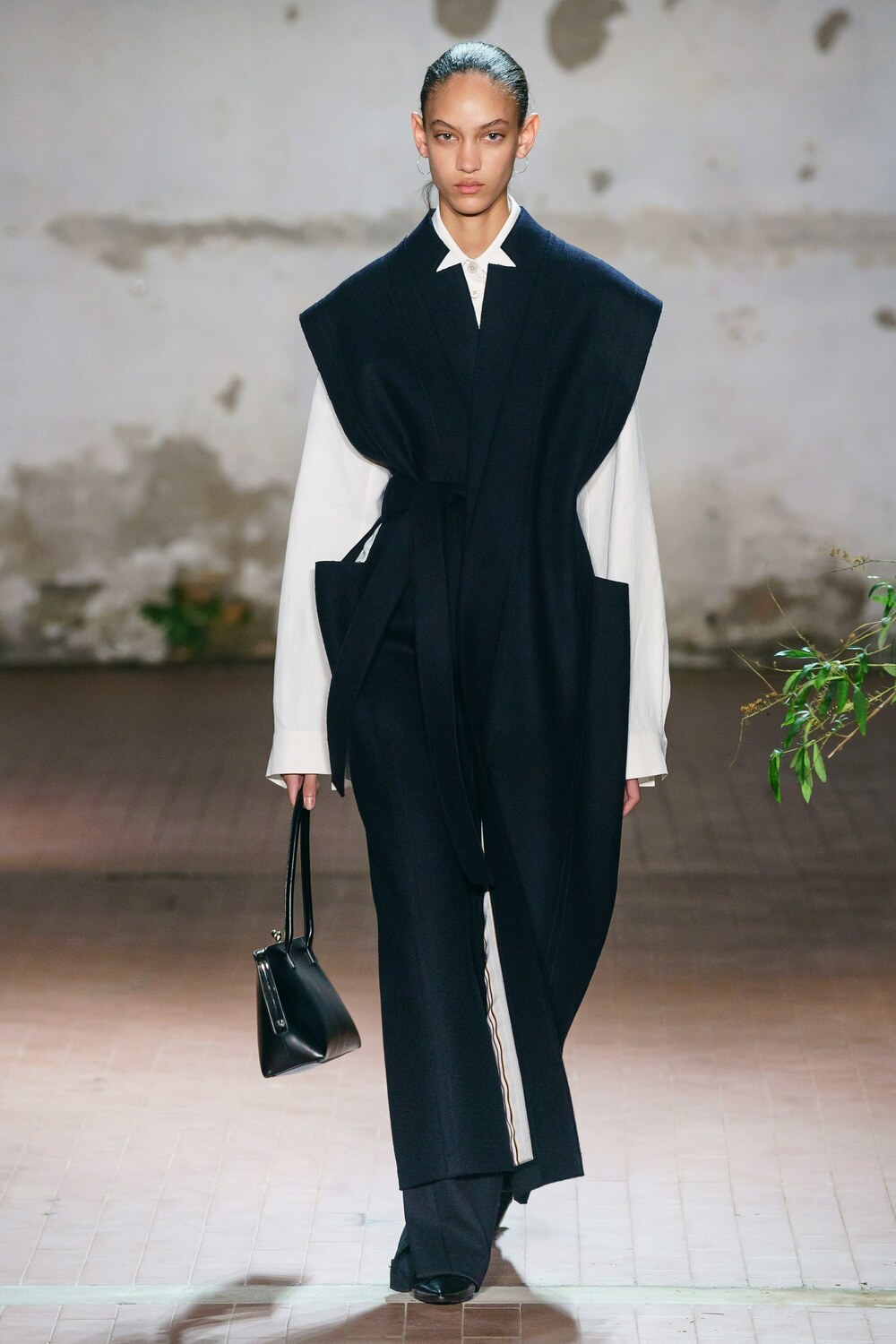 「這就是細膩的女性形象。」Lucy Meier 在後台解釋系列的出發點,是為了尋覓女性化線條與男性化的物料,例如㦸絨及日本羊毛等之間的對比。保留物料的質感一直是他們作品的關鍵,藉此 Meiers 利用自己的設計語言隨心的表現出寬衣解帶的美感。「我們嘗試展現更多的皮膚部分。」這便是 Lucy 所強調系列中的低領線和緊身胸衣剪裁。「我們直覺想營造飄逸和輕盈的感覺。」系列有輕鬆的氛圍卻少了設計師口中所提及的皮膚部分,皮膚外的服飾仍是 Meiers 示範雕琢技巧的拿手好戲。「我們將身體的輪廓推向極致,流露出冬日裏所塑造的輕盈感。」Luke 為系列勻稱偏大的包裹形態作註解。