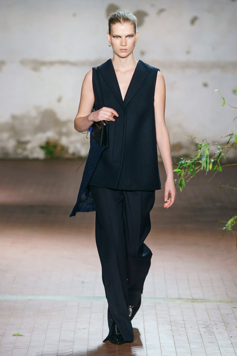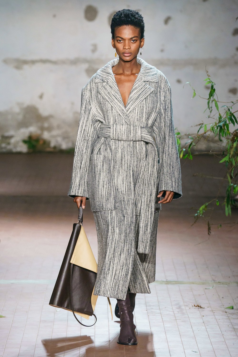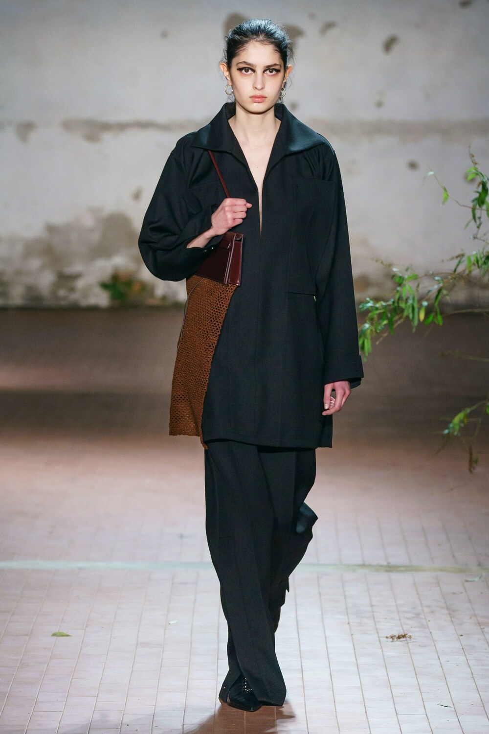 「這就是細膩的女性形象。」Lucy Meier 在後台解釋系列的出發點,是為了尋覓女性化線條與男性化的物料,例如㦸絨及日本羊毛等之間的對比。保留物料的質感一直是他們作品的關鍵,藉此 Meiers 利用自己的設計語言隨心的表現出寬衣解帶的美感。「我們嘗試展現更多的皮膚部分。」這便是 Lucy 所強調系列中的低領線和緊身胸衣剪裁。「我們直覺想營造飄逸和輕盈的感覺。」系列有輕鬆的氛圍卻少了設計師口中所提及的皮膚部分,皮膚外的服飾仍是 Meiers 示範雕琢技巧的拿手好戲。「我們將身體的輪廓推向極致,流露出冬日裏所塑造的輕盈感。」Luke 為系列勻稱偏大的包裹形態作註解。