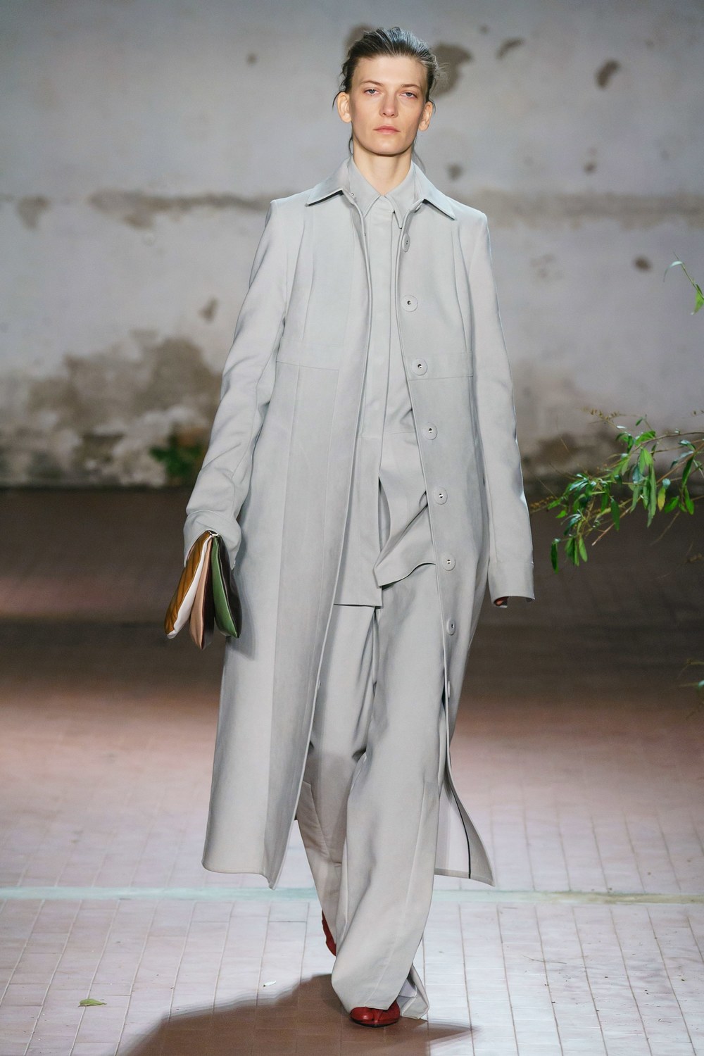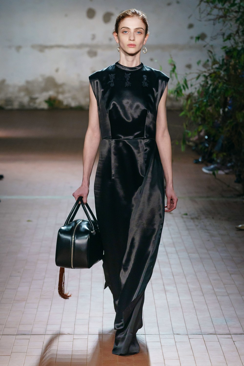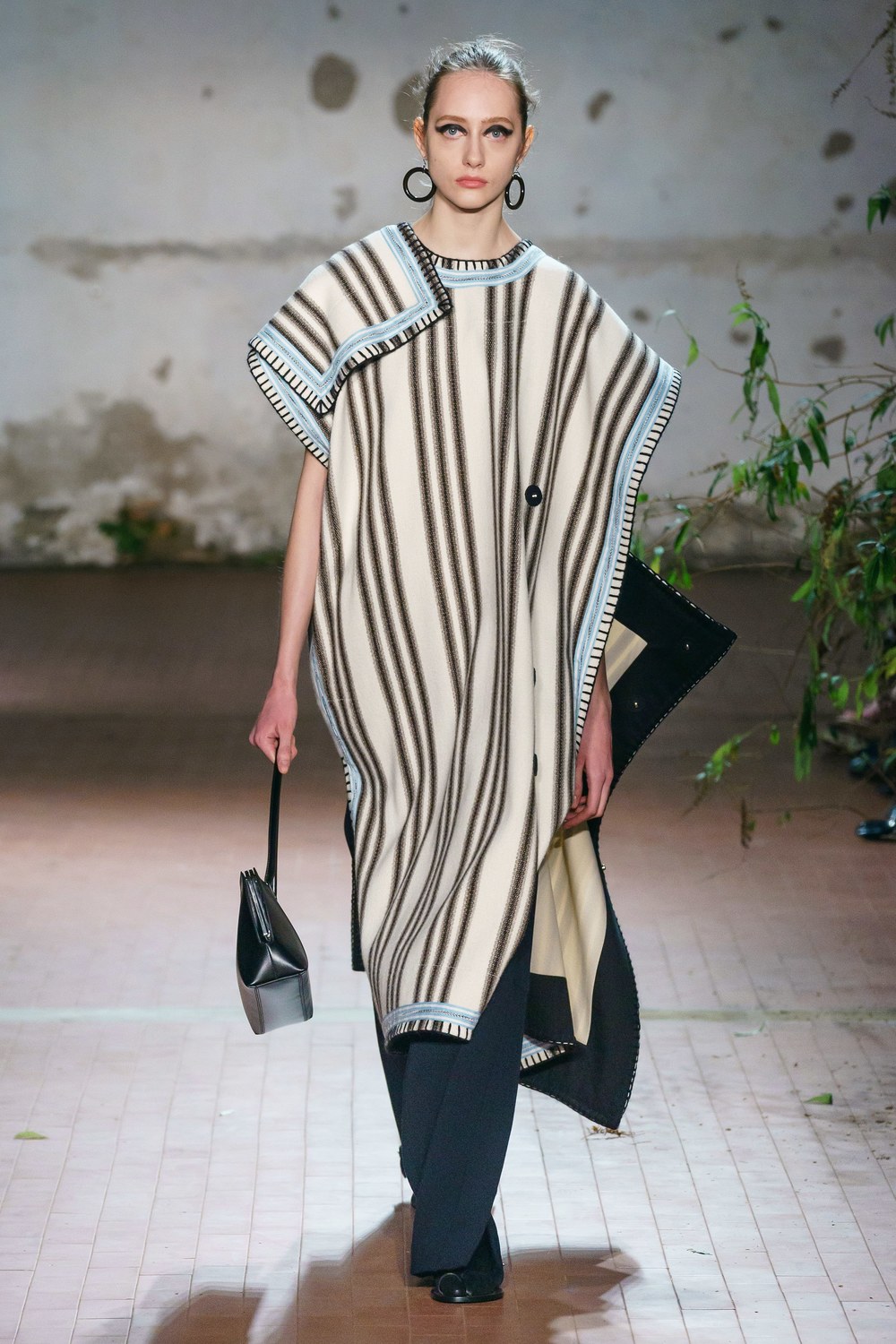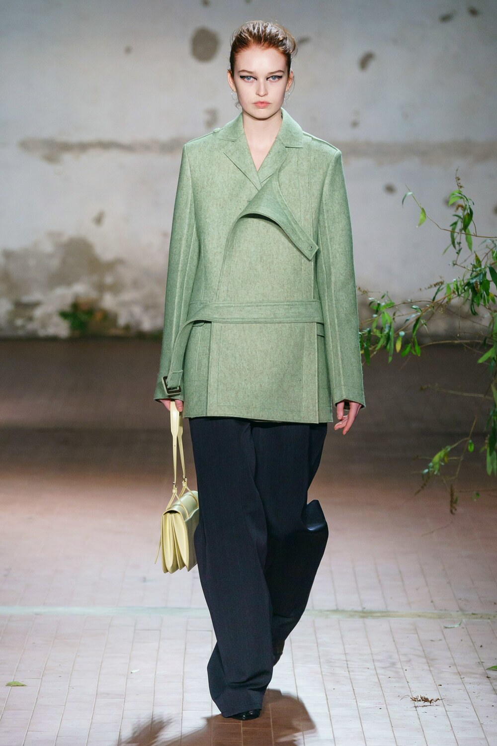 「這就是細膩的女性形象。」Lucy Meier 在後台解釋系列的出發點,是為了尋覓女性化線條與男性化的物料,例如㦸絨及日本羊毛等之間的對比。保留物料的質感一直是他們作品的關鍵,藉此 Meiers 利用自己的設計語言隨心的表現出寬衣解帶的美感。「我們嘗試展現更多的皮膚部分。」這便是 Lucy 所強調系列中的低領線和緊身胸衣剪裁。「我們直覺想營造飄逸和輕盈的感覺。」系列有輕鬆的氛圍卻少了設計師口中所提及的皮膚部分,皮膚外的服飾仍是 Meiers 示範雕琢技巧的拿手好戲。「我們將身體的輪廓推向極致,流露出冬日裏所塑造的輕盈感。」Luke 為系列勻稱偏大的包裹形態作註解。