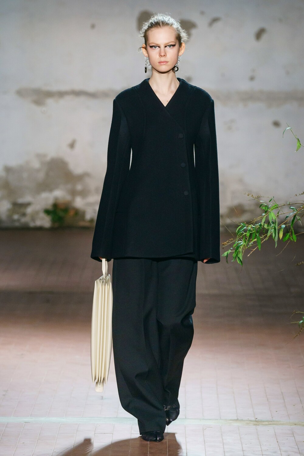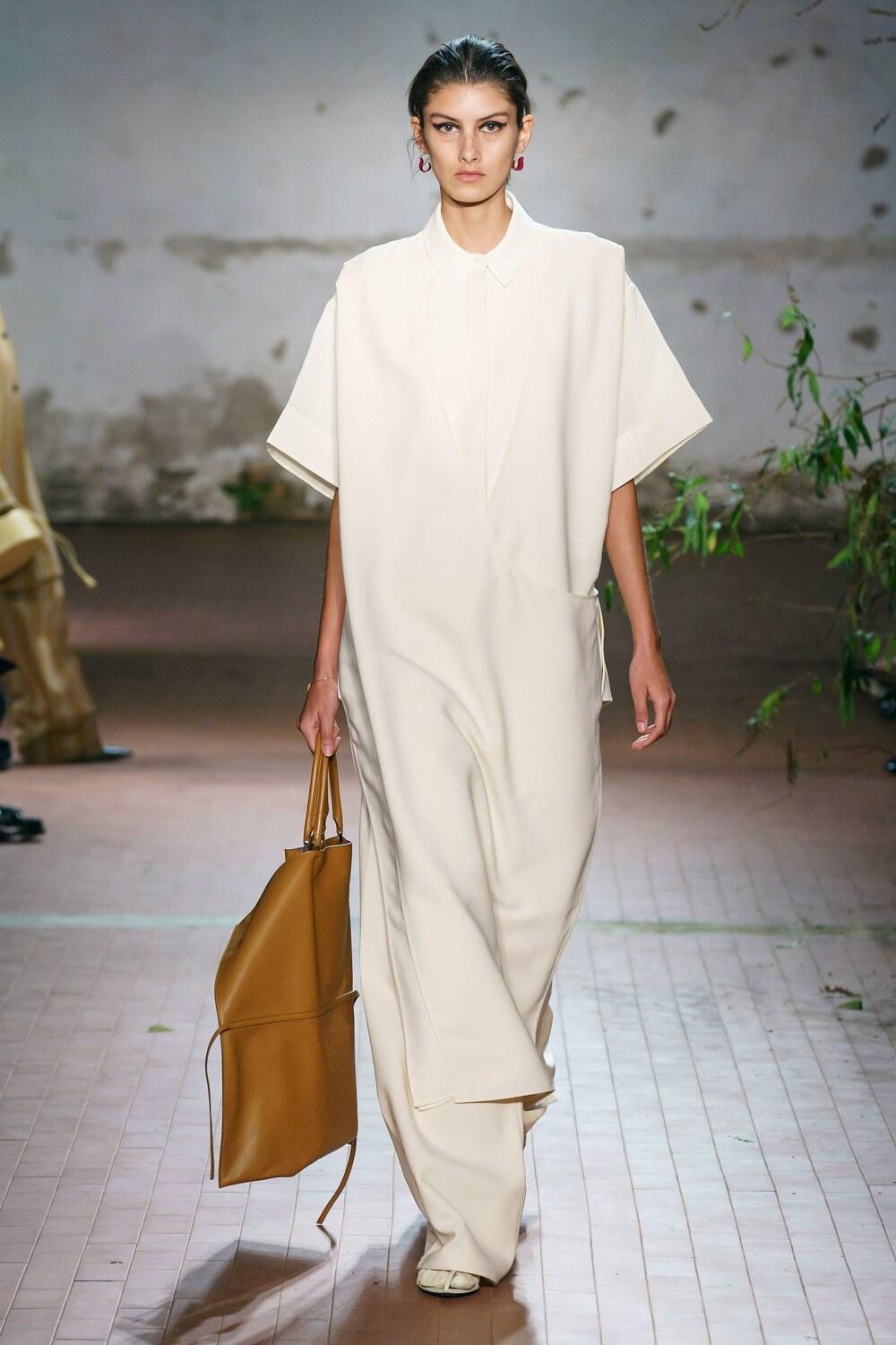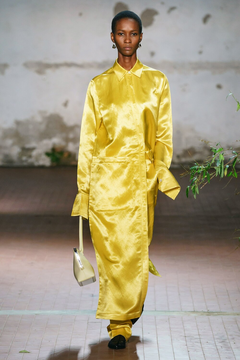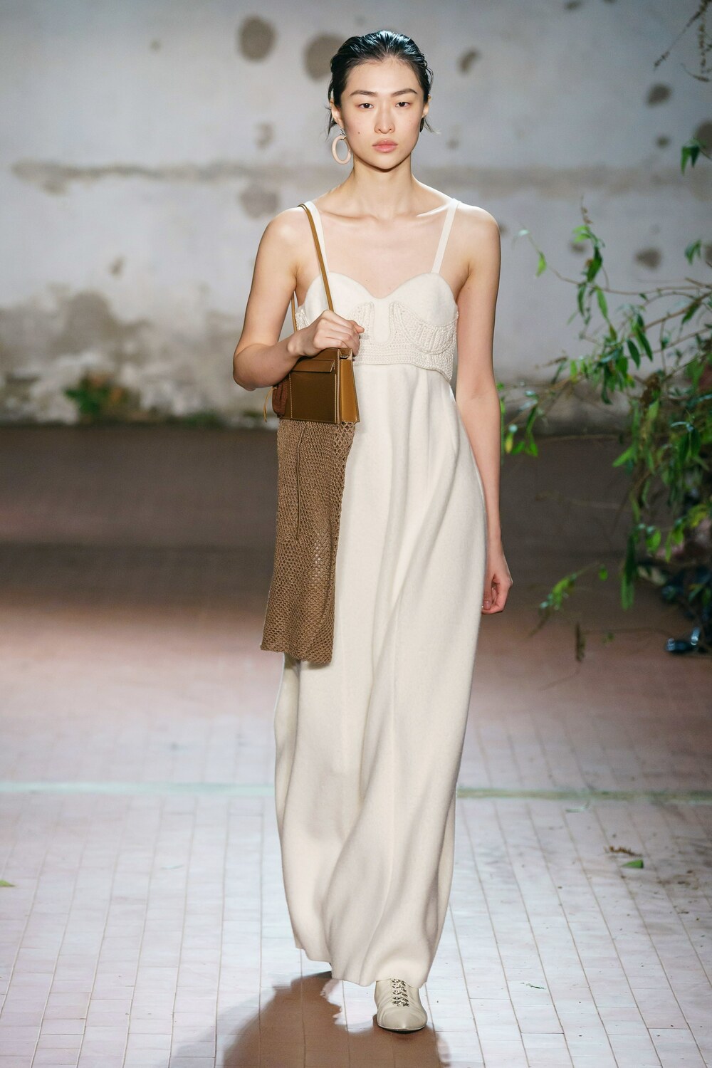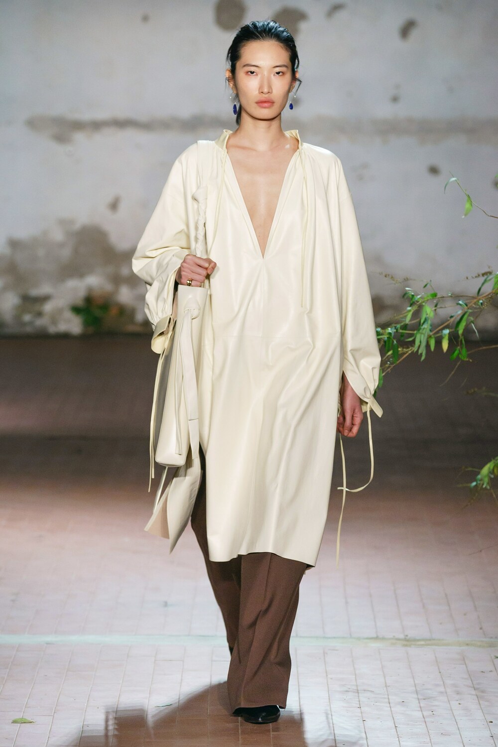 大提琴師拉動着弓,讓旋律填滿米蘭的星期三晚上。創作總監 Lucy Meier 和 Luke Meier 繼續雕琢他們自 2017 年起所建立的清晰輪廓及遊牧態度的美學風格。不同場地於時裝周往往都鑲嵌出天攘之別的系列風格。前幾季 Meiers 打造全景螢光白的天橋,品牌的長衫和拖地恤衫裙在皎白天幕下似是別樣沙漠上的服飾。今季他們則邀請大家到訪一個狹小而潮濕的車庫,瞬間氣氛截然換上另一種美感,而場地更似是一間藏於市外的別緻畫廊。