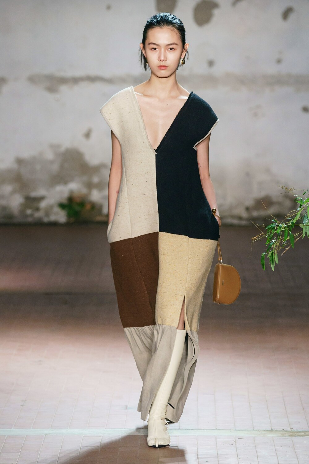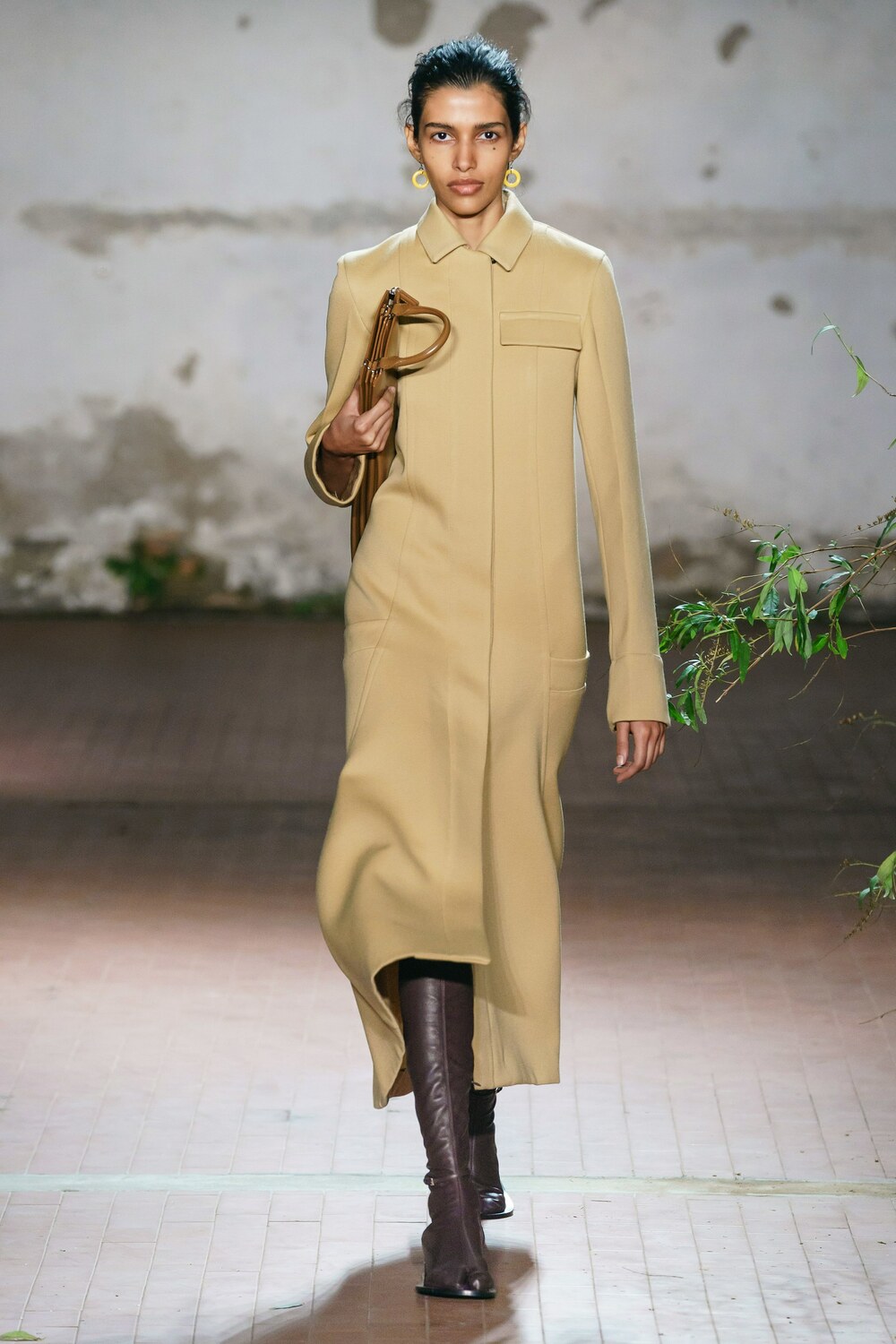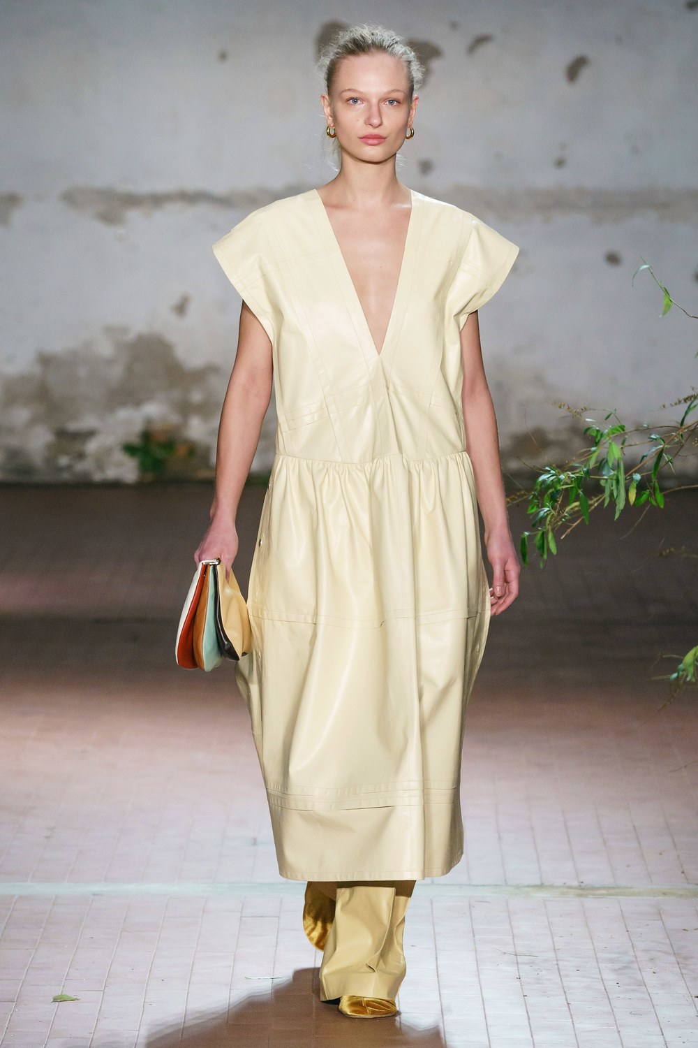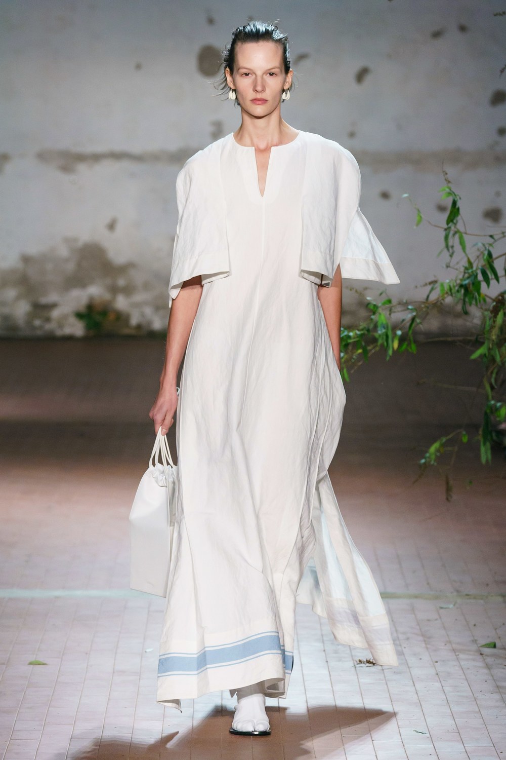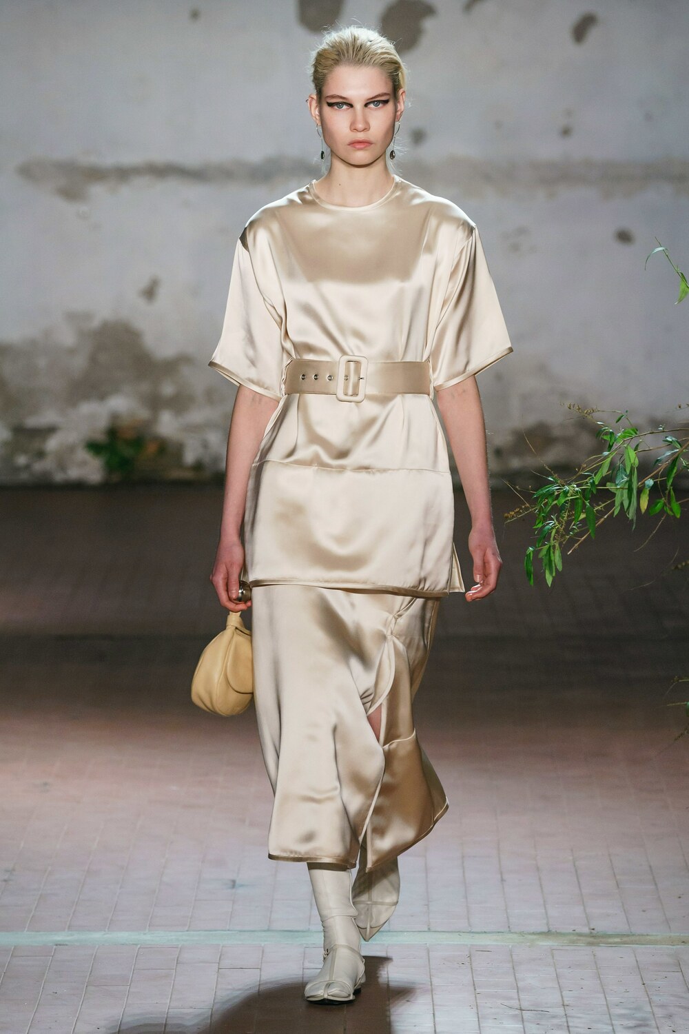 大提琴師拉動着弓,讓旋律填滿米蘭的星期三晚上。創作總監 Lucy Meier 和 Luke Meier 繼續雕琢他們自 2017 年起所建立的清晰輪廓及遊牧態度的美學風格。不同場地於時裝周往往都鑲嵌出天攘之別的系列風格。前幾季 Meiers 打造全景螢光白的天橋,品牌的長衫和拖地恤衫裙在皎白天幕下似是別樣沙漠上的服飾。今季他們則邀請大家到訪一個狹小而潮濕的車庫,瞬間氣氛截然換上另一種美感,而場地更似是一間藏於市外的別緻畫廊。