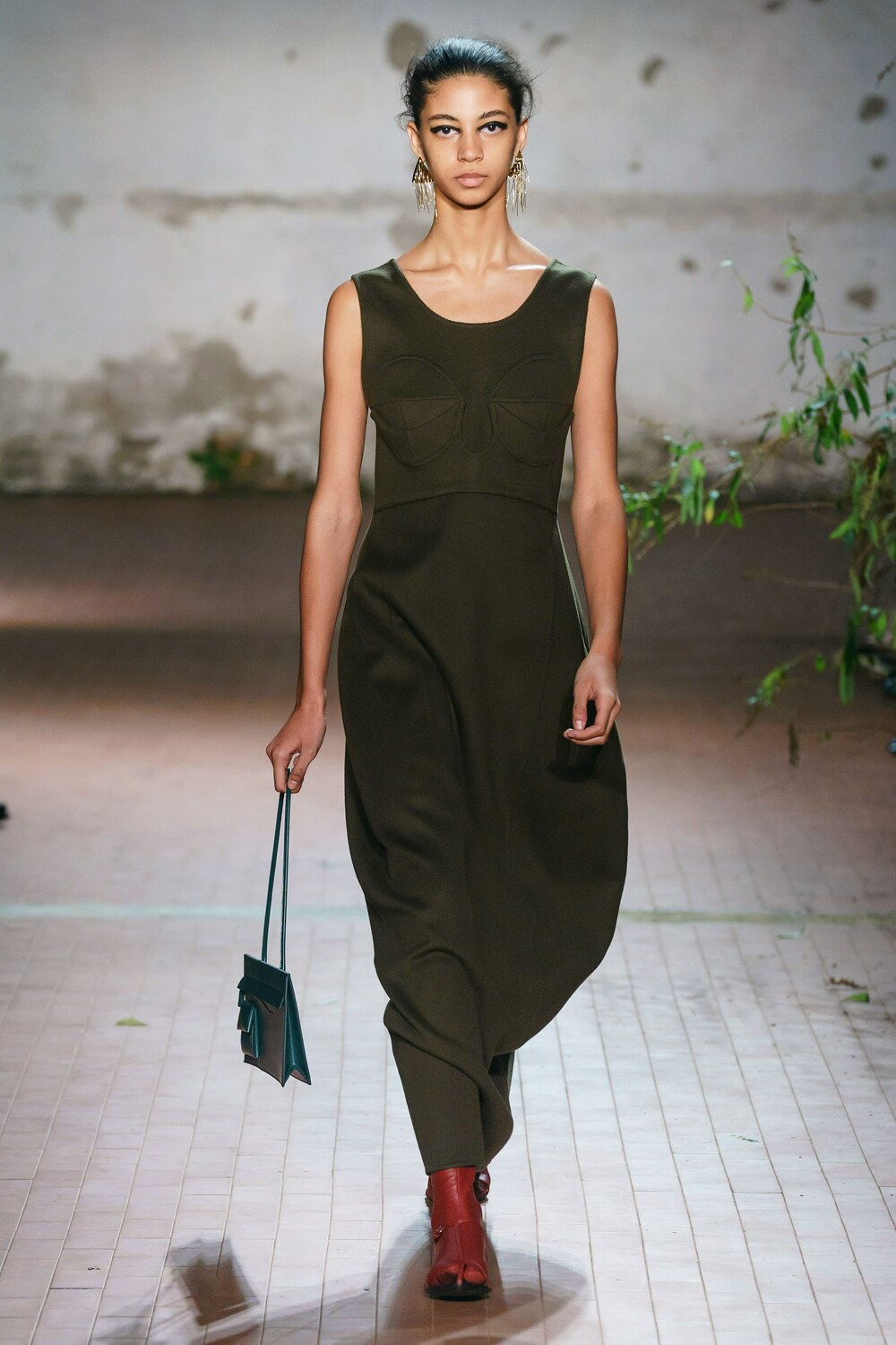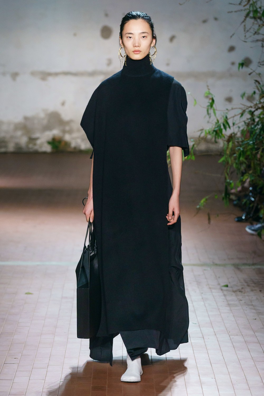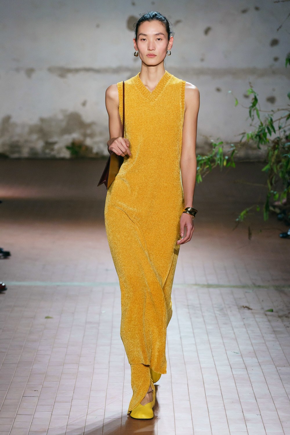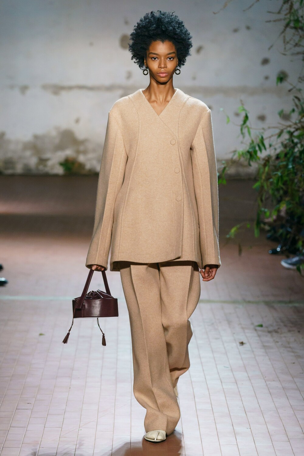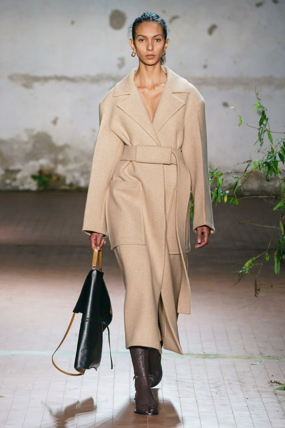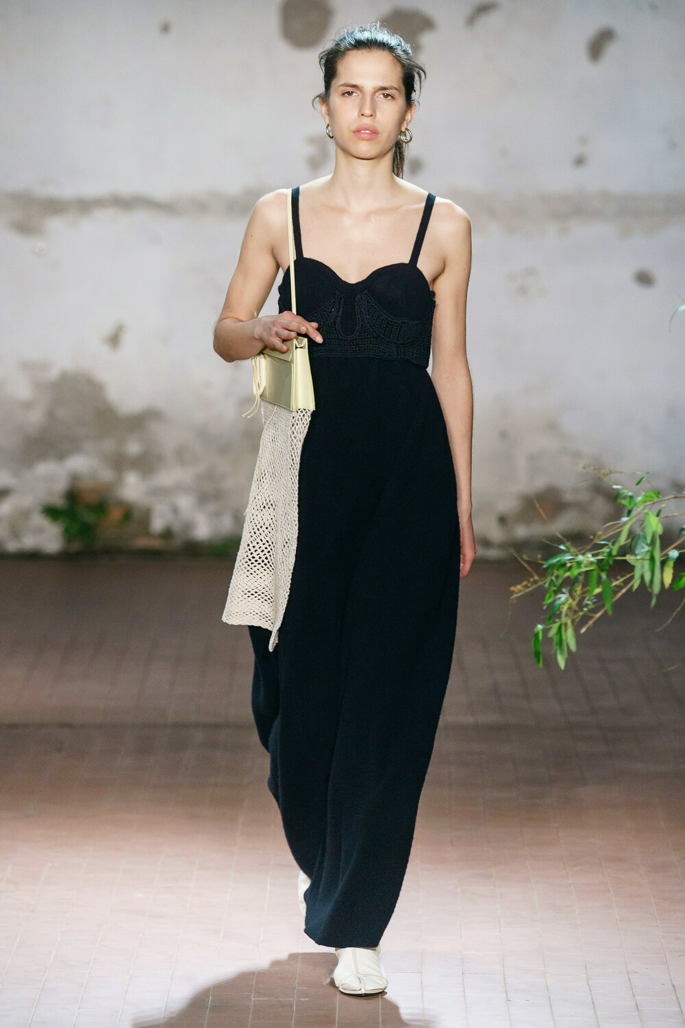 大提琴師拉動着弓,讓旋律填滿米蘭的星期三晚上。創作總監 Lucy Meier 和 Luke Meier 繼續雕琢他們自 2017 年起所建立的清晰輪廓及遊牧態度的美學風格。不同場地於時裝周往往都鑲嵌出天攘之別的系列風格。前幾季 Meiers 打造全景螢光白的天橋,品牌的長衫和拖地恤衫裙在皎白天幕下似是別樣沙漠上的服飾。今季他們則邀請大家到訪一個狹小而潮濕的車庫,瞬間氣氛截然換上另一種美感,而場地更似是一間藏於市外的別緻畫廊。