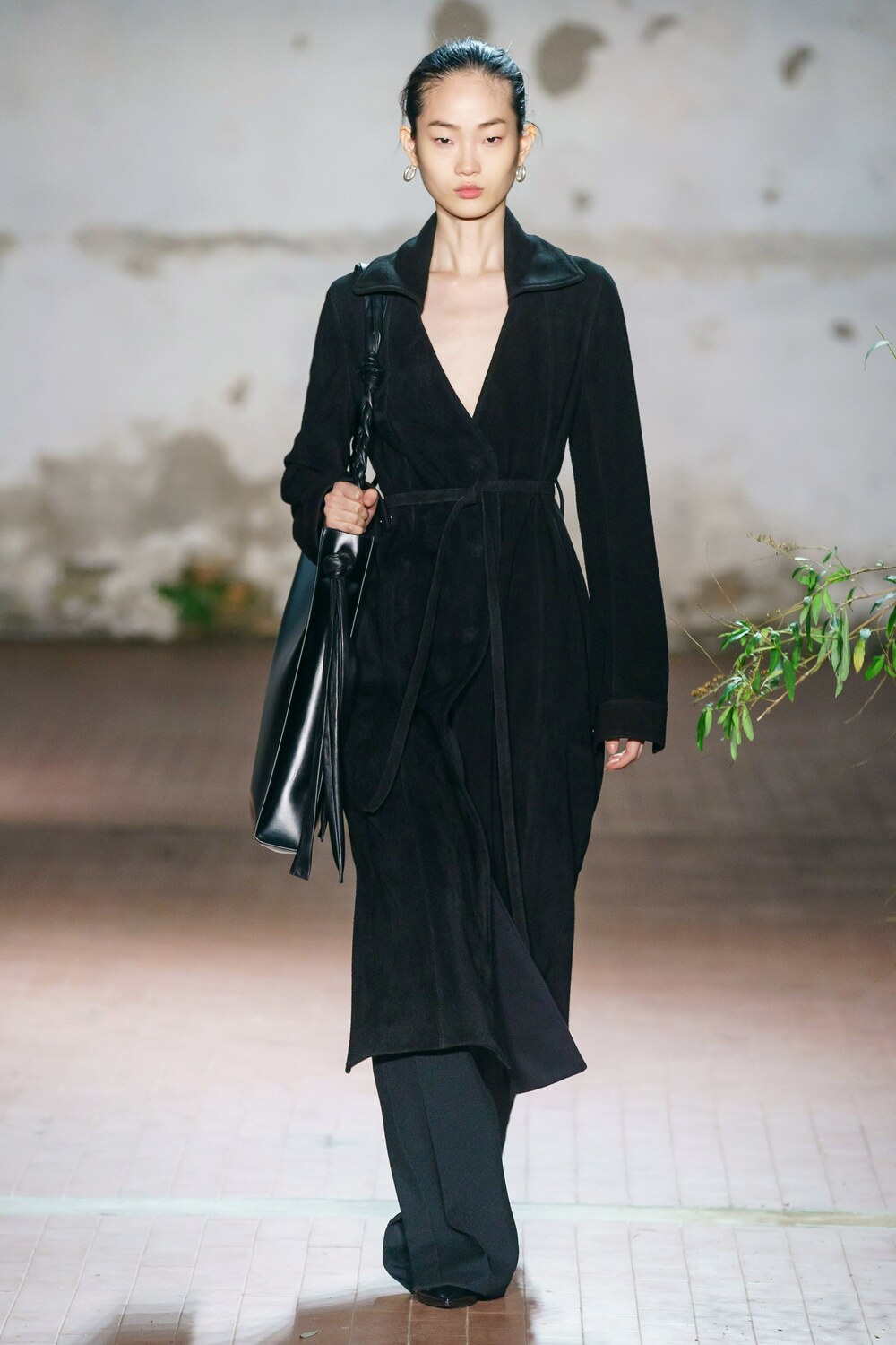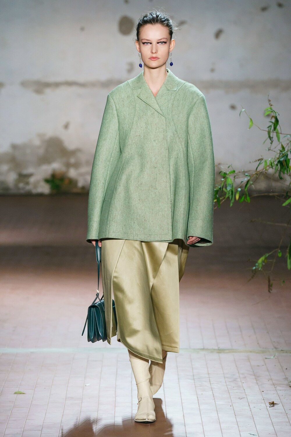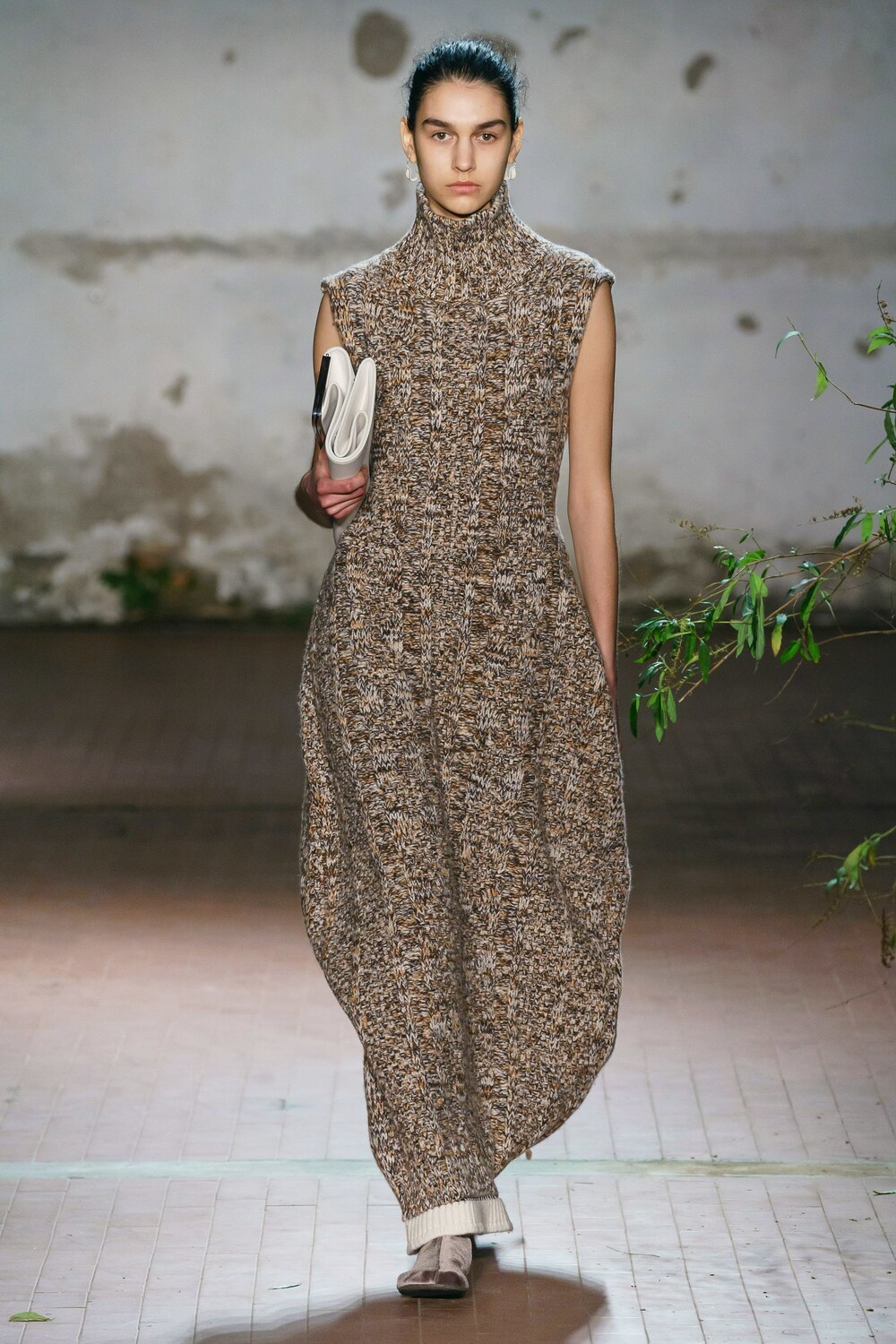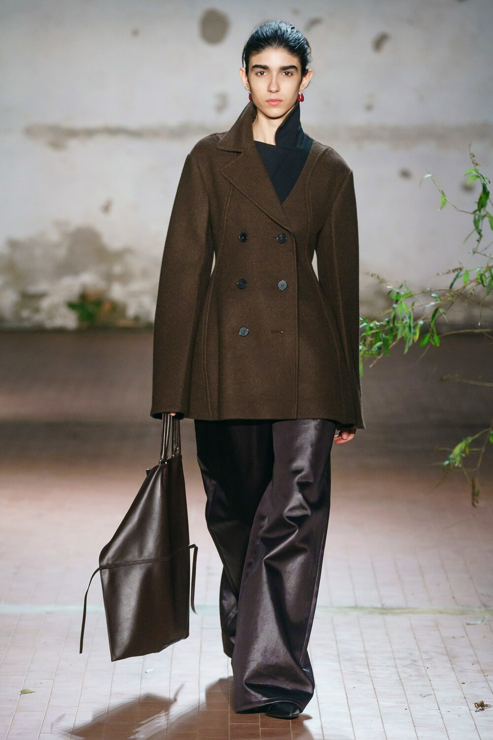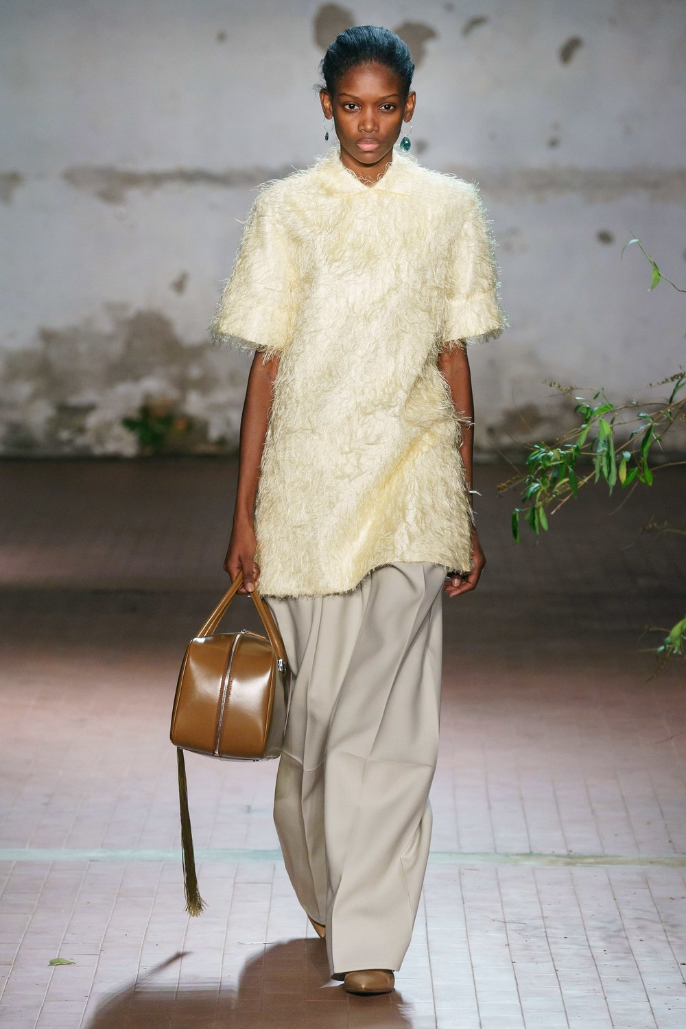大提琴師拉動着弓,讓旋律填滿米蘭的星期三晚上。創作總監 Lucy Meier 和 Luke Meier 繼續雕琢他們自 2017 年起所建立的清晰輪廓及遊牧態度的美學風格。不同場地於時裝周往往都鑲嵌出天攘之別的系列風格。前幾季 Meiers 打造全景螢光白的天橋,品牌的長衫和拖地恤衫裙在皎白天幕下似是別樣沙漠上的服飾。今季他們則邀請大家到訪一個狹小而潮濕的車庫,瞬間氣氛截然換上另一種美感,而場地更似是一間藏於市外的別緻畫廊。