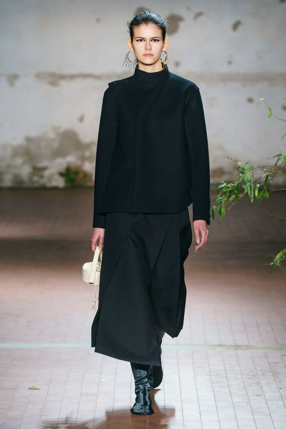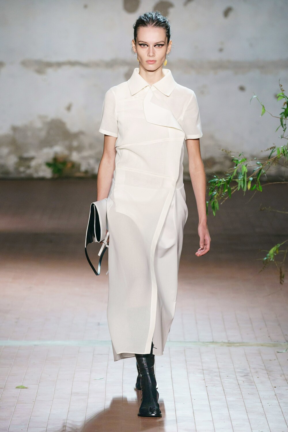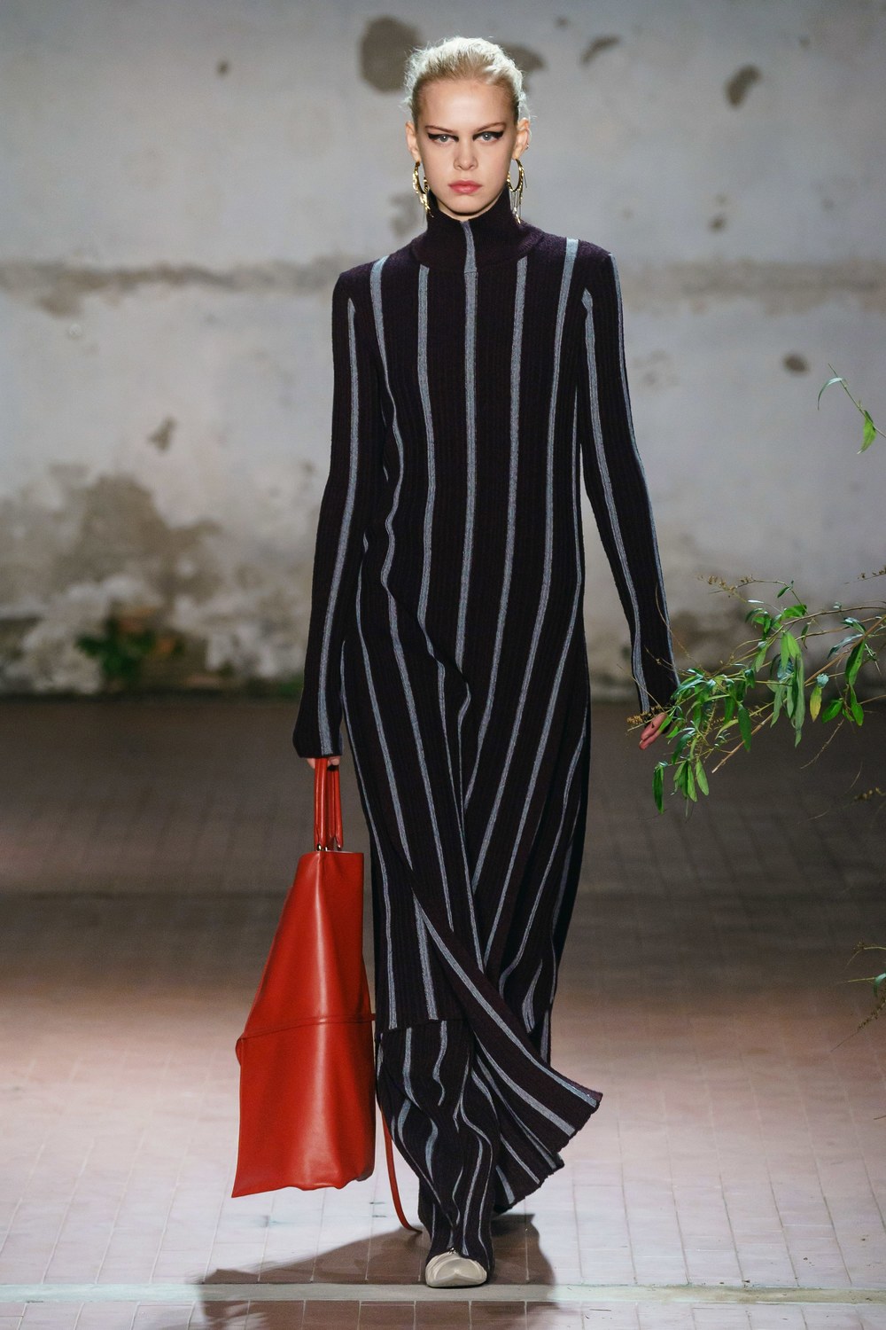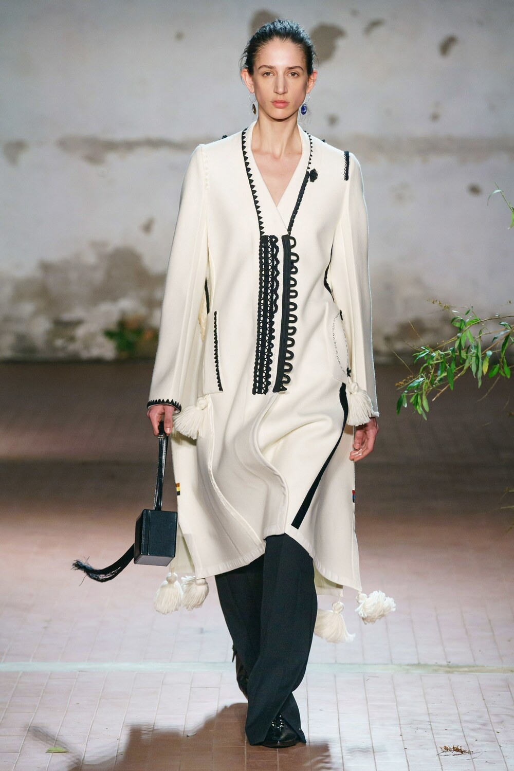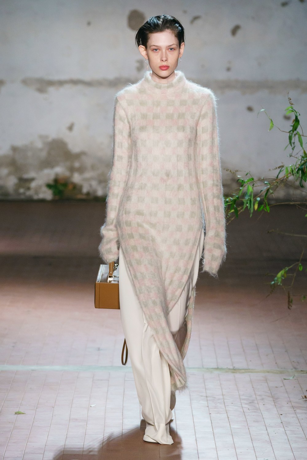 大提琴師拉動着弓,讓旋律填滿米蘭的星期三晚上。創作總監 Lucy Meier 和 Luke Meier 繼續雕琢他們自 2017 年起所建立的清晰輪廓及遊牧態度的美學風格。不同場地於時裝周往往都鑲嵌出天攘之別的系列風格。前幾季 Meiers 打造全景螢光白的天橋,品牌的長衫和拖地恤衫裙在皎白天幕下似是別樣沙漠上的服飾。今季他們則邀請大家到訪一個狹小而潮濕的車庫,瞬間氣氛截然換上另一種美感,而場地更似是一間藏於市外的別緻畫廊。