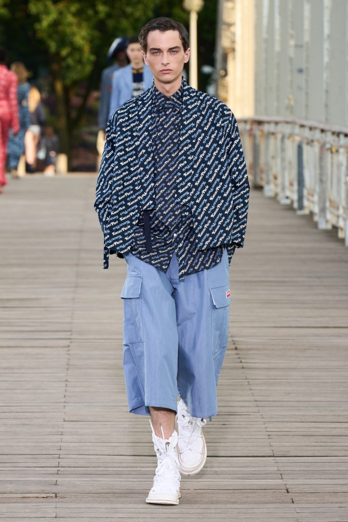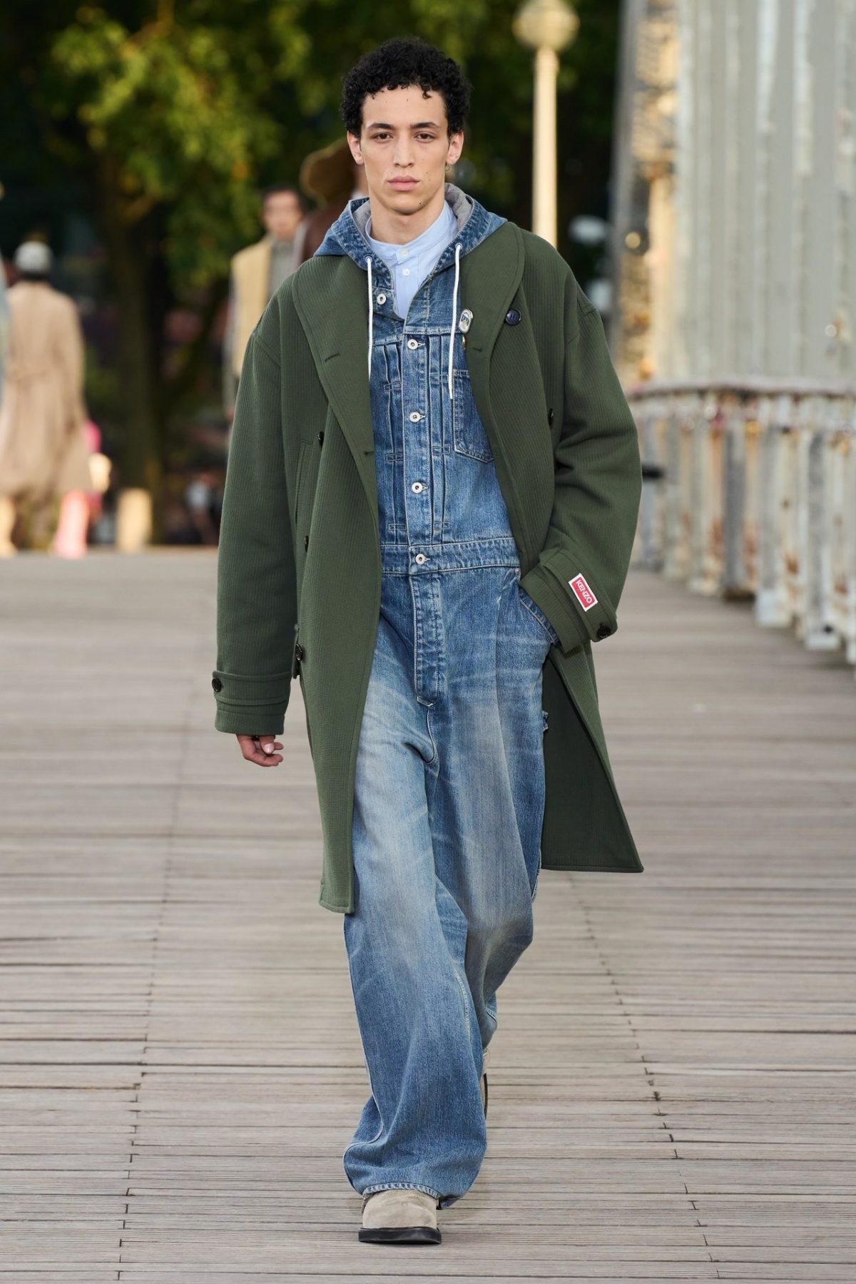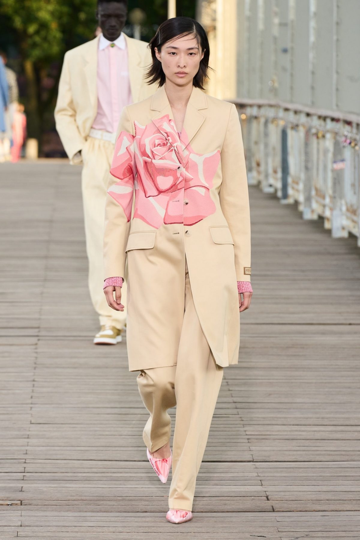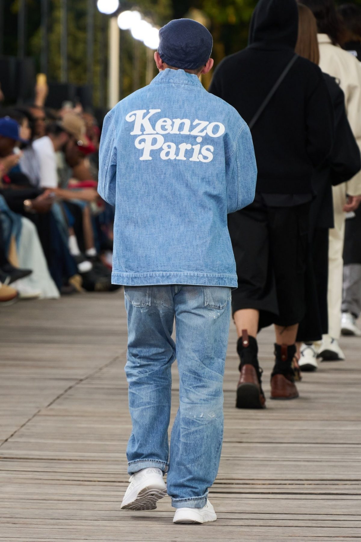 他還重新審視了品牌過去那些典藏的印花與設計輪廓,以其方式在這個系列進行嶄新的詮釋。剪裁絕對是重點,還有衣服細節與比例,每一個部分和元素都經過精心部署:和服剪裁的條紋外套、各種牛仔單品、還有經典的玫瑰印花圖案⋯⋯出現在系列男裝和女裝設計上。是的,儘管這是男裝週期間的發佈,Nigo 還是試圖設計一些女裝,帶來更多樣的款式和包容性。他還找來了自己的親密夥伴,日本平面藝術家 Verdy 來合作(他剛剛被宣佈擔任Blackpink的最新藝術總監),一個重新設計的 “Kenzo Paris” 標誌誕生了,它們幾乎無處不在,而更多是出現在外套的背後,這為Nigo在Kenzo的簽名式設計埋下伏筆——可以預想到這些合作款所產生的視覺效應,將是鋪天蓋地的。