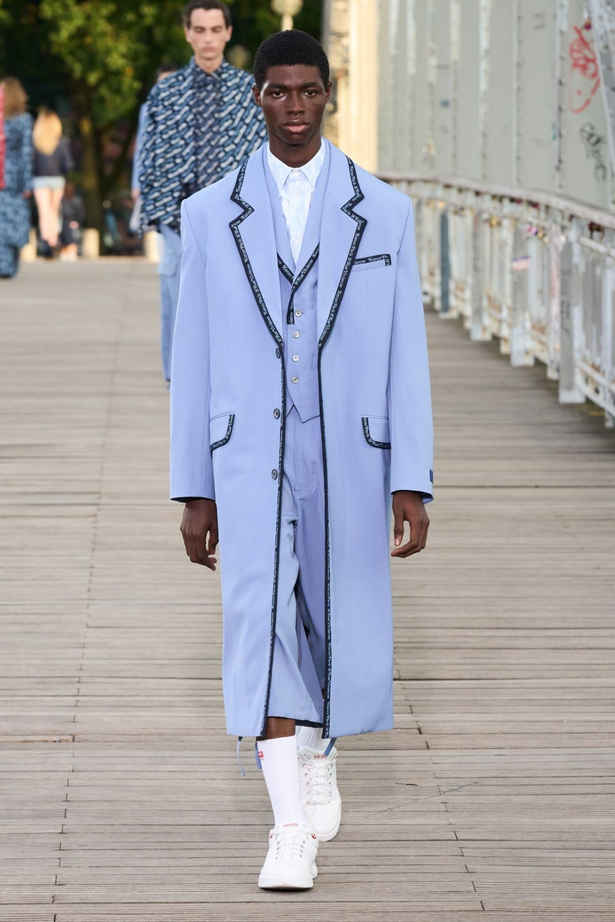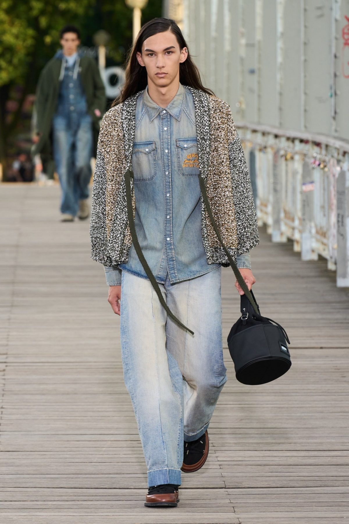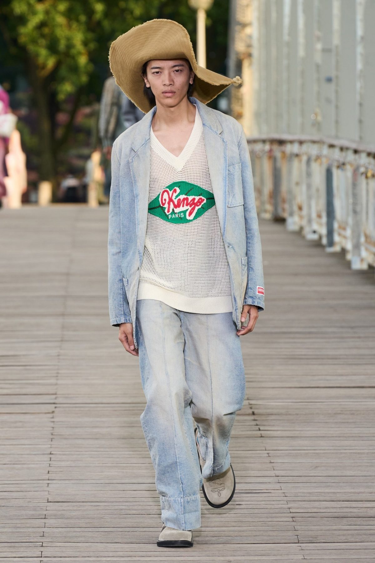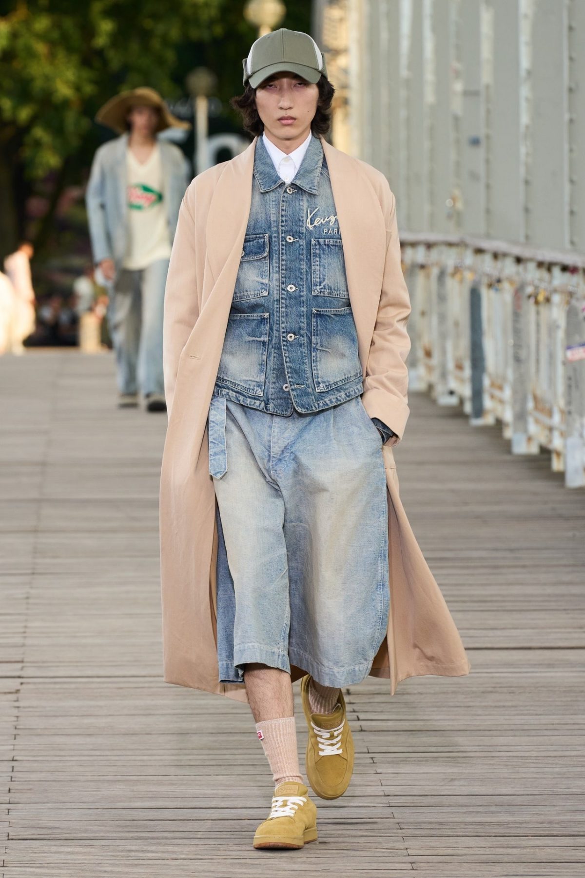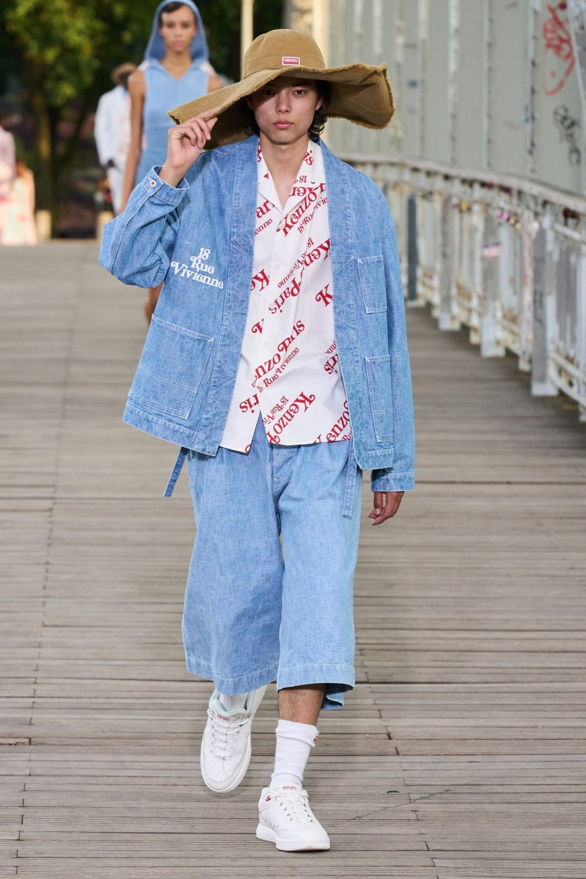 他還重新審視了品牌過去那些典藏的印花與設計輪廓,以其方式在這個系列進行嶄新的詮釋。剪裁絕對是重點,還有衣服細節與比例,每一個部分和元素都經過精心部署:和服剪裁的條紋外套、各種牛仔單品、還有經典的玫瑰印花圖案⋯⋯出現在系列男裝和女裝設計上。是的,儘管這是男裝週期間的發佈,Nigo 還是試圖設計一些女裝,帶來更多樣的款式和包容性。他還找來了自己的親密夥伴,日本平面藝術家 Verdy 來合作(他剛剛被宣佈擔任Blackpink的最新藝術總監),一個重新設計的 “Kenzo Paris” 標誌誕生了,它們幾乎無處不在,而更多是出現在外套的背後,這為Nigo在Kenzo的簽名式設計埋下伏筆——可以預想到這些合作款所產生的視覺效應,將是鋪天蓋地的。