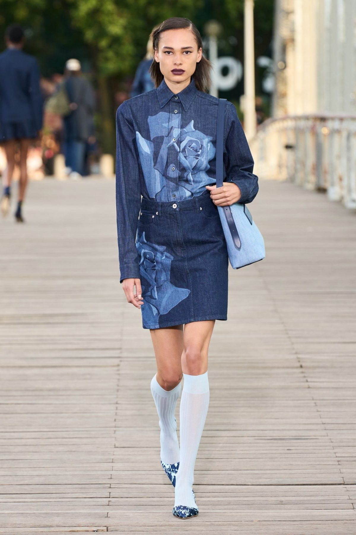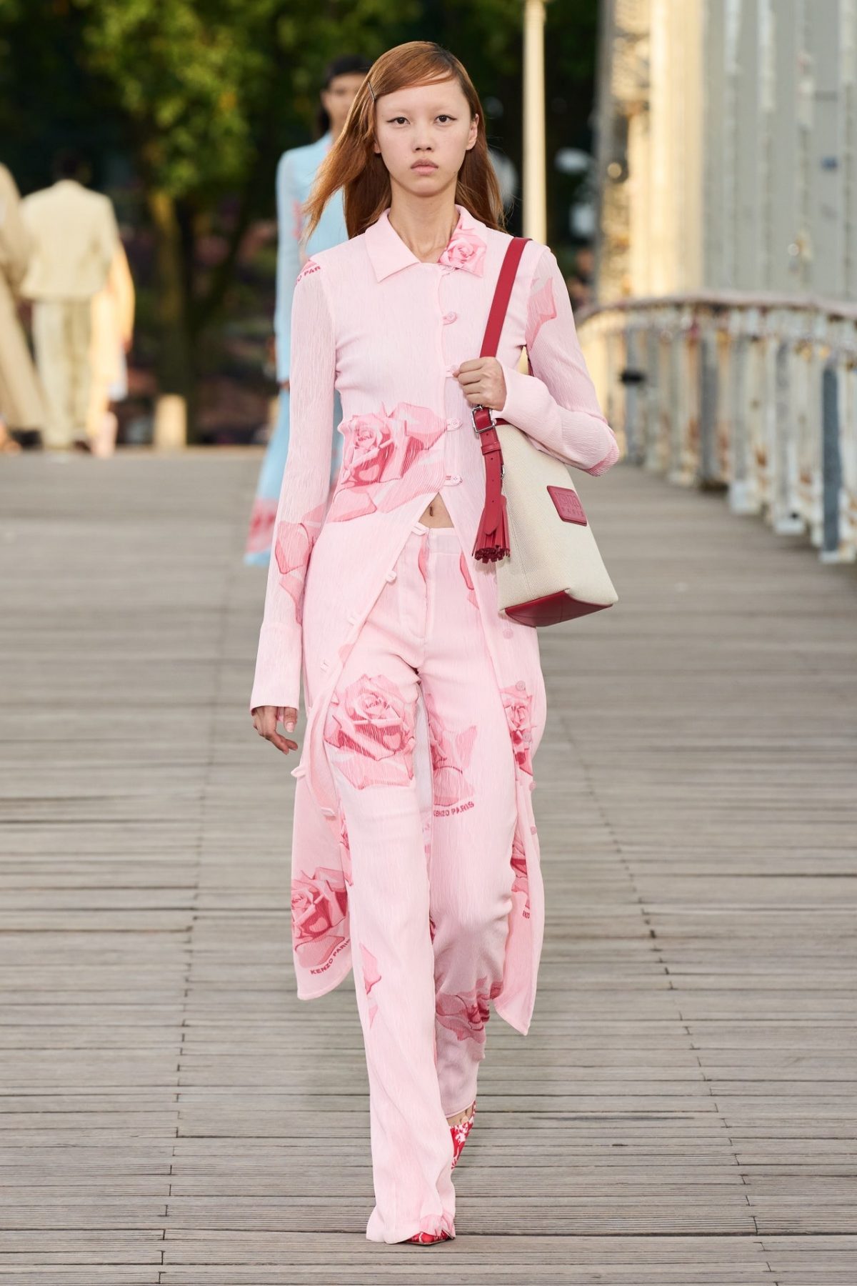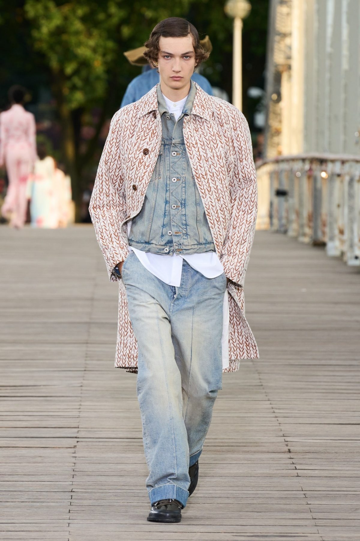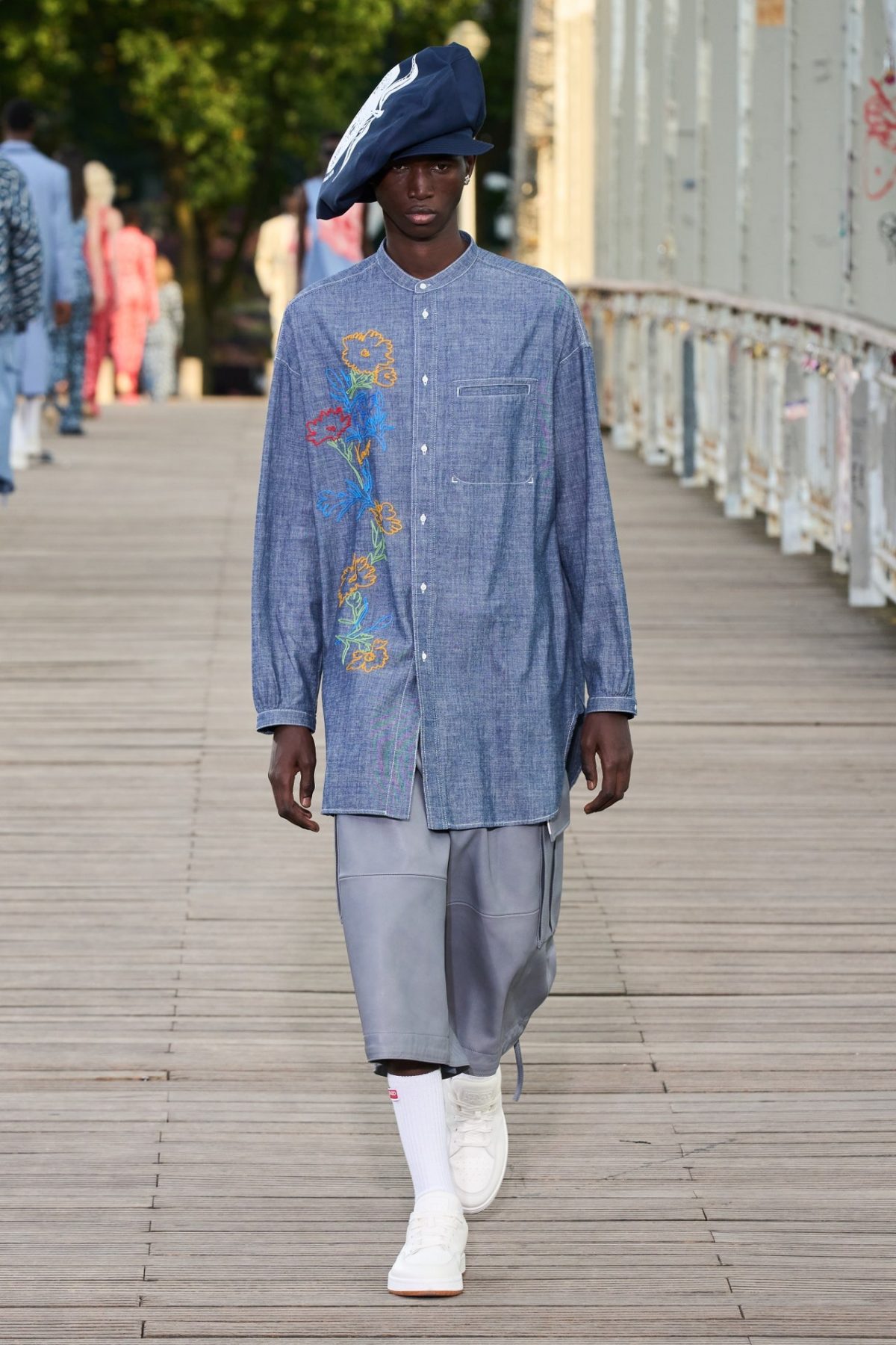 他還重新審視了品牌過去那些典藏的印花與設計輪廓,以其方式在這個系列進行嶄新的詮釋。剪裁絕對是重點,還有衣服細節與比例,每一個部分和元素都經過精心部署:和服剪裁的條紋外套、各種牛仔單品、還有經典的玫瑰印花圖案⋯⋯出現在系列男裝和女裝設計上。是的,儘管這是男裝週期間的發佈,Nigo 還是試圖設計一些女裝,帶來更多樣的款式和包容性。他還找來了自己的親密夥伴,日本平面藝術家 Verdy 來合作(他剛剛被宣佈擔任Blackpink的最新藝術總監),一個重新設計的 “Kenzo Paris” 標誌誕生了,它們幾乎無處不在,而更多是出現在外套的背後,這為Nigo在Kenzo的簽名式設計埋下伏筆——可以預想到這些合作款所產生的視覺效應,將是鋪天蓋地的。
