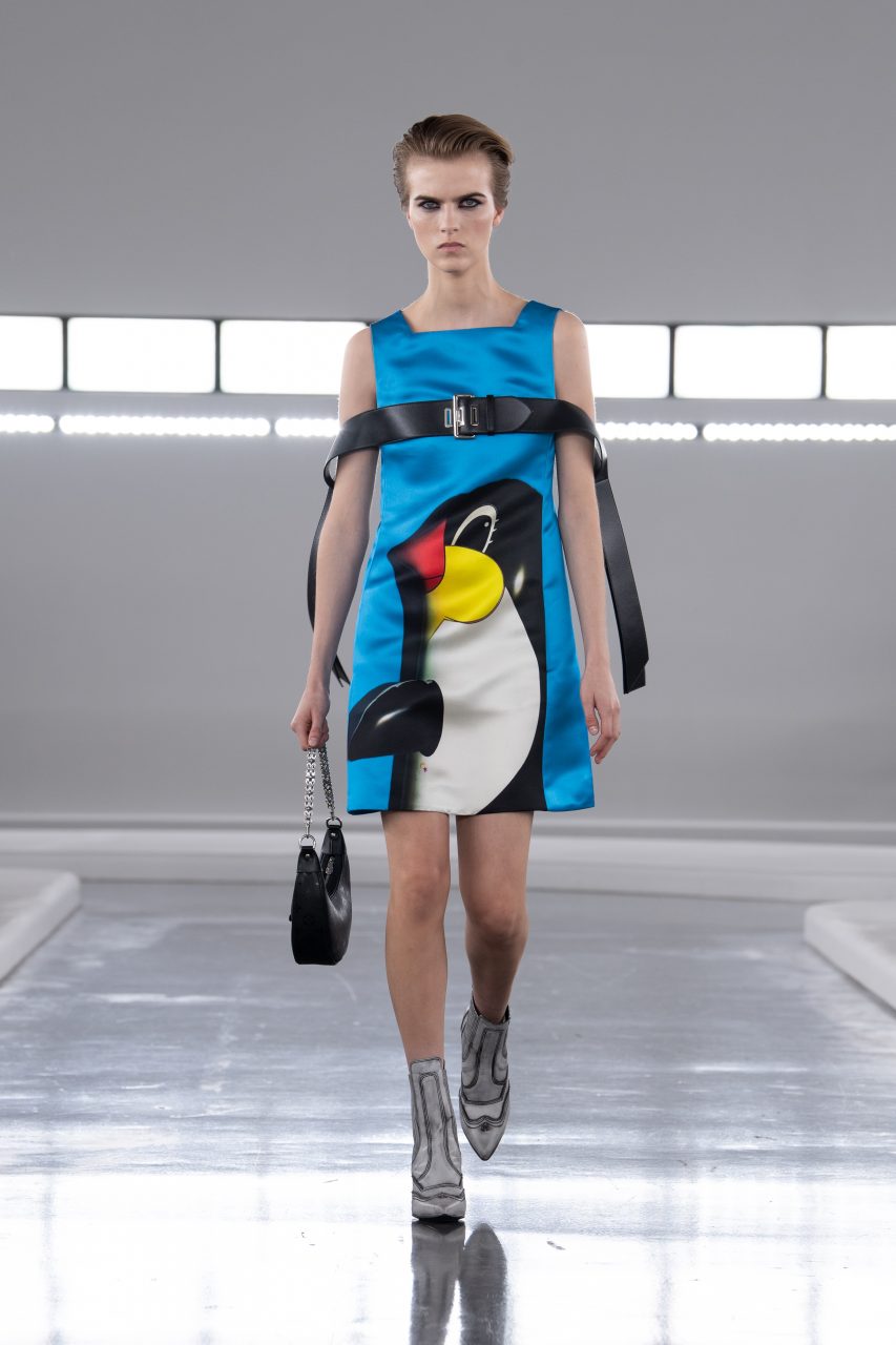 在雙方的合作過程中,孫一鈿意趣盎然的巨型藝術作品化作大膽奪目的印花或刺繡圖案,點綴各款時裝,與Louis Vuitton女裝系列藝術總監Nicolas Ghesquière設計的早秋造型完美呼應。本季系列Nicolas Ghesquière在流暢廓形的緞面連身裙上,融入企鵝、獵豹、粉紅兔子等元素,裙裝上部分被皮革腰帶包裹,或配襯帶有雕塑感的泡泡袖襯衫裙,將女性身上的率性瀟灑與內核的浪漫童趣映現出來。
