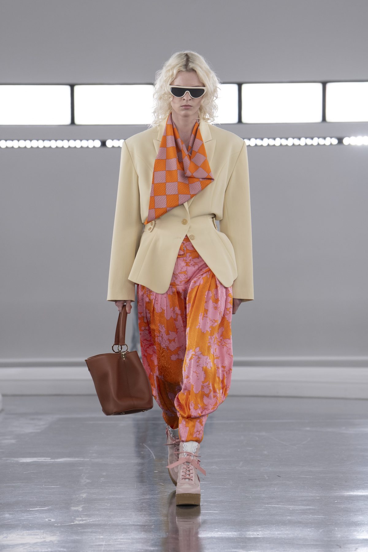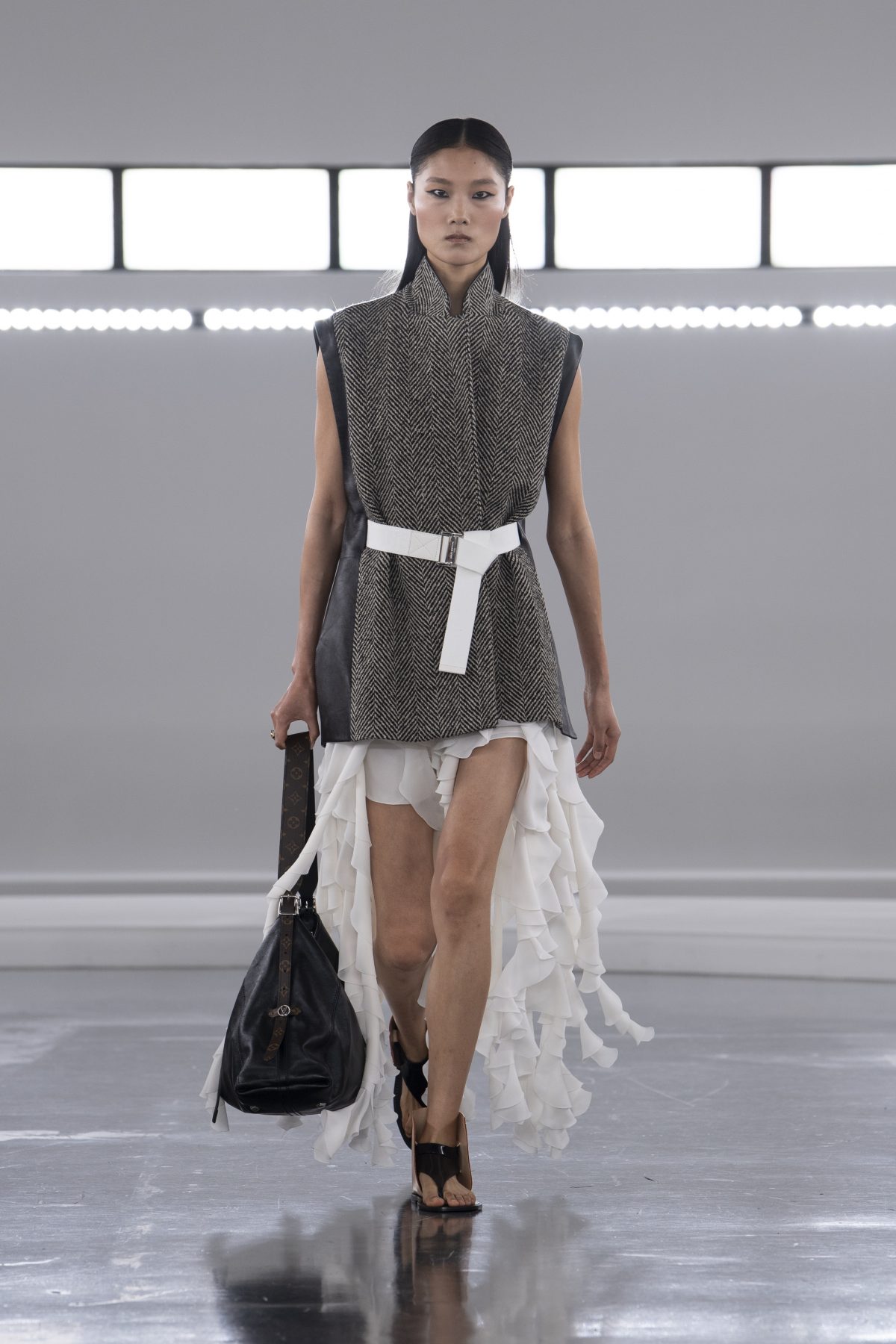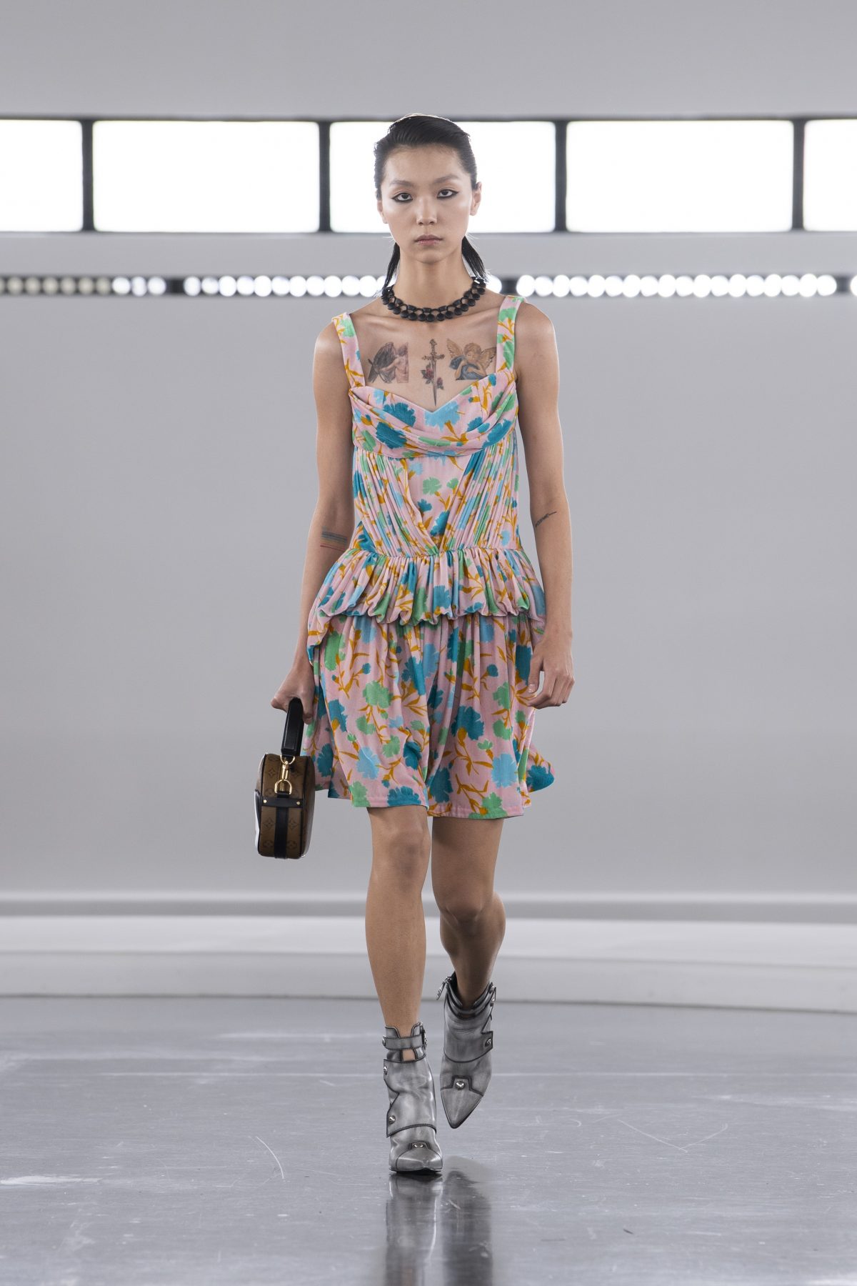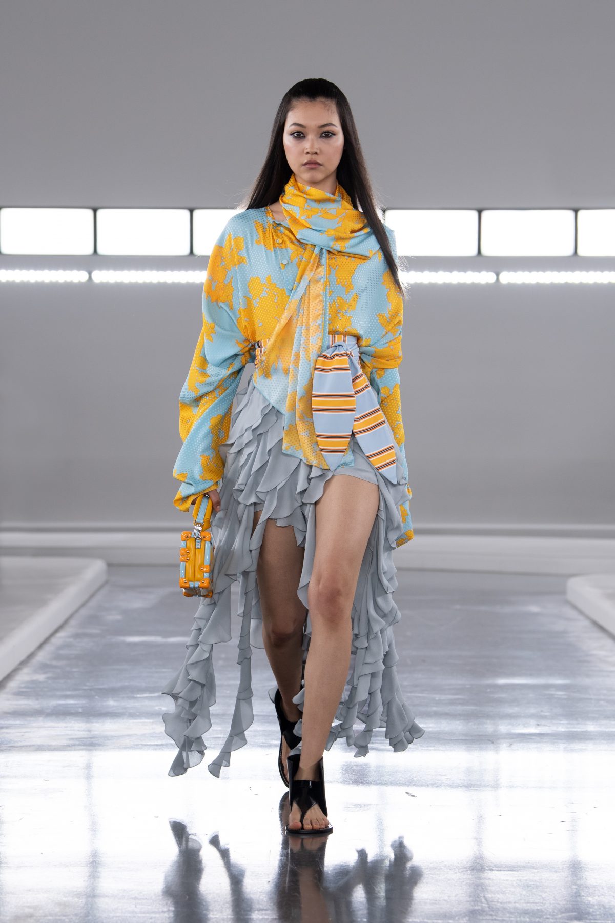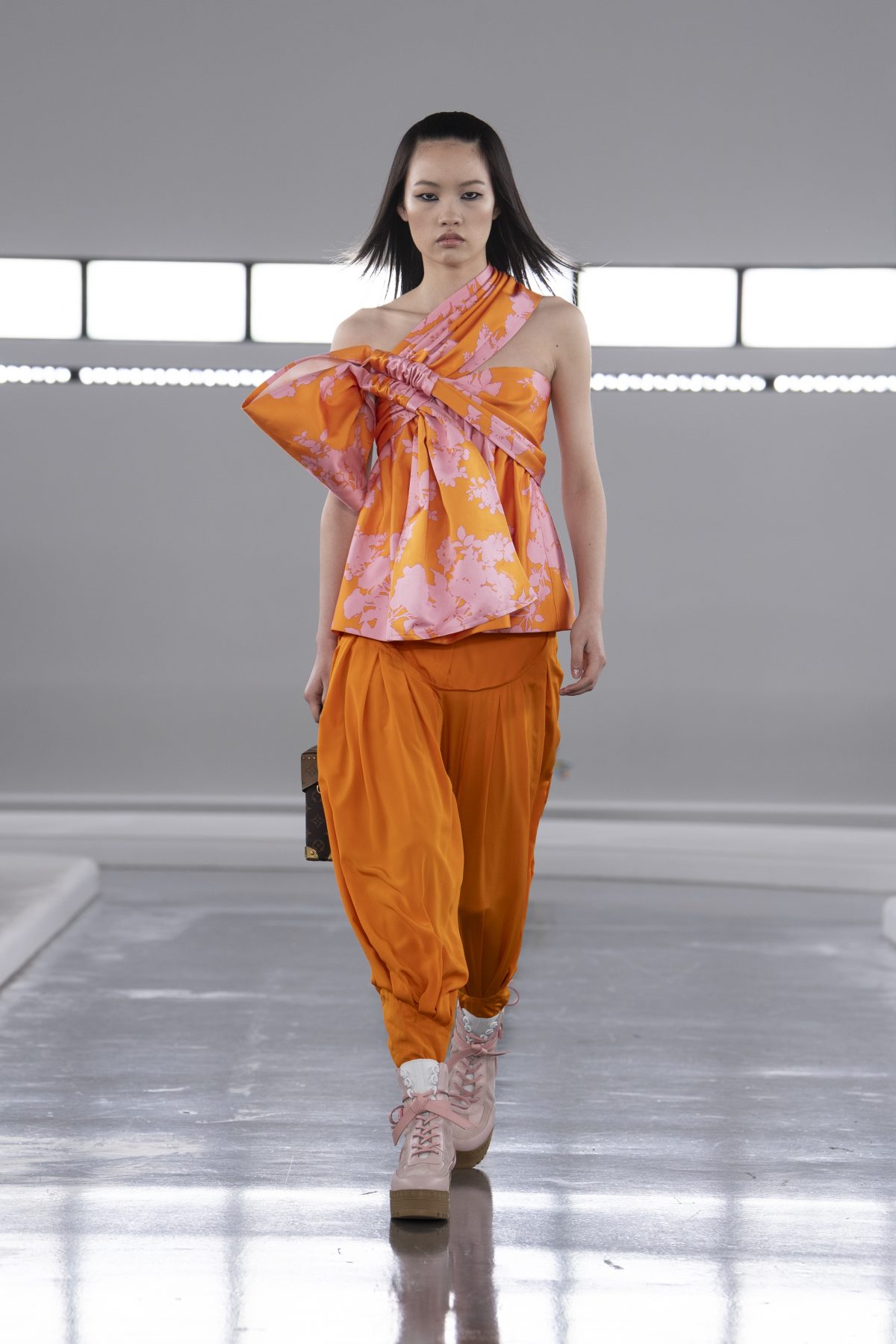 大膽奪目的色塊融會貫通,寬大肩線的外套透過不同色彩進行碰撞,極具復古氣息,胸口處飾有金屬皮革,精準凝煉女性的率性姿態。Nicolas Ghesquière將夢幻般的細膩質感與優雅格調相結合,潑墨印花搭載於誇張褶皺設計,呈現東方美學的力量與柔性兼具的特點。