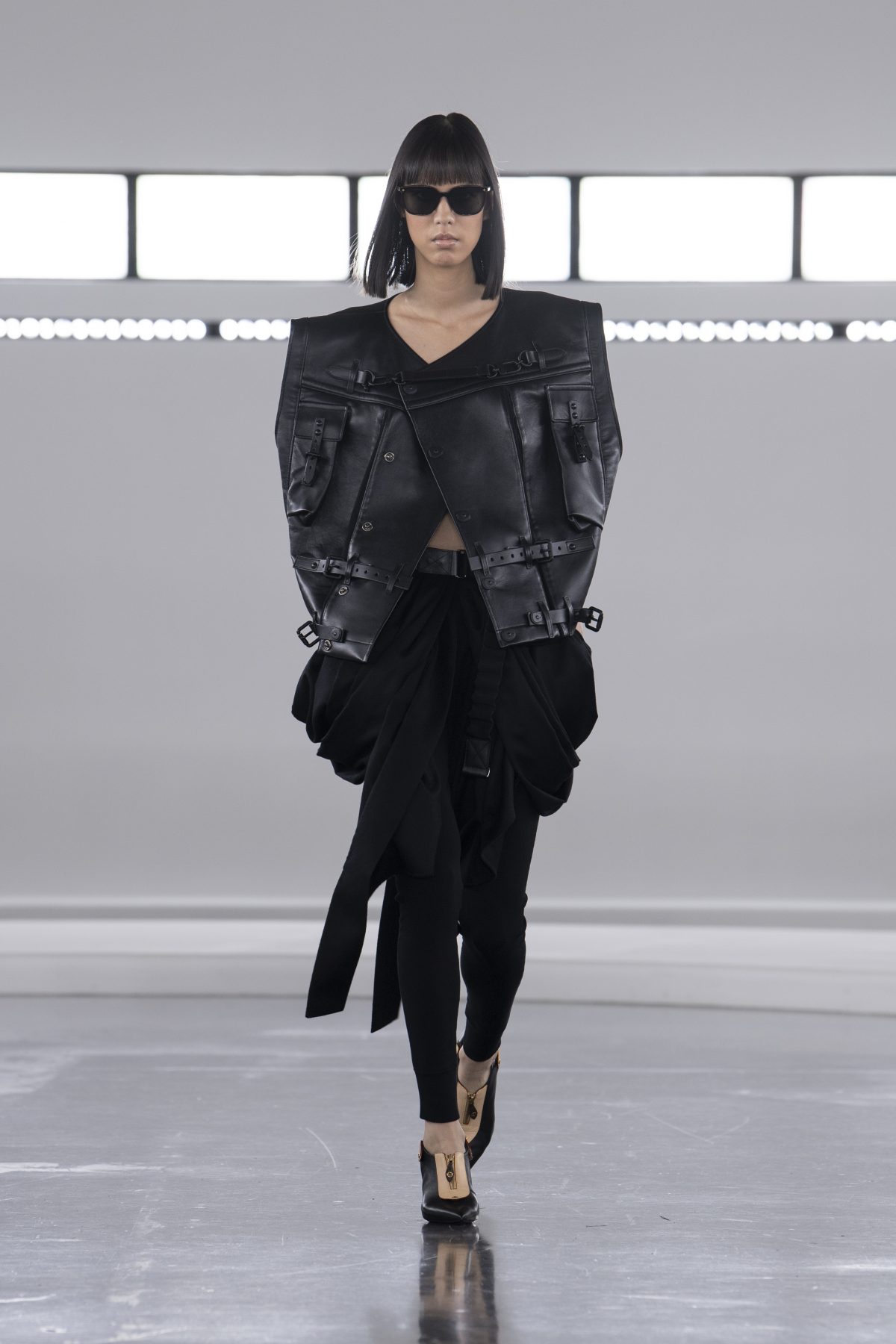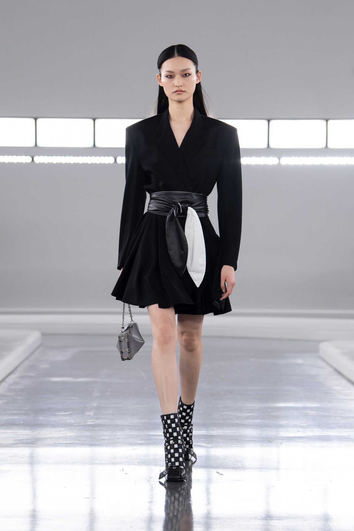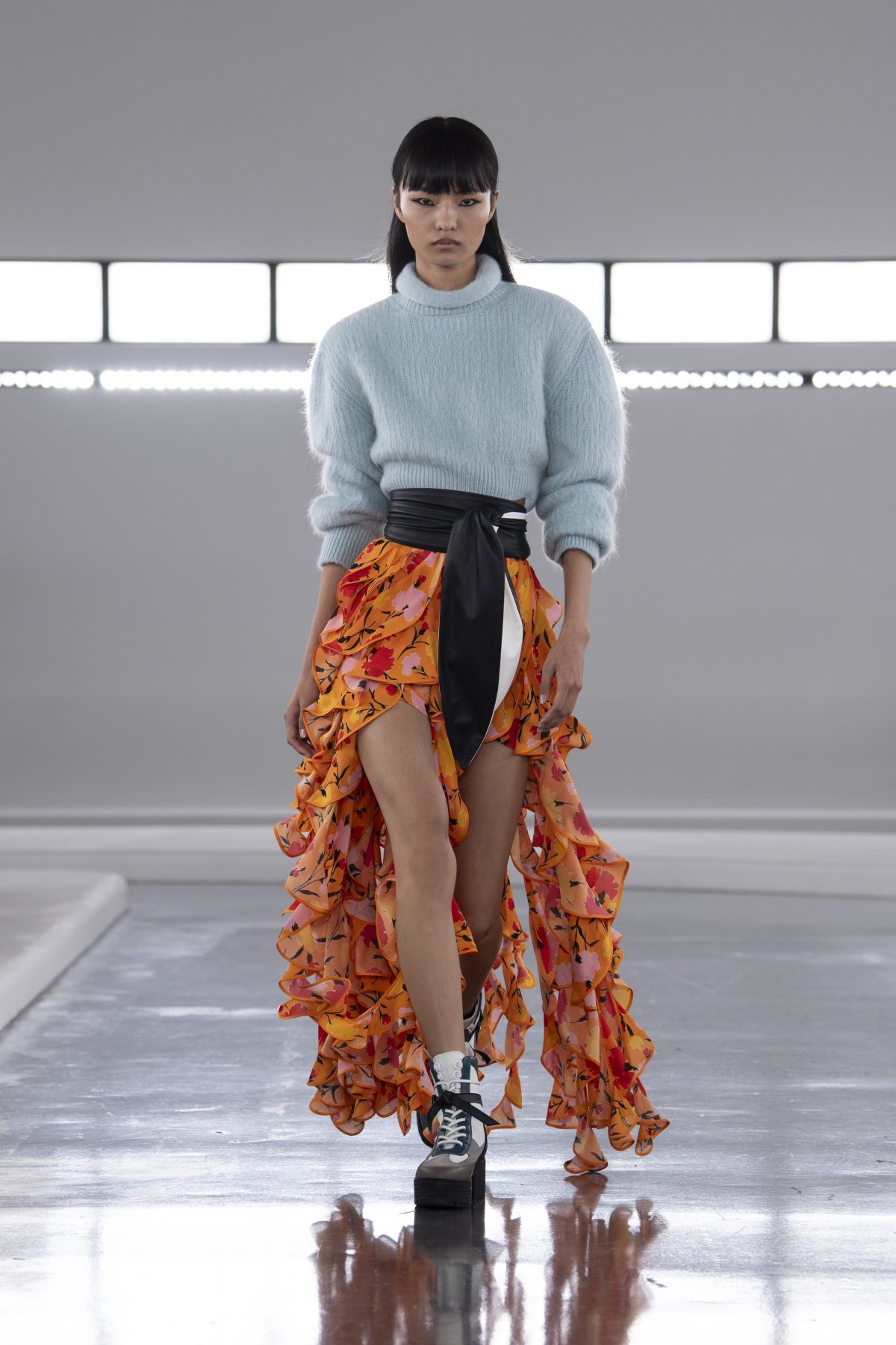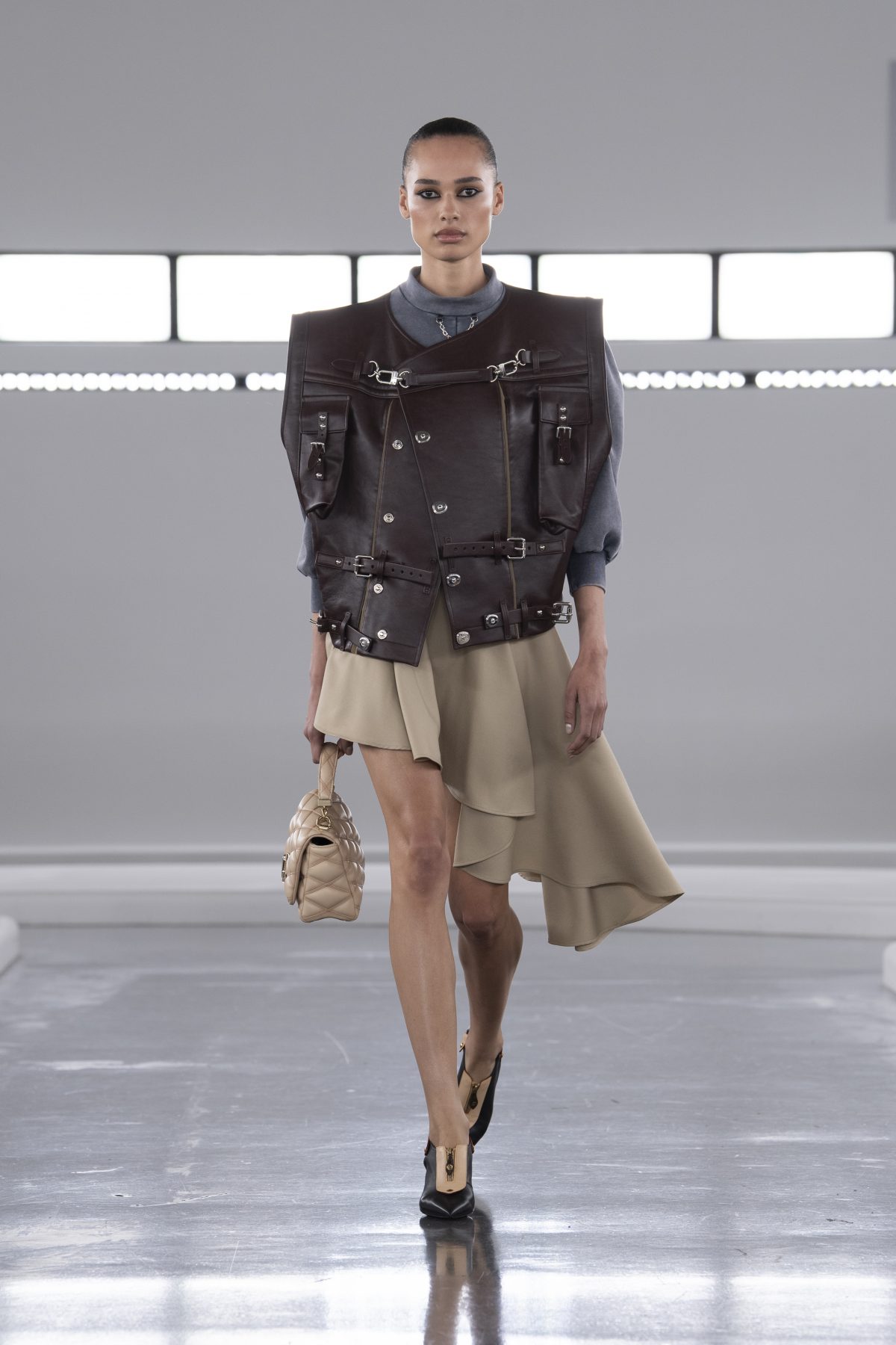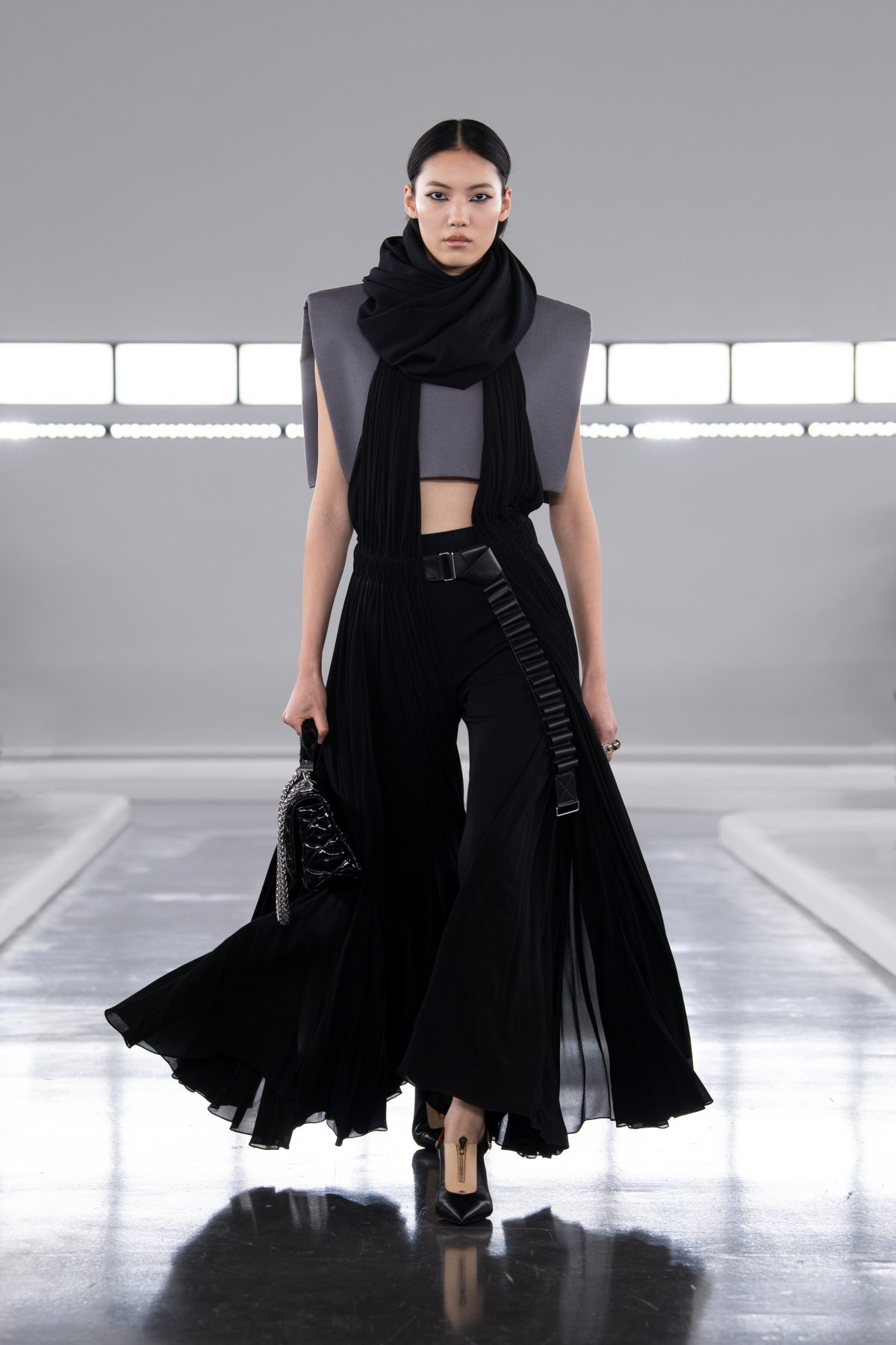 大膽奪目的色塊融會貫通,寬大肩線的外套透過不同色彩進行碰撞,極具復古氣息,胸口處飾有金屬皮革,精準凝煉女性的率性姿態。Nicolas Ghesquière將夢幻般的細膩質感與優雅格調相結合,潑墨印花搭載於誇張褶皺設計,呈現東方美學的力量與柔性兼具的特點。