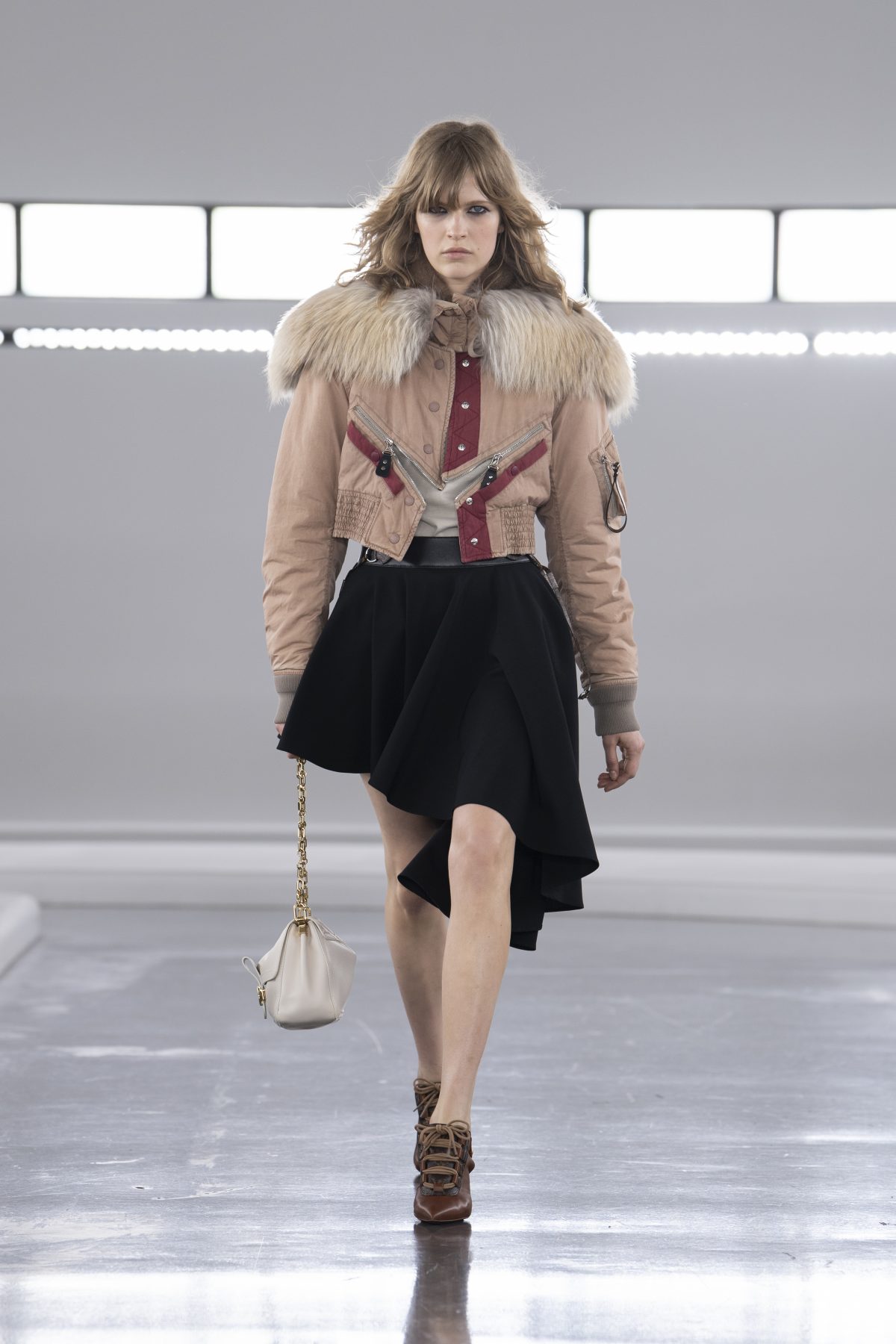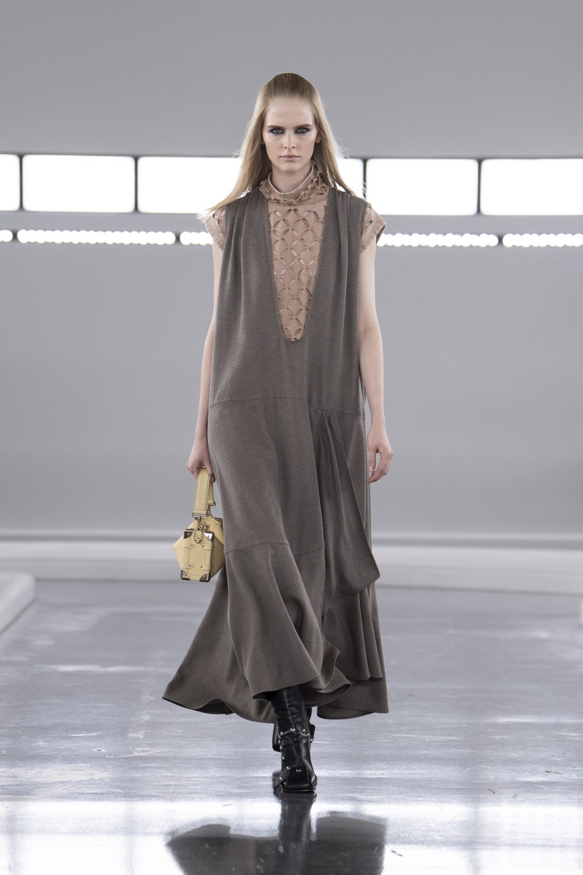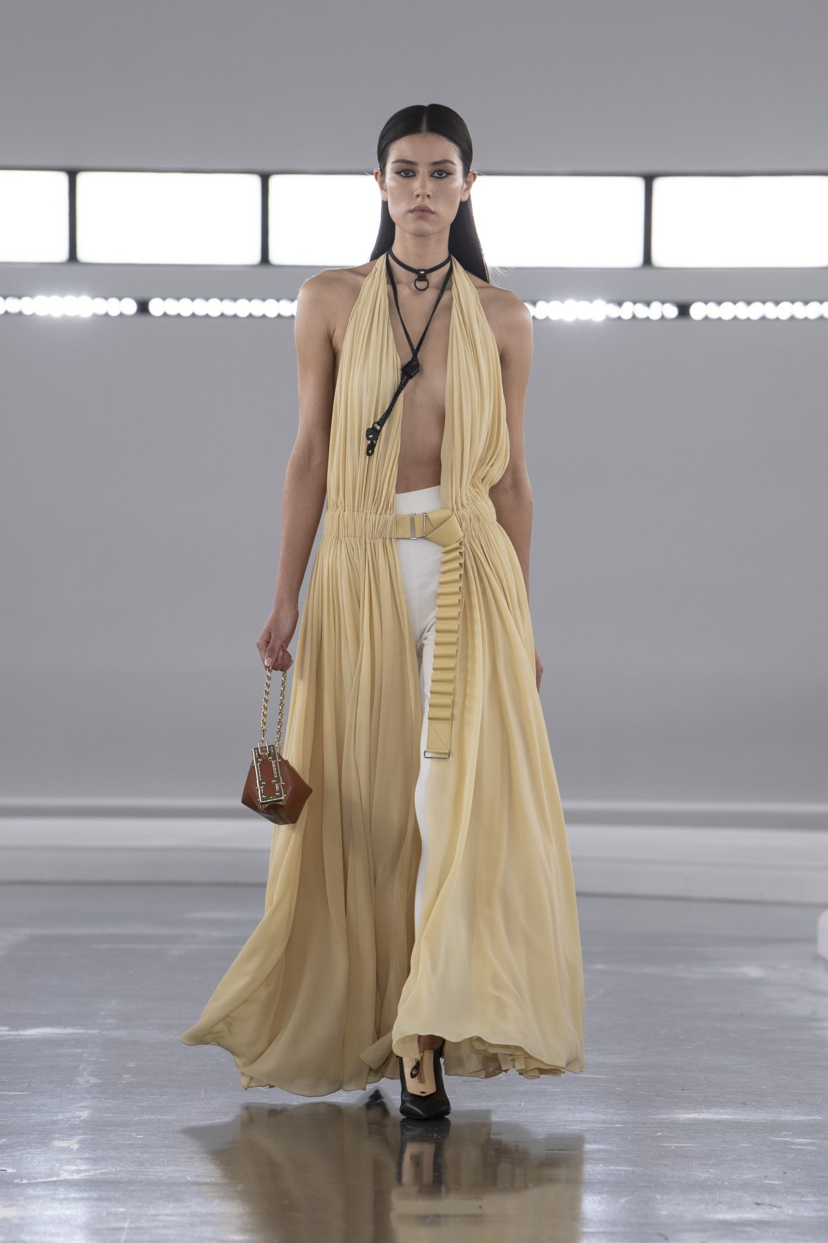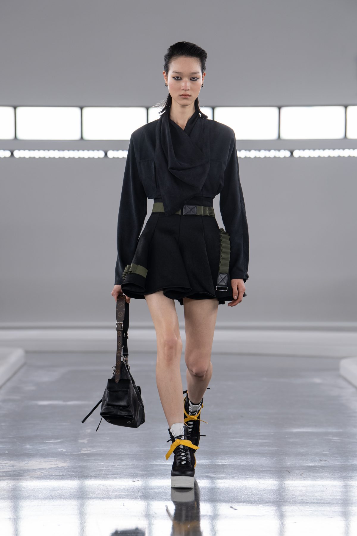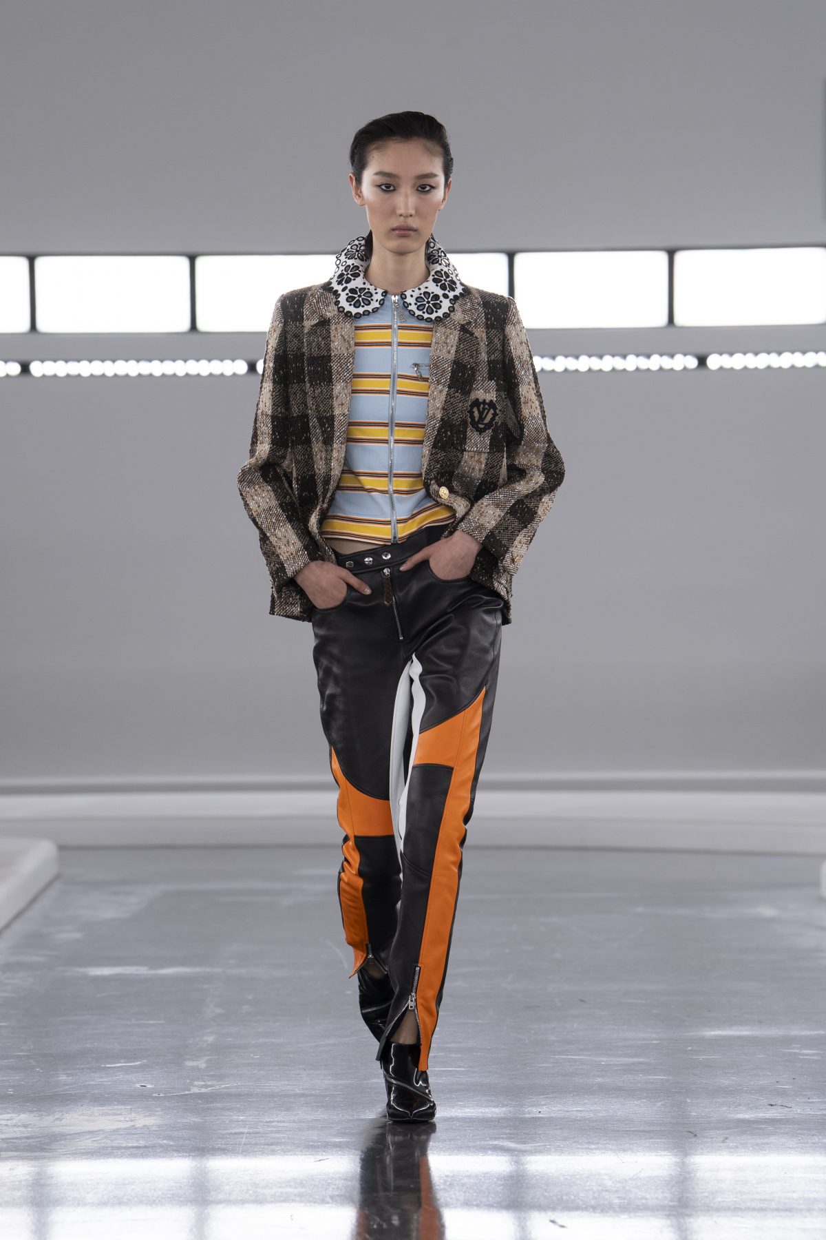 大膽奪目的色塊融會貫通,寬大肩線的外套透過不同色彩進行碰撞,極具復古氣息,胸口處飾有金屬皮革,精準凝煉女性的率性姿態。Nicolas Ghesquière將夢幻般的細膩質感與優雅格調相結合,潑墨印花搭載於誇張褶皺設計,呈現東方美學的力量與柔性兼具的特點。