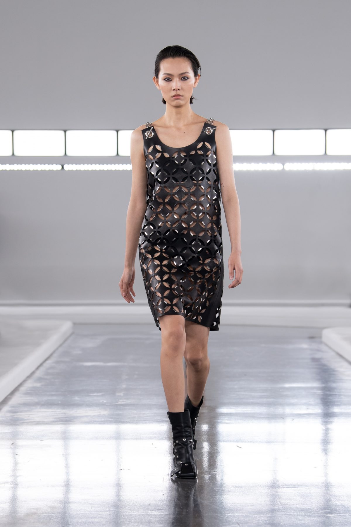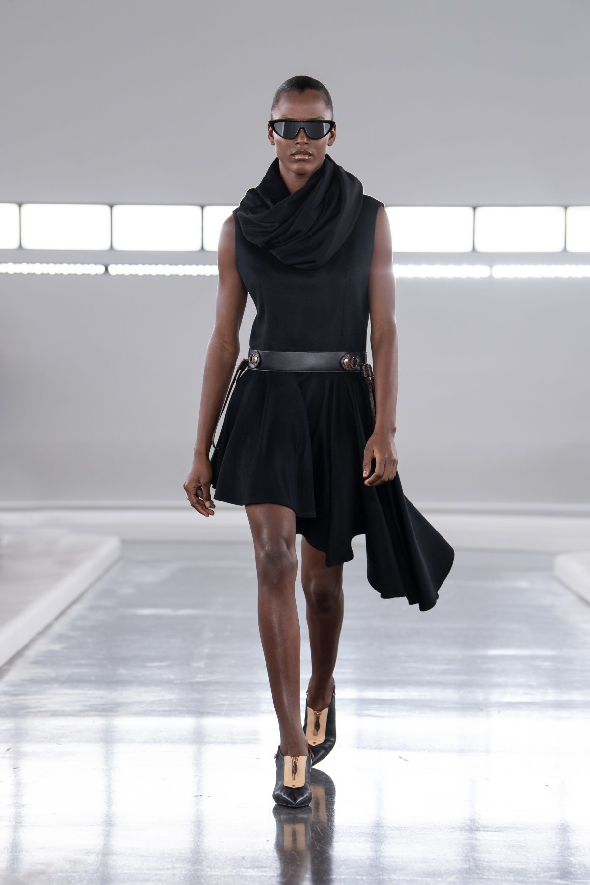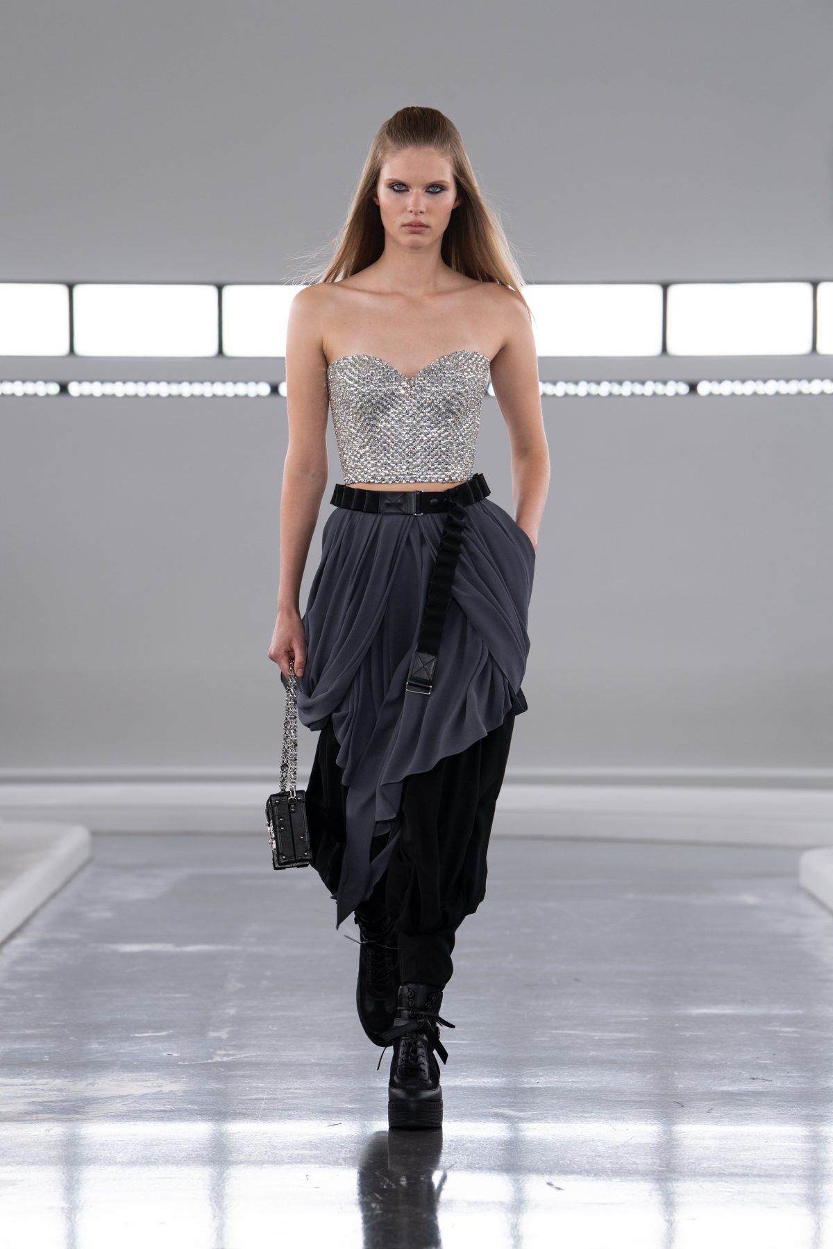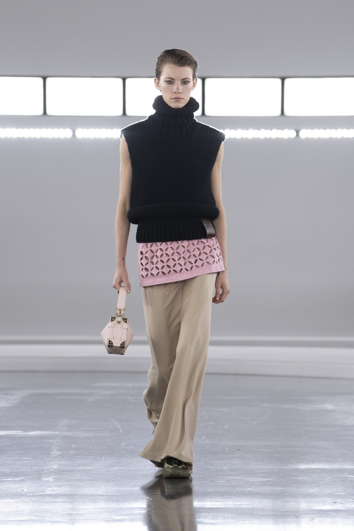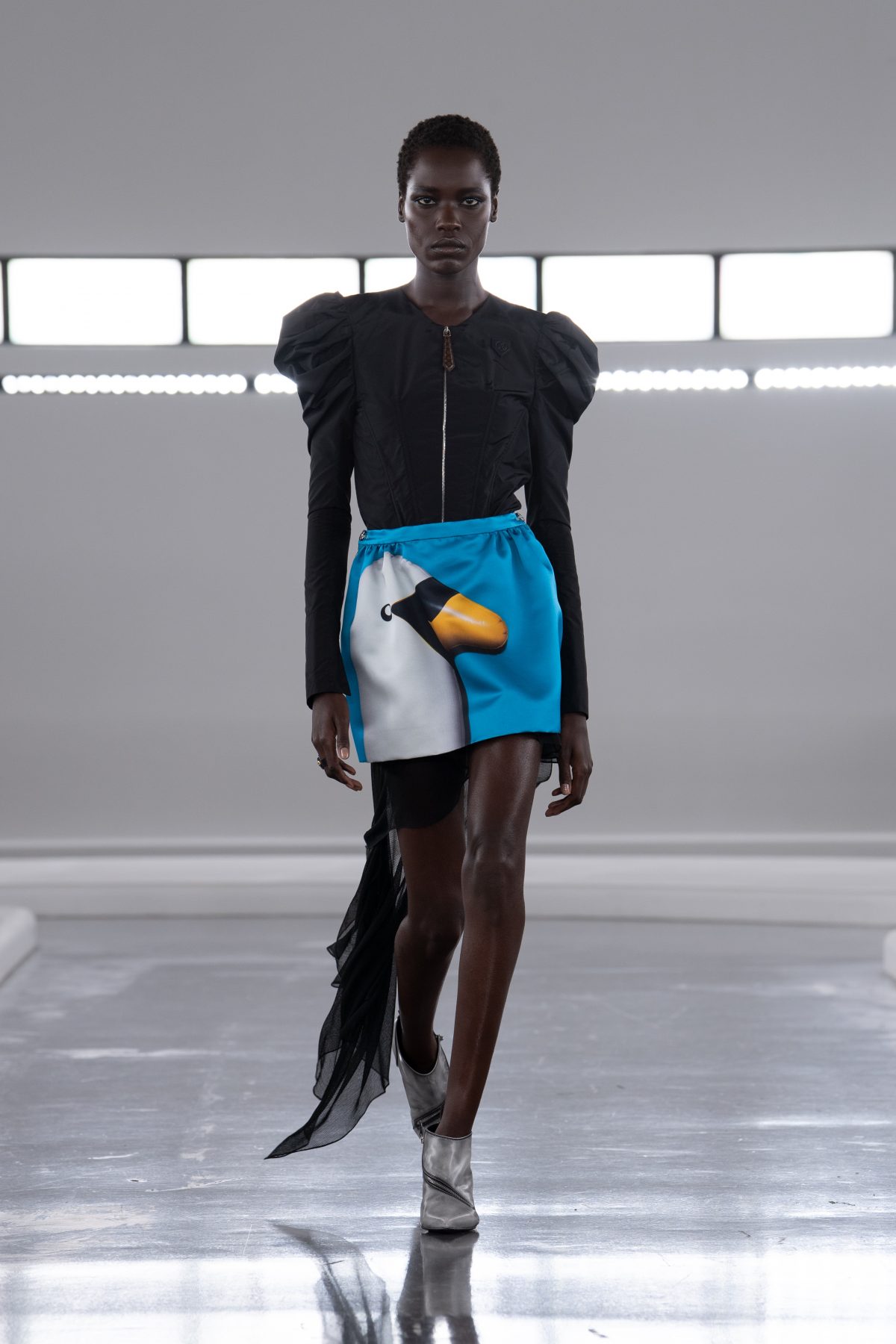 大膽奪目的色塊融會貫通,寬大肩線的外套透過不同色彩進行碰撞,極具復古氣息,胸口處飾有金屬皮革,精準凝煉女性的率性姿態。Nicolas Ghesquière將夢幻般的細膩質感與優雅格調相結合,潑墨印花搭載於誇張褶皺設計,呈現東方美學的力量與柔性兼具的特點。
