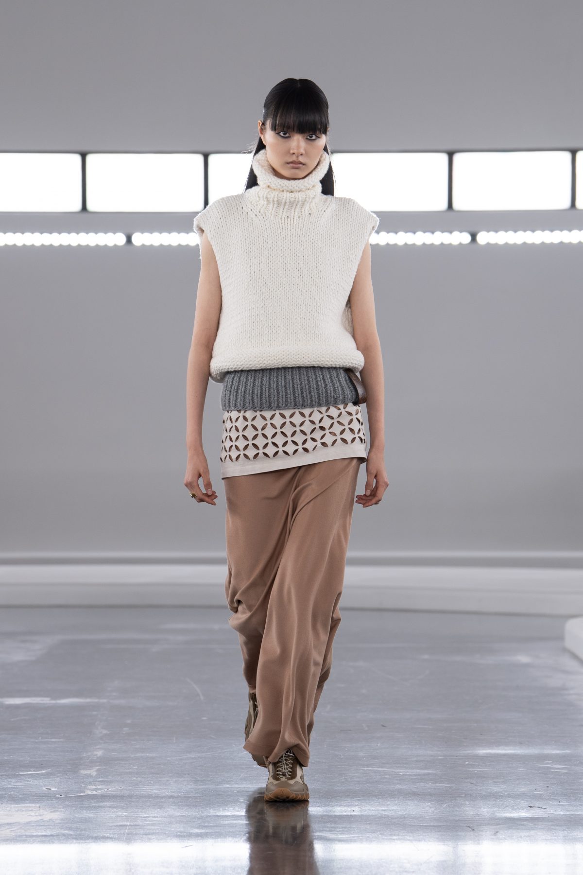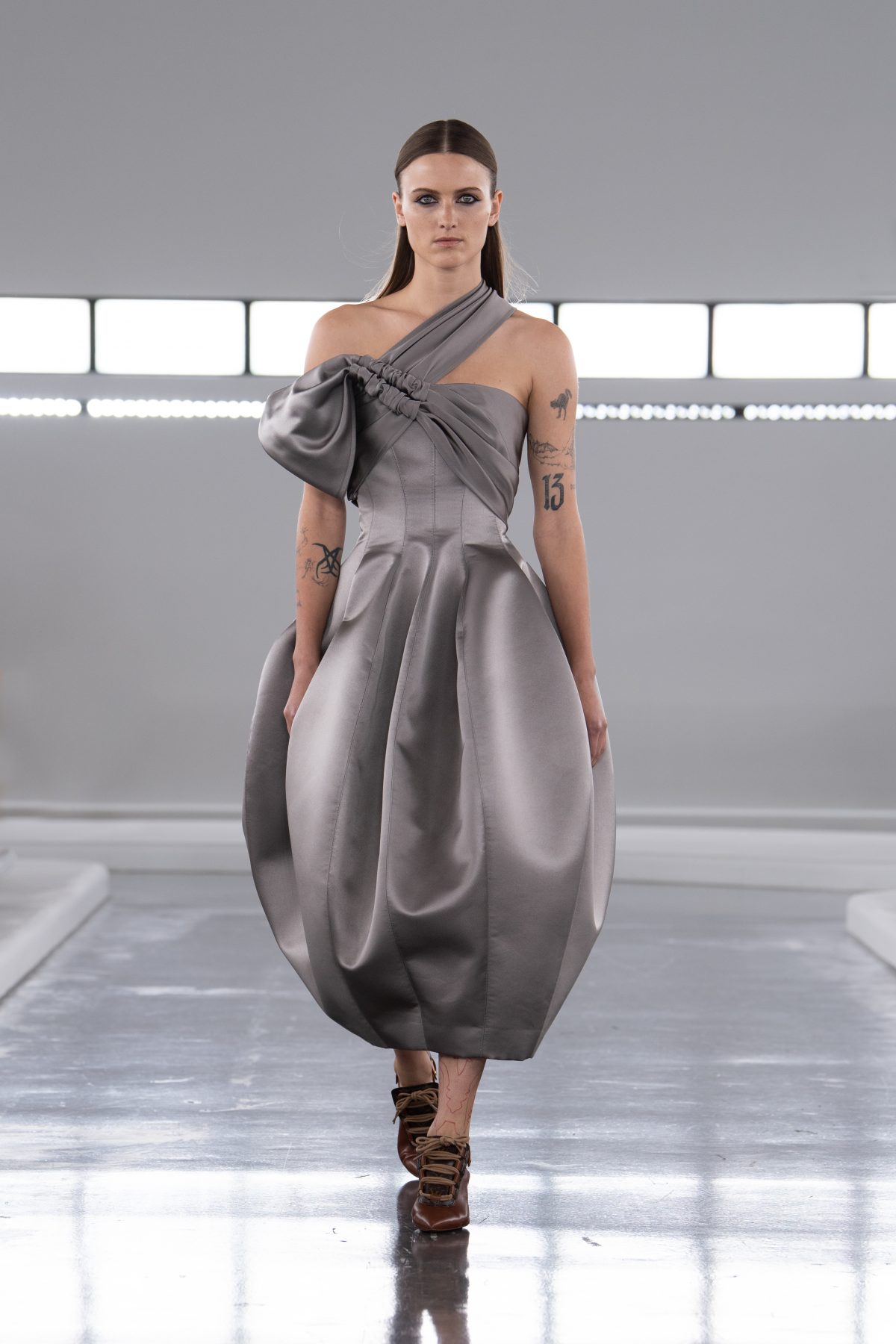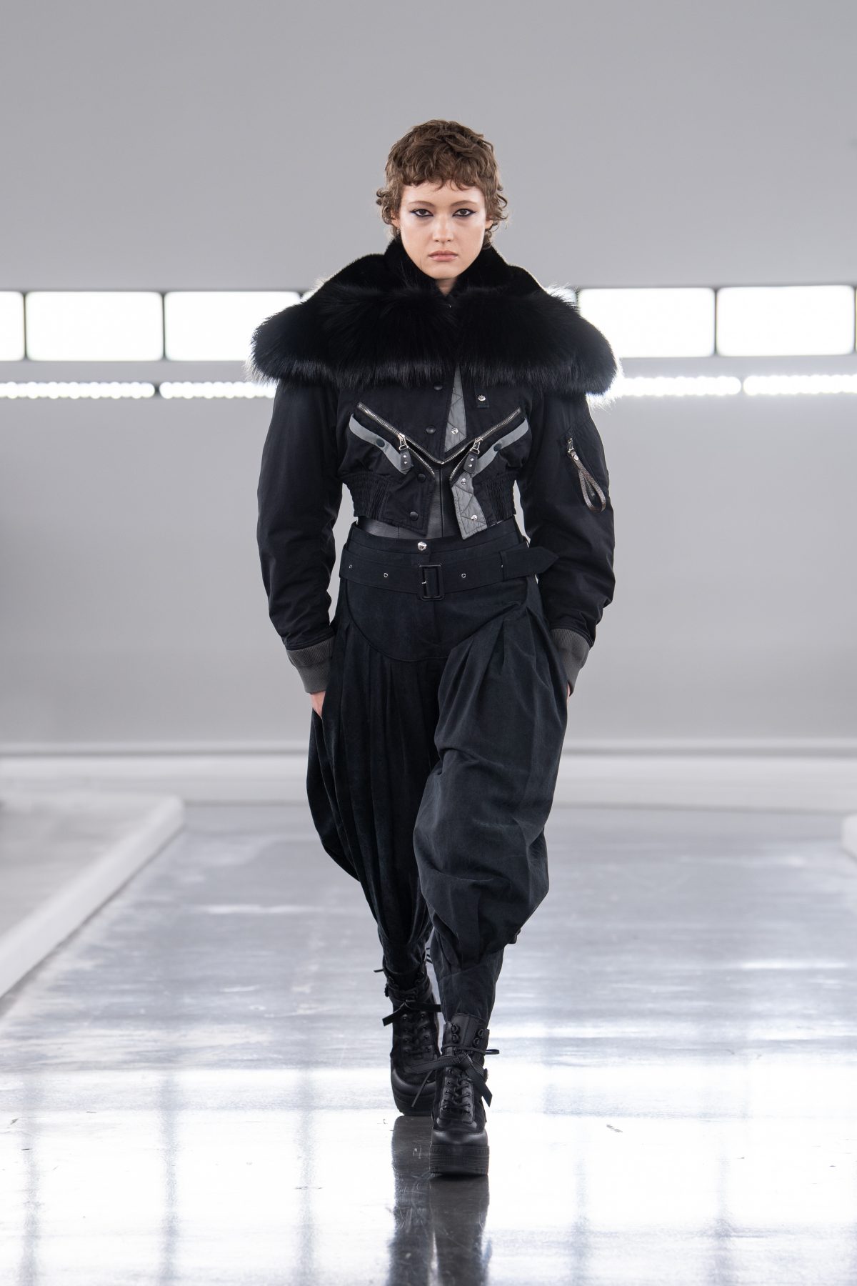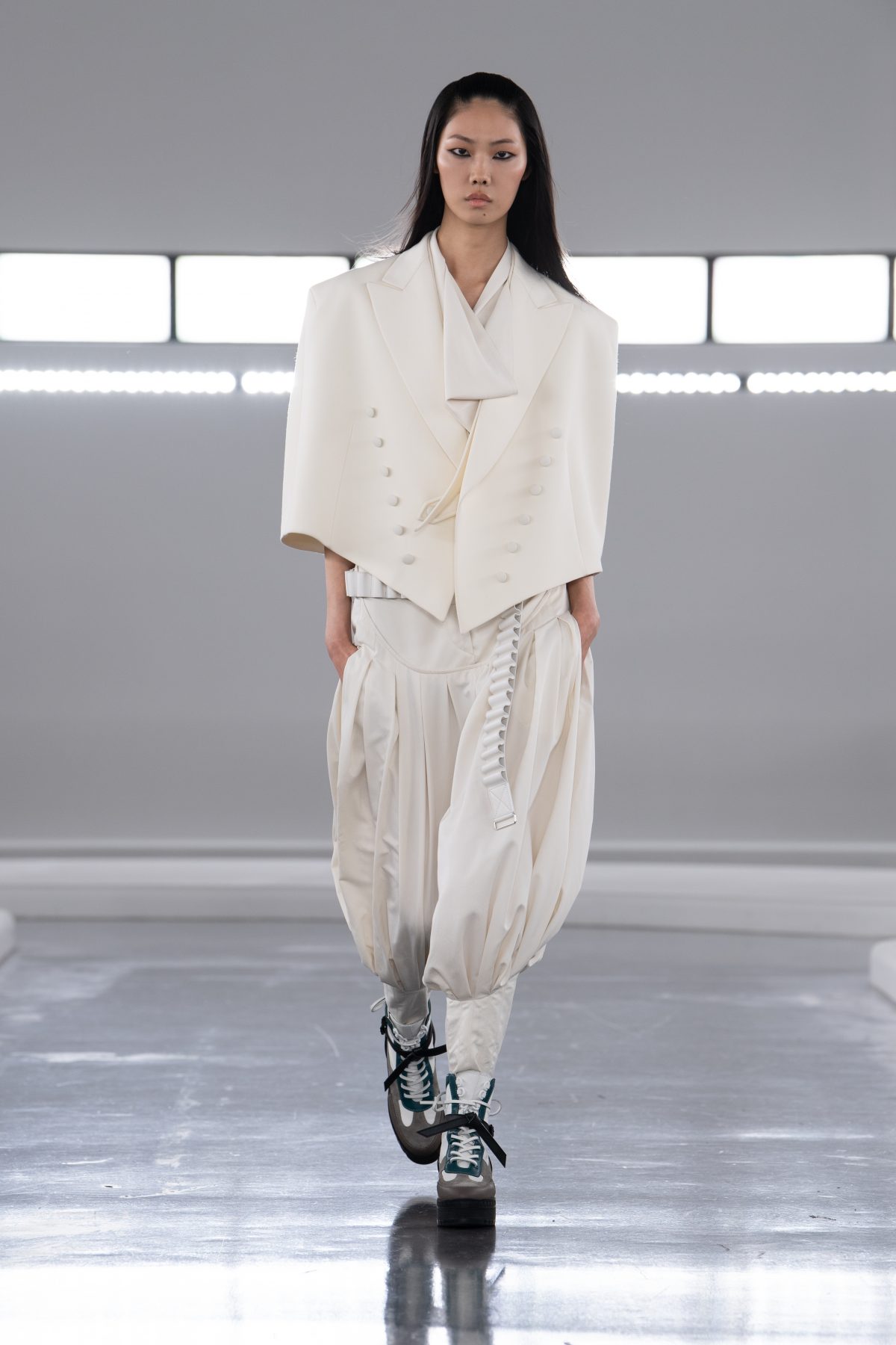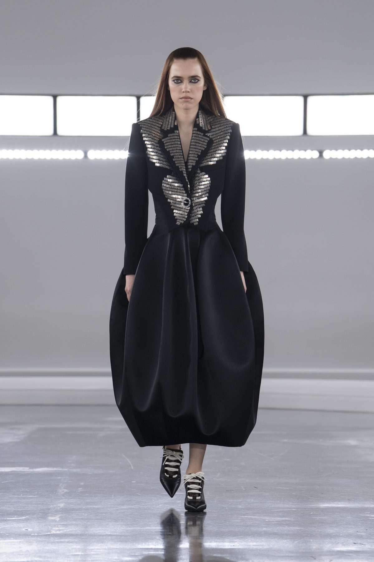 大膽奪目的色塊融會貫通,寬大肩線的外套透過不同色彩進行碰撞,極具復古氣息,胸口處飾有金屬皮革,精準凝煉女性的率性姿態。Nicolas Ghesquière將夢幻般的細膩質感與優雅格調相結合,潑墨印花搭載於誇張褶皺設計,呈現東方美學的力量與柔性兼具的特點。
