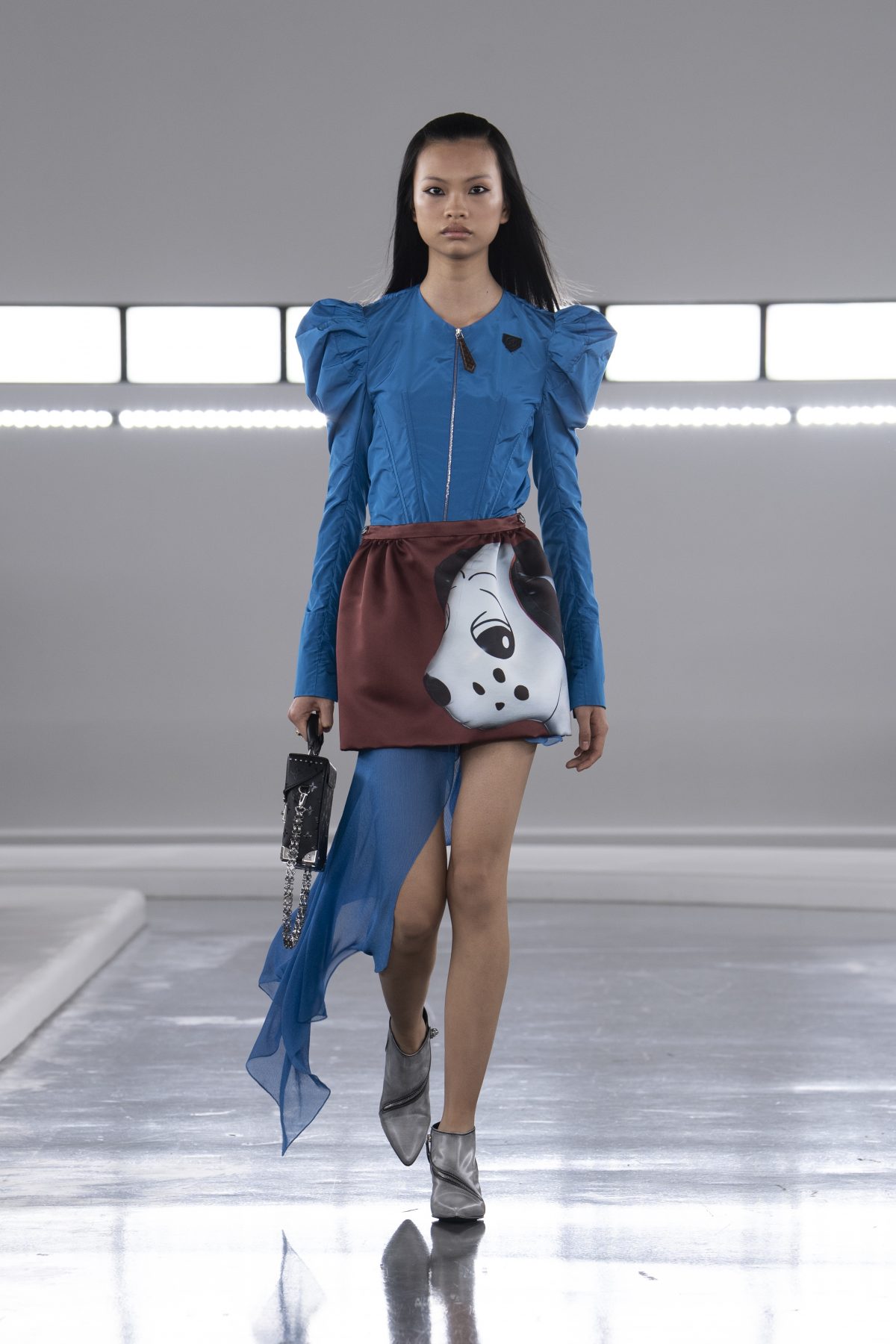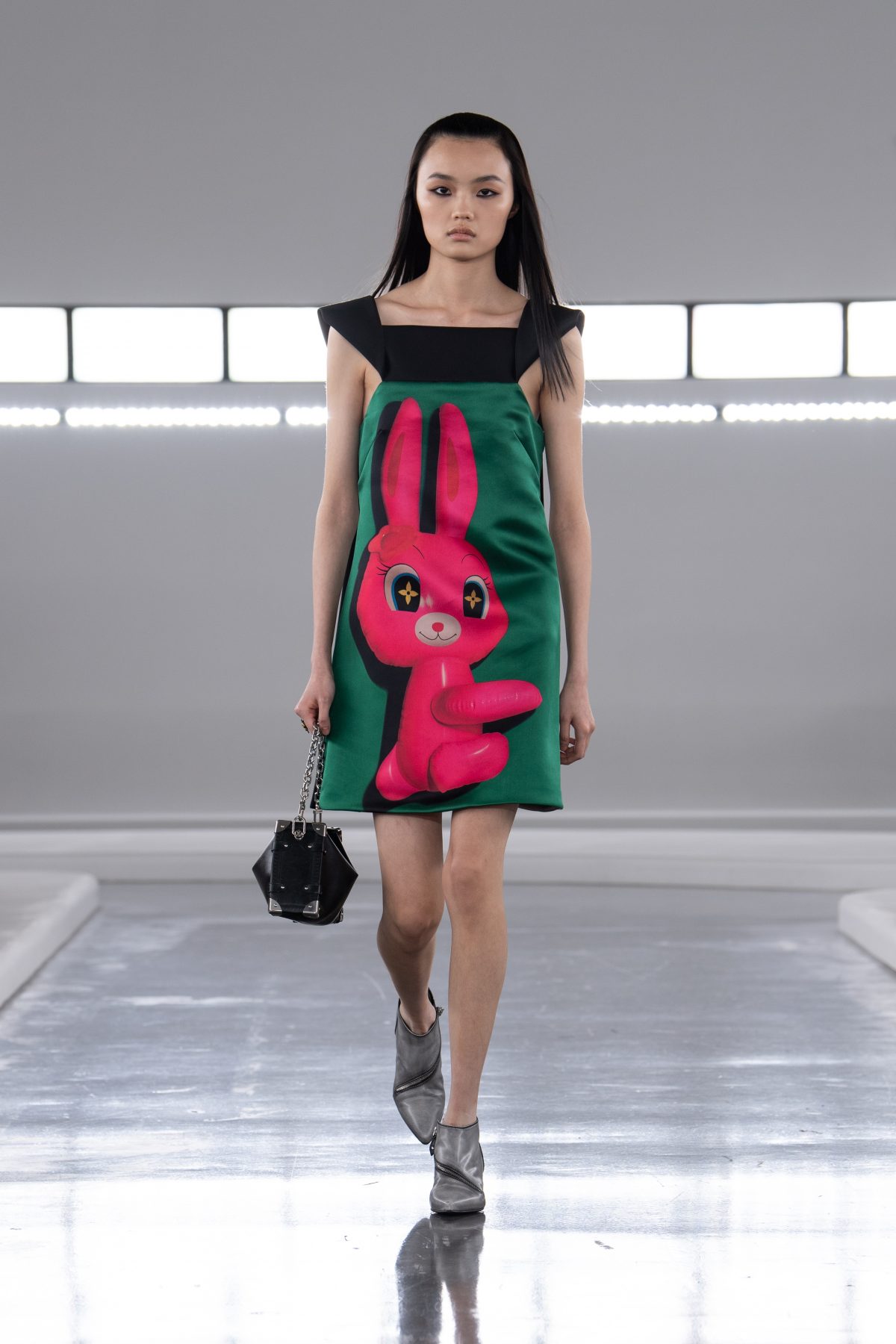 在雙方的合作過程中,孫一鈿意趣盎然的巨型藝術作品化作大膽奪目的印花或刺繡圖案,點綴各款時裝,與Louis Vuitton女裝系列藝術總監Nicolas Ghesquière設計的早秋造型完美呼應。本季系列Nicolas Ghesquière在流暢廓形的緞面連身裙上,融入企鵝、獵豹、粉紅兔子等元素,裙裝上部分被皮革腰帶包裹,或配襯帶有雕塑感的泡泡袖襯衫裙,將女性身上的率性瀟灑與內核的浪漫童趣映現出來。