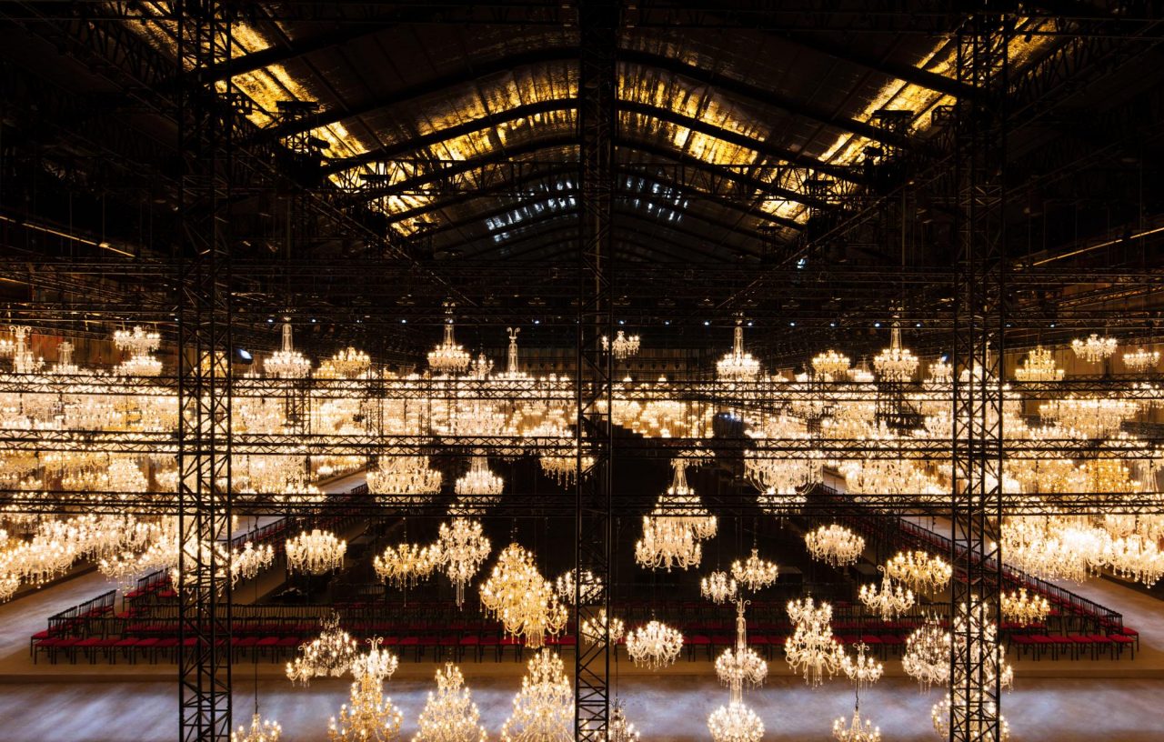 Louis Vuitton 在巴黎舉行的那場時裝展,讓人津津樂道的必然是其主題場景,當時 分別在博物館庭園內三個展廳黎塞留通道(Passage Richelieu)、杜爾哥閣(Peristyle Turgot)和柯爾貝閣(Peristyle Colbert) 舉行;從黎塞留通道兩旁可以看到內馬利中庭(Cour Marly)和皮熱中庭(Cour Puget),兩個中庭均採用紅色燈光。當中黎塞留通道的柱子之間設有鏡子,時裝展天橋上方則懸掛高低錯落的吊燈,構成了一種既神秘又懸疑的展場環境。那麼,品牌又如何將這股澎湃的氣勢搬來到上海?答案就是直接在黃埔江旁架出一座懸掛 1200 盞水晶吊燈,延續這份奇幻驚艷的氛圍。