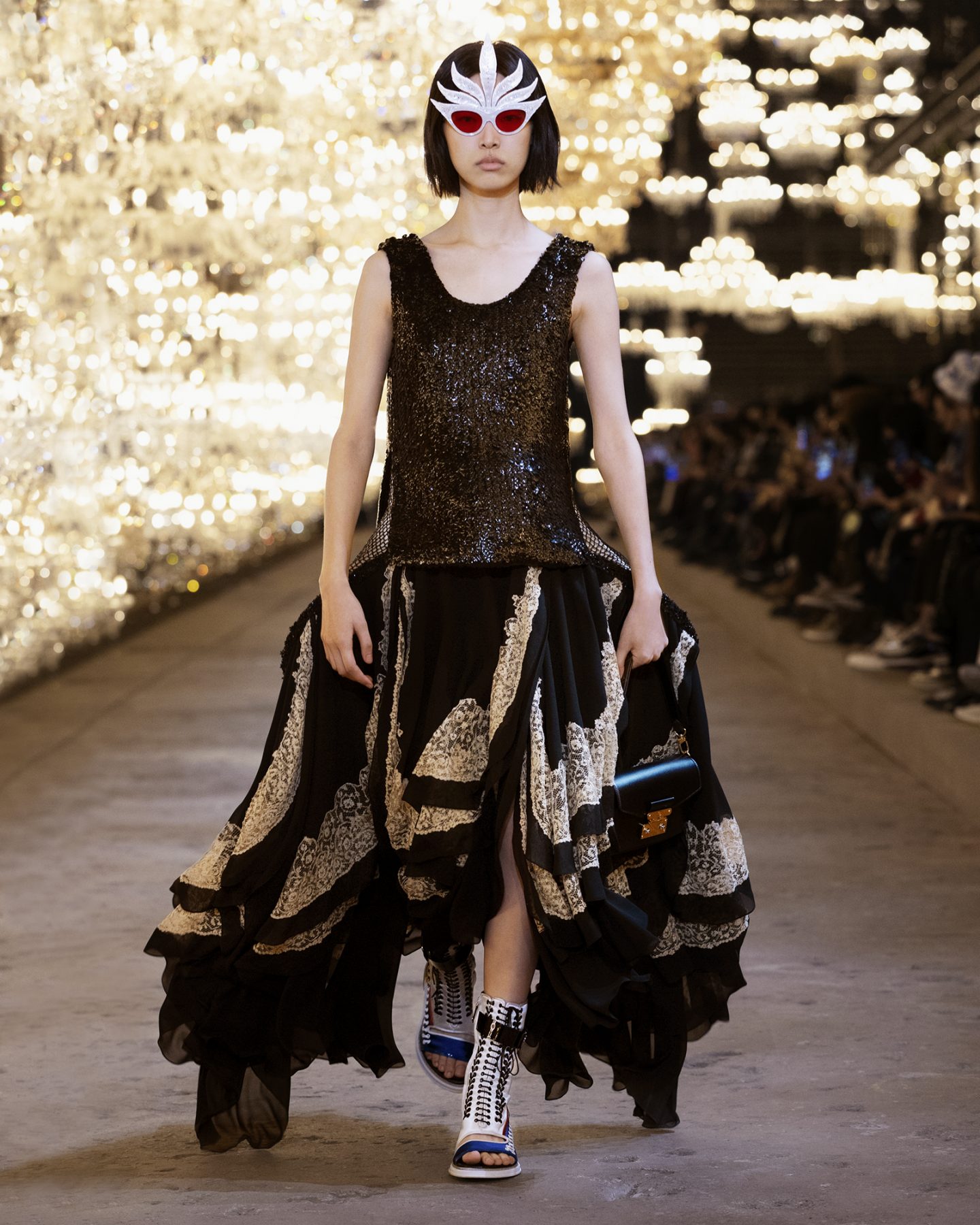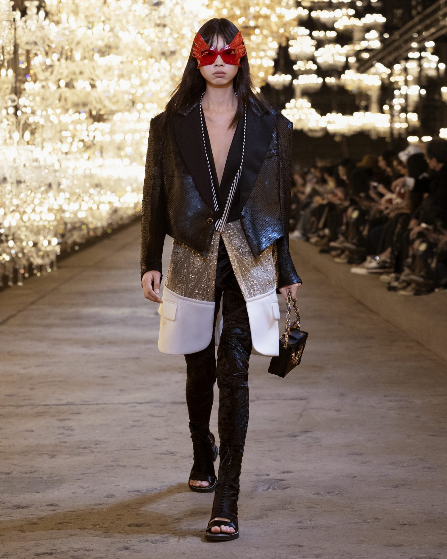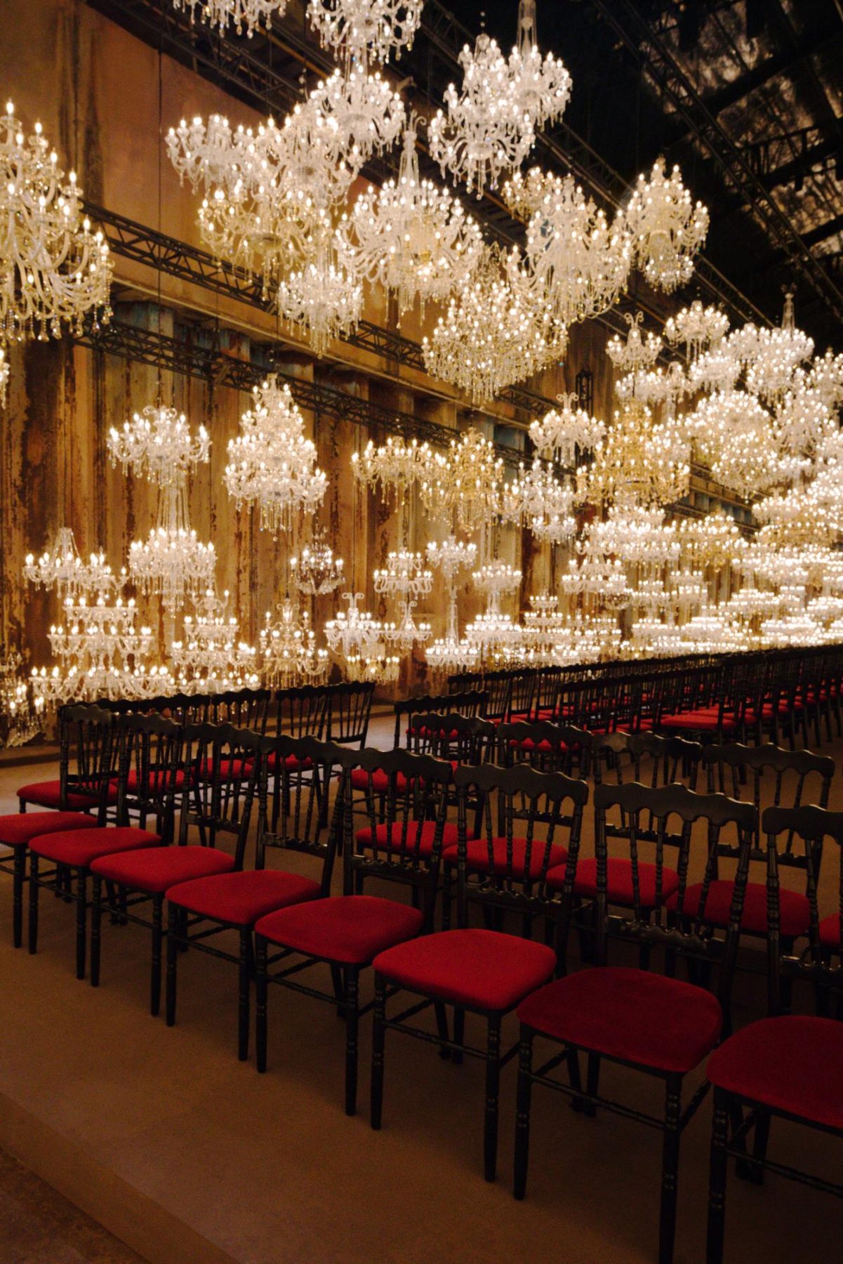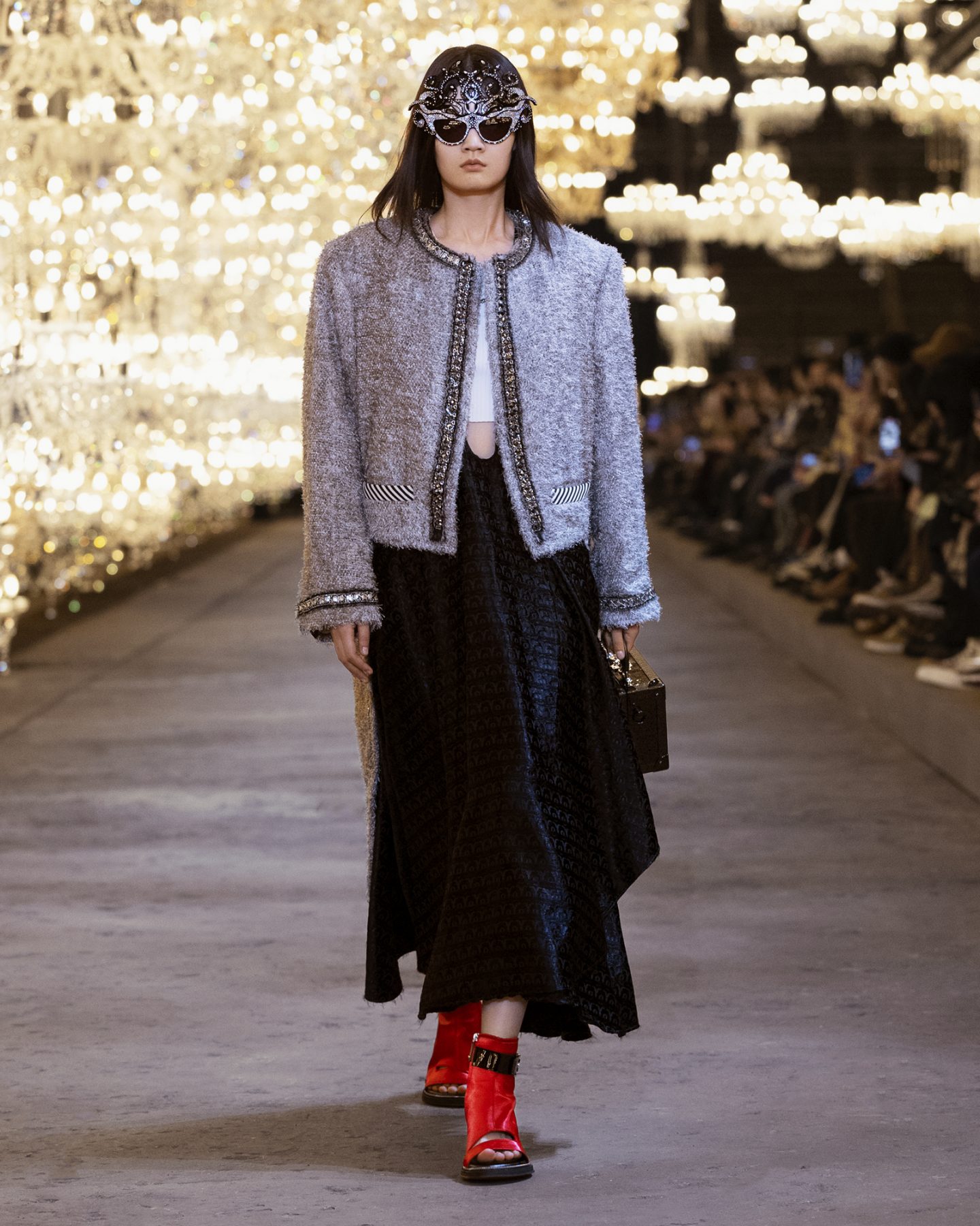 Louis Vuitton 在巴黎舉行的那場時裝展,讓人津津樂道的必然是其主題場景,當時 分別在博物館庭園內三個展廳黎塞留通道(Passage Richelieu)、杜爾哥閣(Peristyle Turgot)和柯爾貝閣(Peristyle Colbert) 舉行;從黎塞留通道兩旁可以看到內馬利中庭(Cour Marly)和皮熱中庭(Cour Puget),兩個中庭均採用紅色燈光。當中黎塞留通道的柱子之間設有鏡子,時裝展天橋上方則懸掛高低錯落的吊燈,構成了一種既神秘又懸疑的展場環境。那麼,品牌又如何將這股澎湃的氣勢搬來到上海?答案就是直接在黃埔江旁架出一座懸掛 1200 盞水晶吊燈,延續這份奇幻驚艷的氛圍。