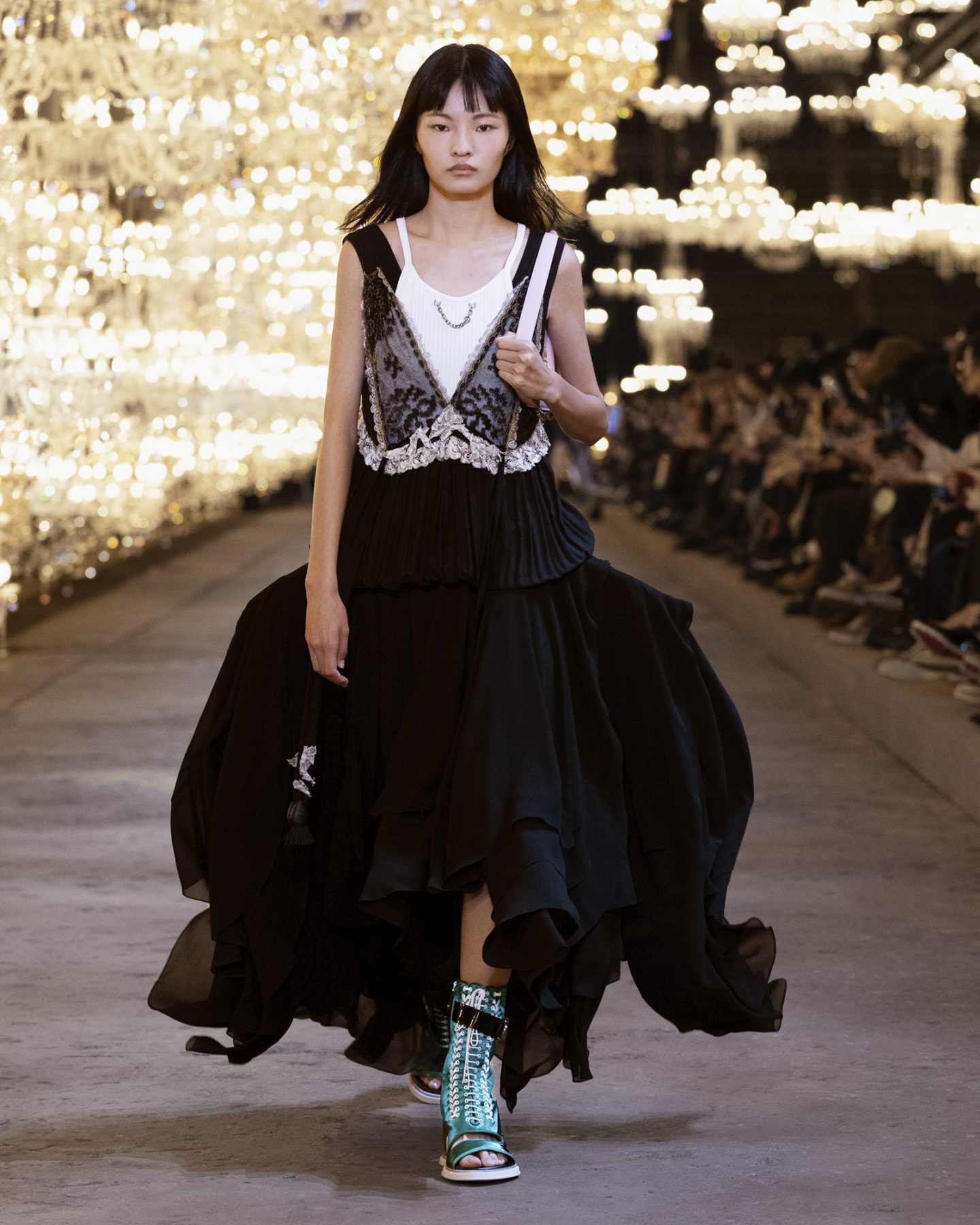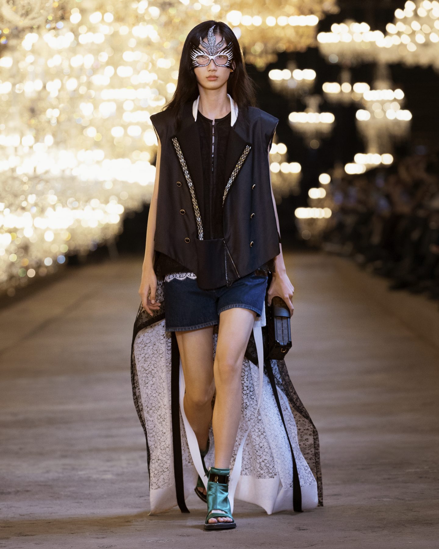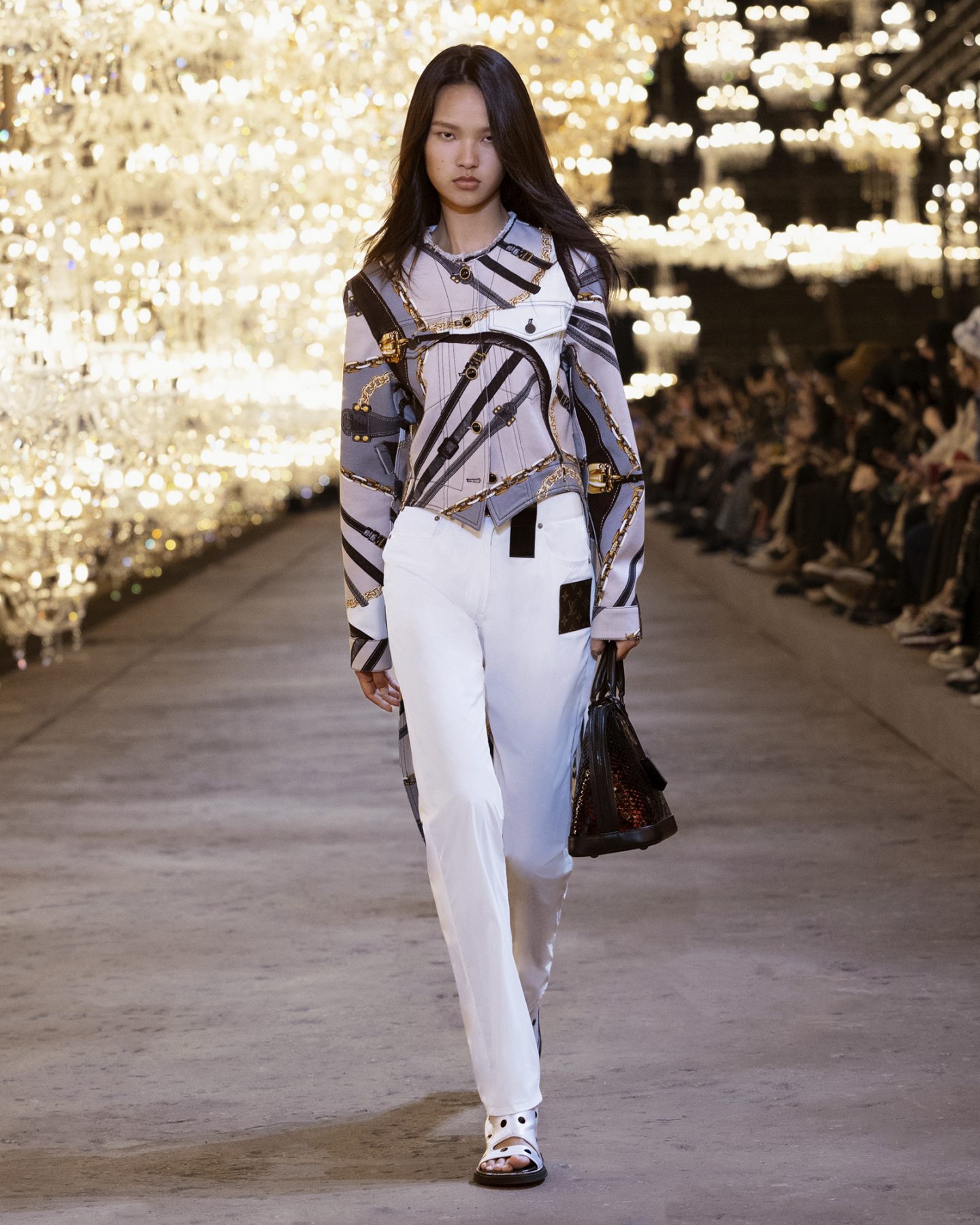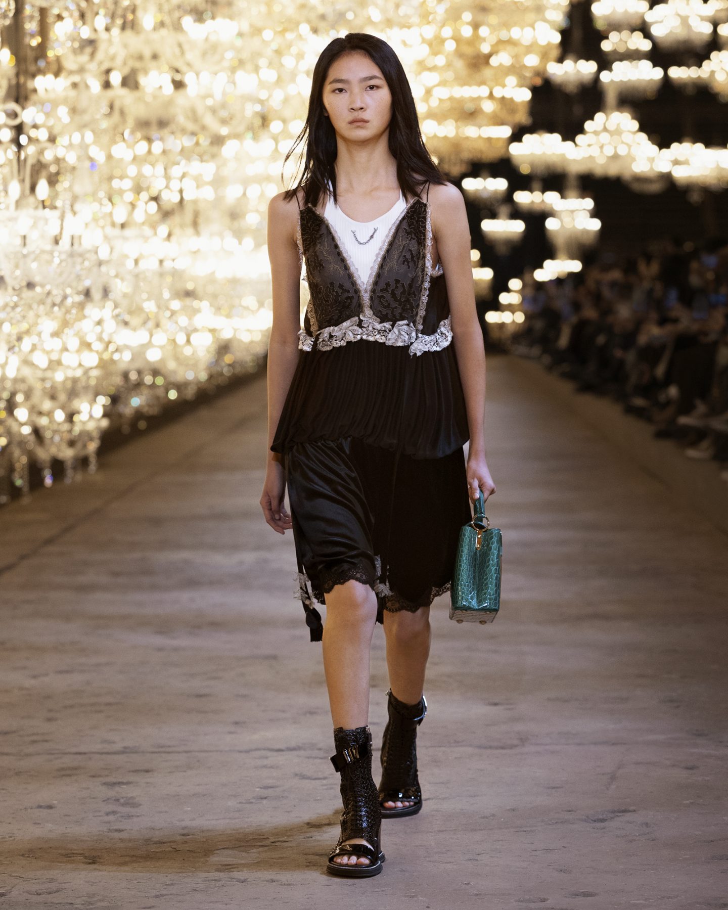 Louis Vuitton 在巴黎舉行的那場時裝展,讓人津津樂道的必然是其主題場景,當時 分別在博物館庭園內三個展廳黎塞留通道(Passage Richelieu)、杜爾哥閣(Peristyle Turgot)和柯爾貝閣(Peristyle Colbert) 舉行;從黎塞留通道兩旁可以看到內馬利中庭(Cour Marly)和皮熱中庭(Cour Puget),兩個中庭均採用紅色燈光。當中黎塞留通道的柱子之間設有鏡子,時裝展天橋上方則懸掛高低錯落的吊燈,構成了一種既神秘又懸疑的展場環境。那麼,品牌又如何將這股澎湃的氣勢搬來到上海?答案就是直接在黃埔江旁架出一座懸掛 1200 盞水晶吊燈,延續這份奇幻驚艷的氛圍。