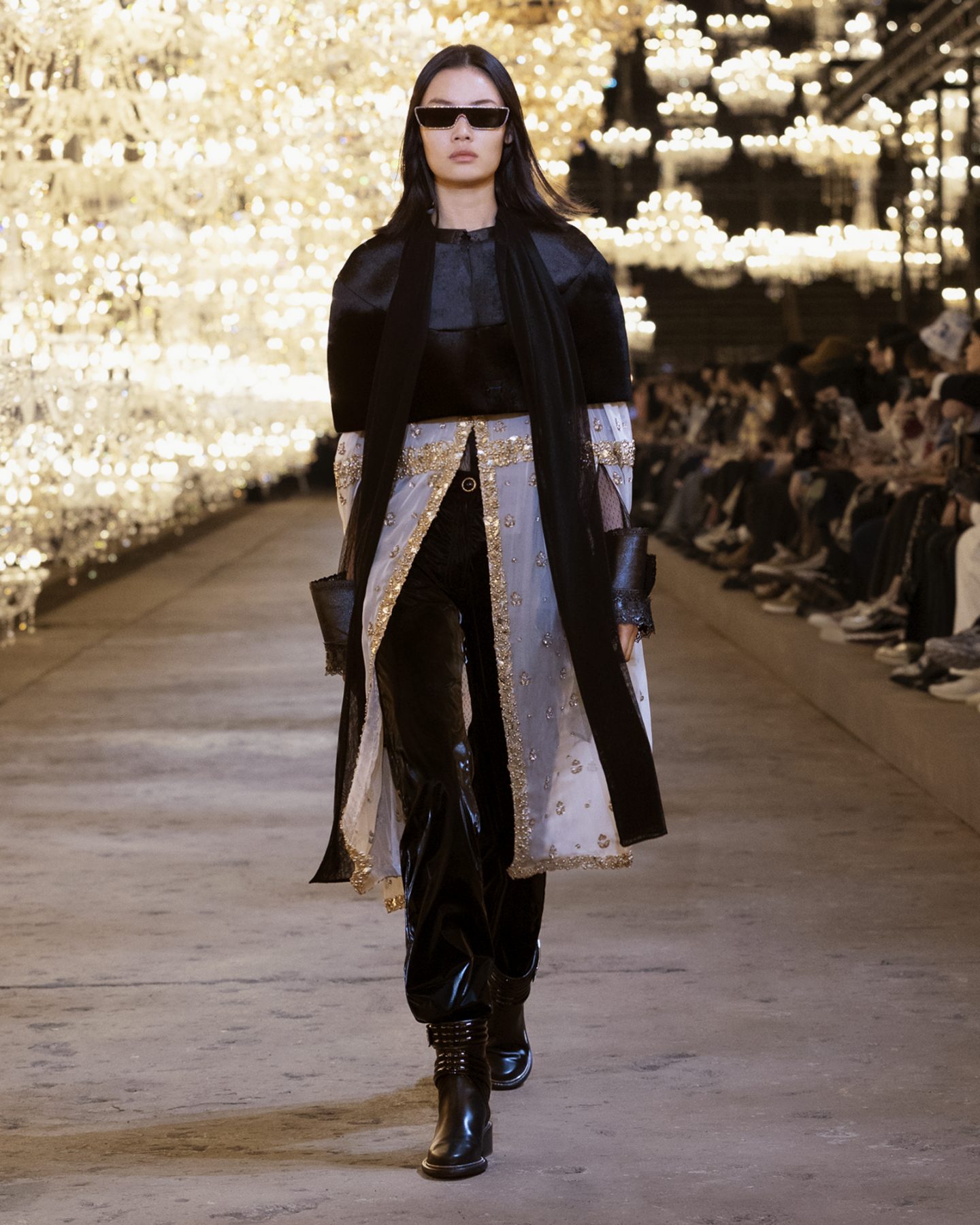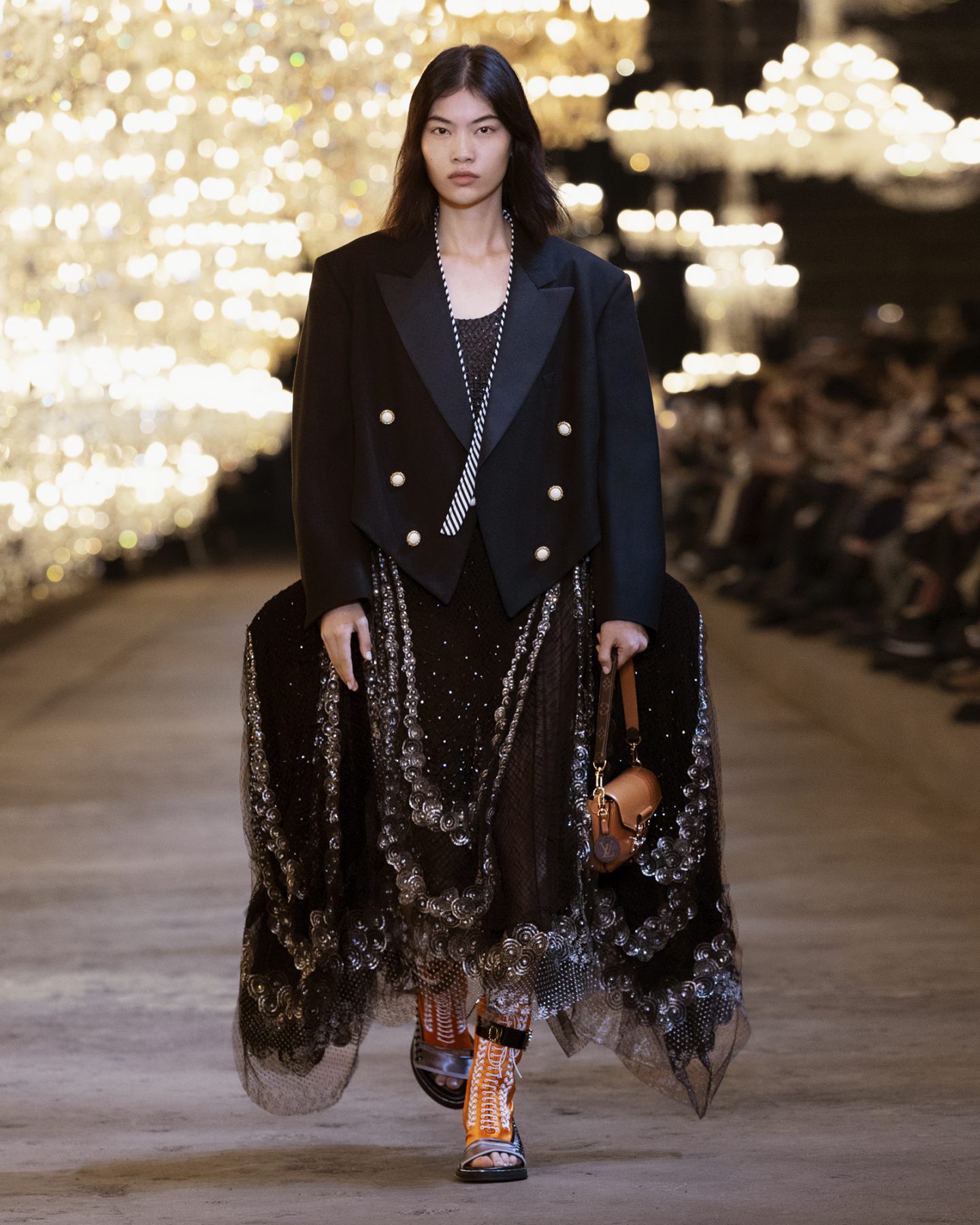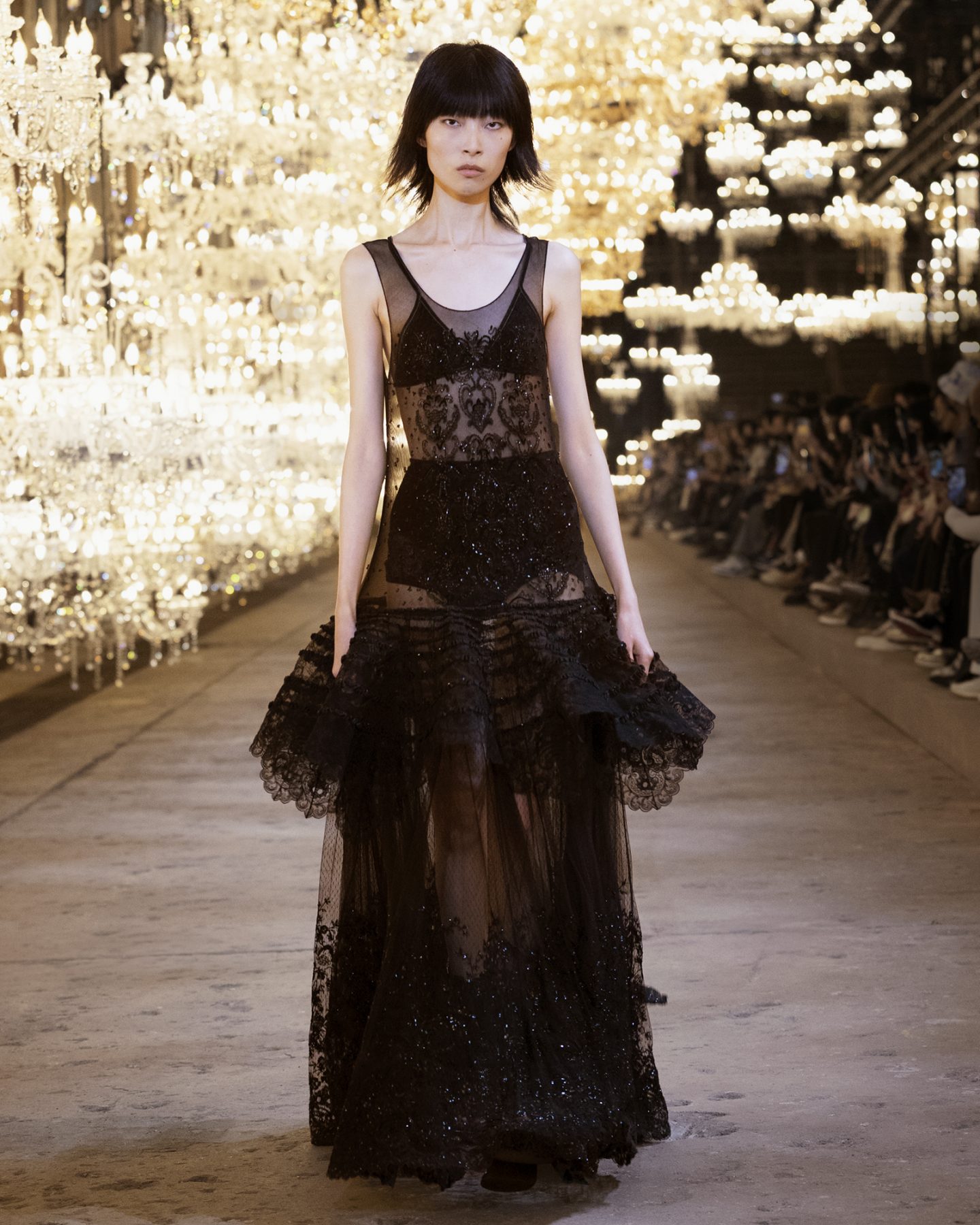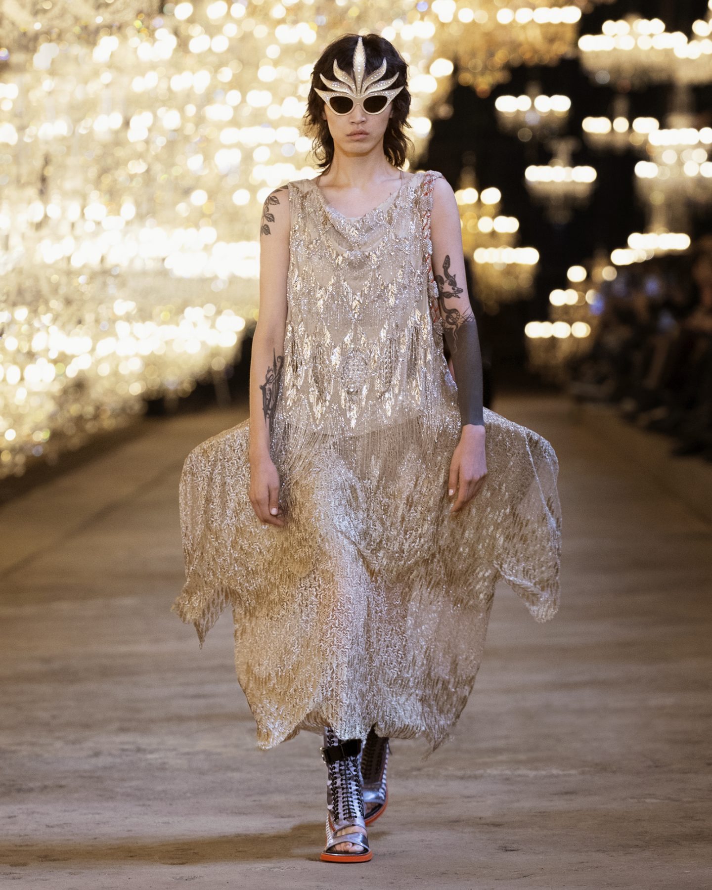 Louis Vuitton 在巴黎舉行的那場時裝展,讓人津津樂道的必然是其主題場景,當時 分別在博物館庭園內三個展廳黎塞留通道(Passage Richelieu)、杜爾哥閣(Peristyle Turgot)和柯爾貝閣(Peristyle Colbert) 舉行;從黎塞留通道兩旁可以看到內馬利中庭(Cour Marly)和皮熱中庭(Cour Puget),兩個中庭均採用紅色燈光。當中黎塞留通道的柱子之間設有鏡子,時裝展天橋上方則懸掛高低錯落的吊燈,構成了一種既神秘又懸疑的展場環境。那麼,品牌又如何將這股澎湃的氣勢搬來到上海?答案就是直接在黃埔江旁架出一座懸掛 1200 盞水晶吊燈,延續這份奇幻驚艷的氛圍。