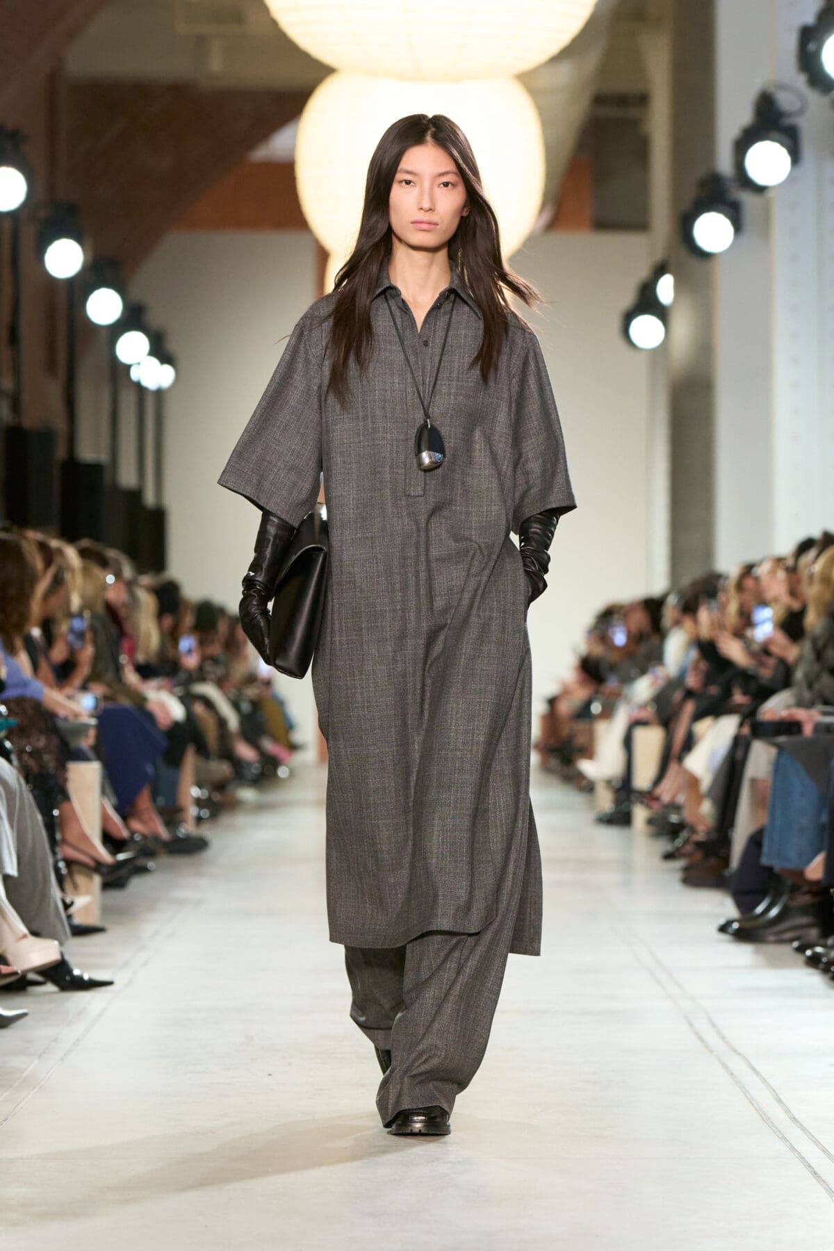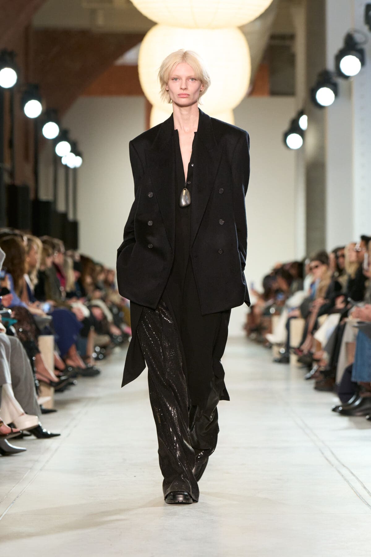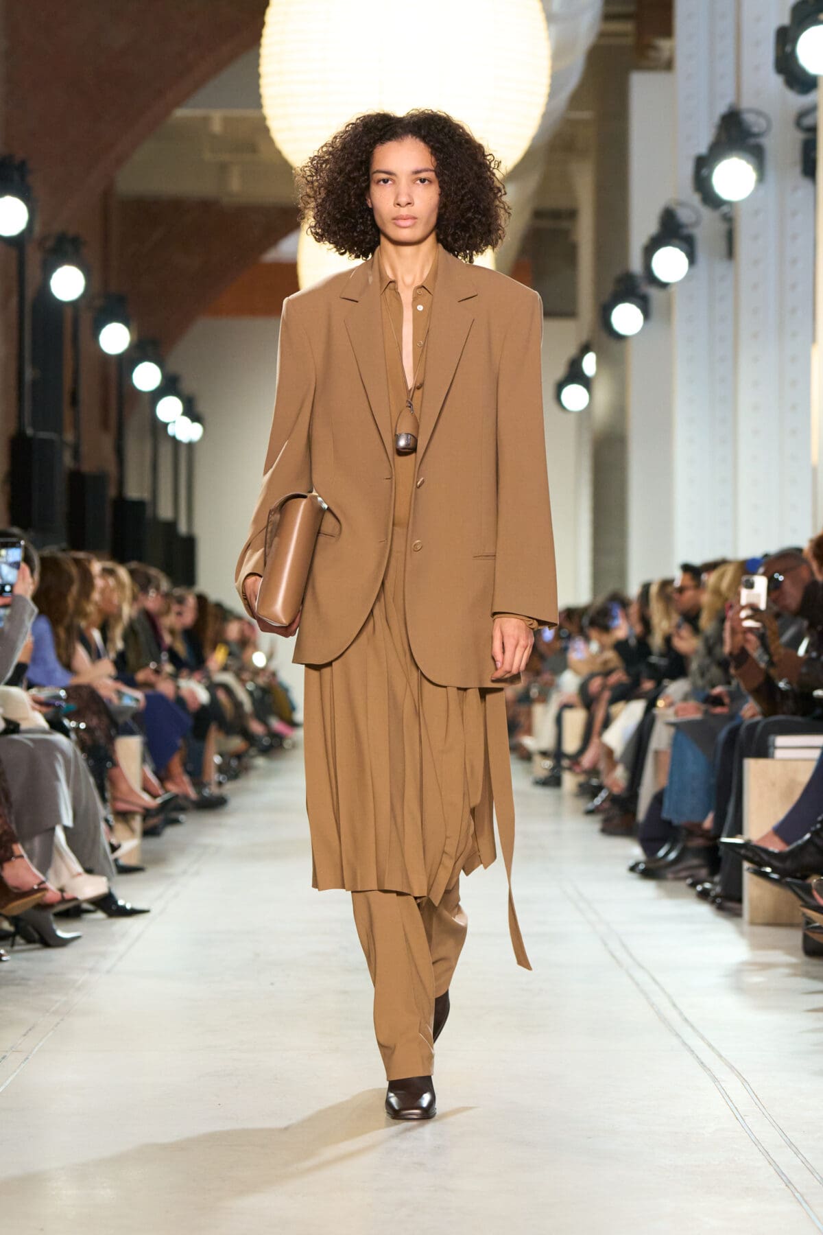 於是?Michael Kors 將目光投放在實際來自紐約街頭的造型,打造出 「紐約式的隨性優雅」。在 2025 秋冬系列的 moodboard 上是各種打扮隨心優雅的女人——從 90 年代身穿 oversized 黑色大衣 Uma Thurman(她同樣亮相今季前排)、70年代的 Lauren Hutton 的風衣造型,2000 年初身穿男士西裝的 Sharon Stone 以至是以慵懶風衣閃避狗仔的 Zoe Kravitz 等⋯⋯各位打扮悠閒自在的女性,以及每個紐約人家中的那份悠閒與放鬆,成為了本季的重要靈感。