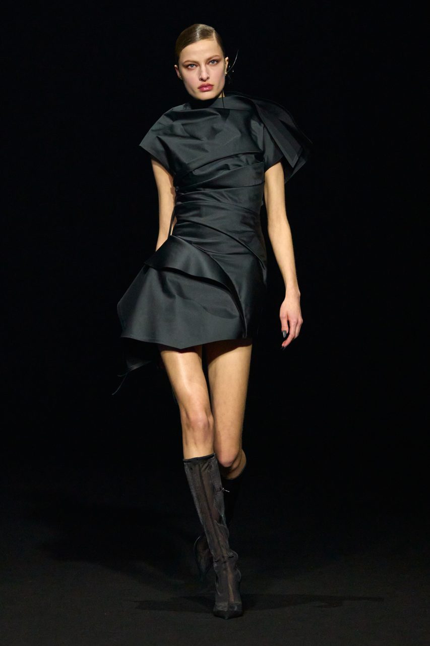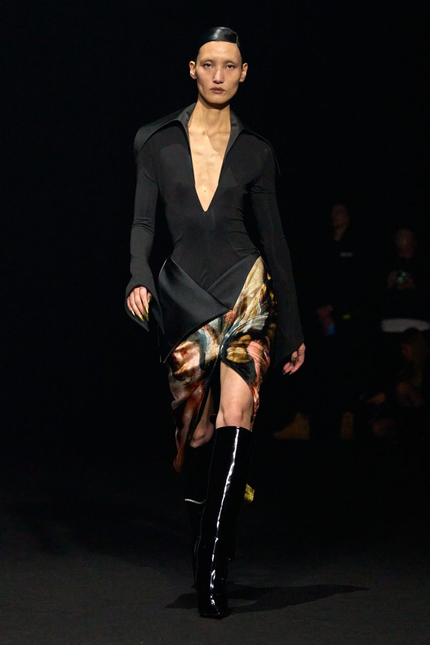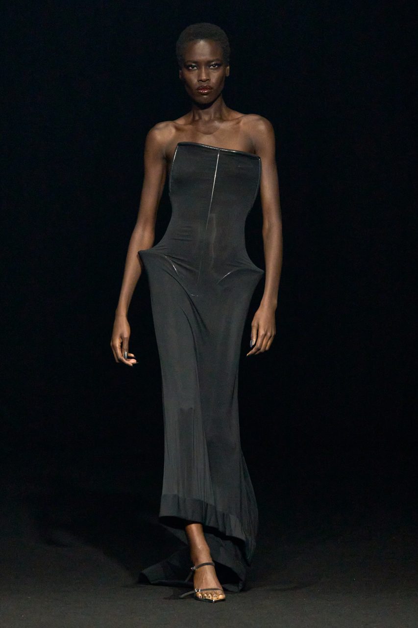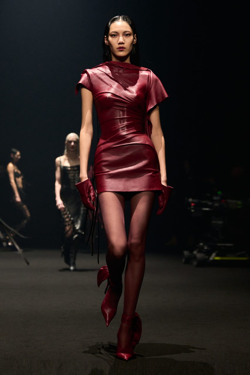 Casey Cadwallader的第一部分作品借鑒了Mugler 20世紀80年代的設計系列,透視薄紗緊身衣略帶垂墜感地包裹身體,隨著模特兒的行走淋漓盡致展現凌厲線條和精良剪裁。皮革洋裝採用不對稱設計,恰到好處地展露肌膚,配合皮革的褶皺細節展露強大氣場。