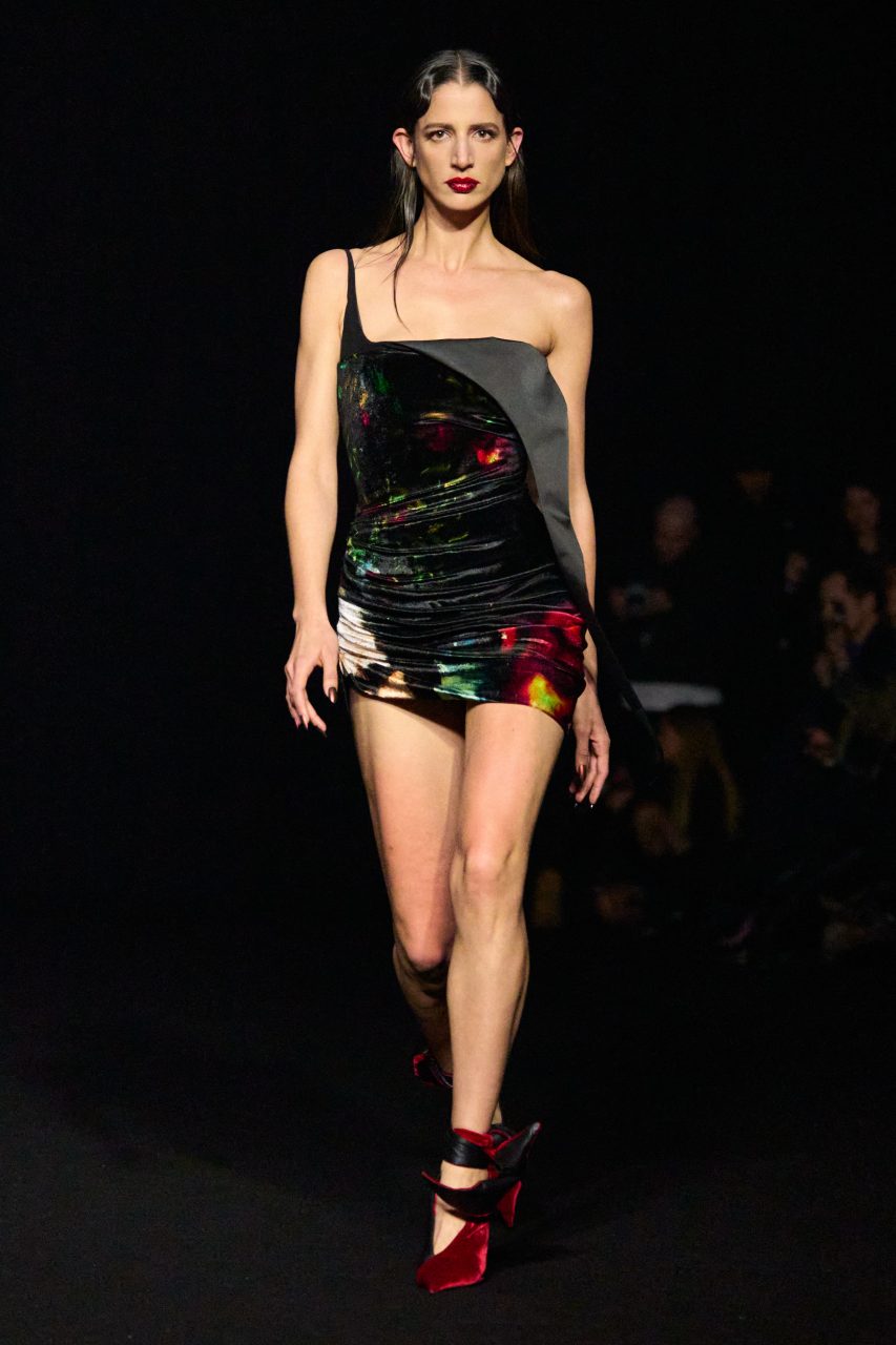 Mugler 2024秋冬系列時裝展在巴黎一所學校的體育館發佈,時裝騷將時尚與表演藝術融為一體,分成三個部分,巨大的紅色幕布和煙霧機的渲染令現場呈現神秘暗黑的氛圍。設計師Casey Cadwallader受到Mugler Archive的啟發,透過戲劇感的演繹方式向Mugler超凡脫俗的品牌形象致敬。