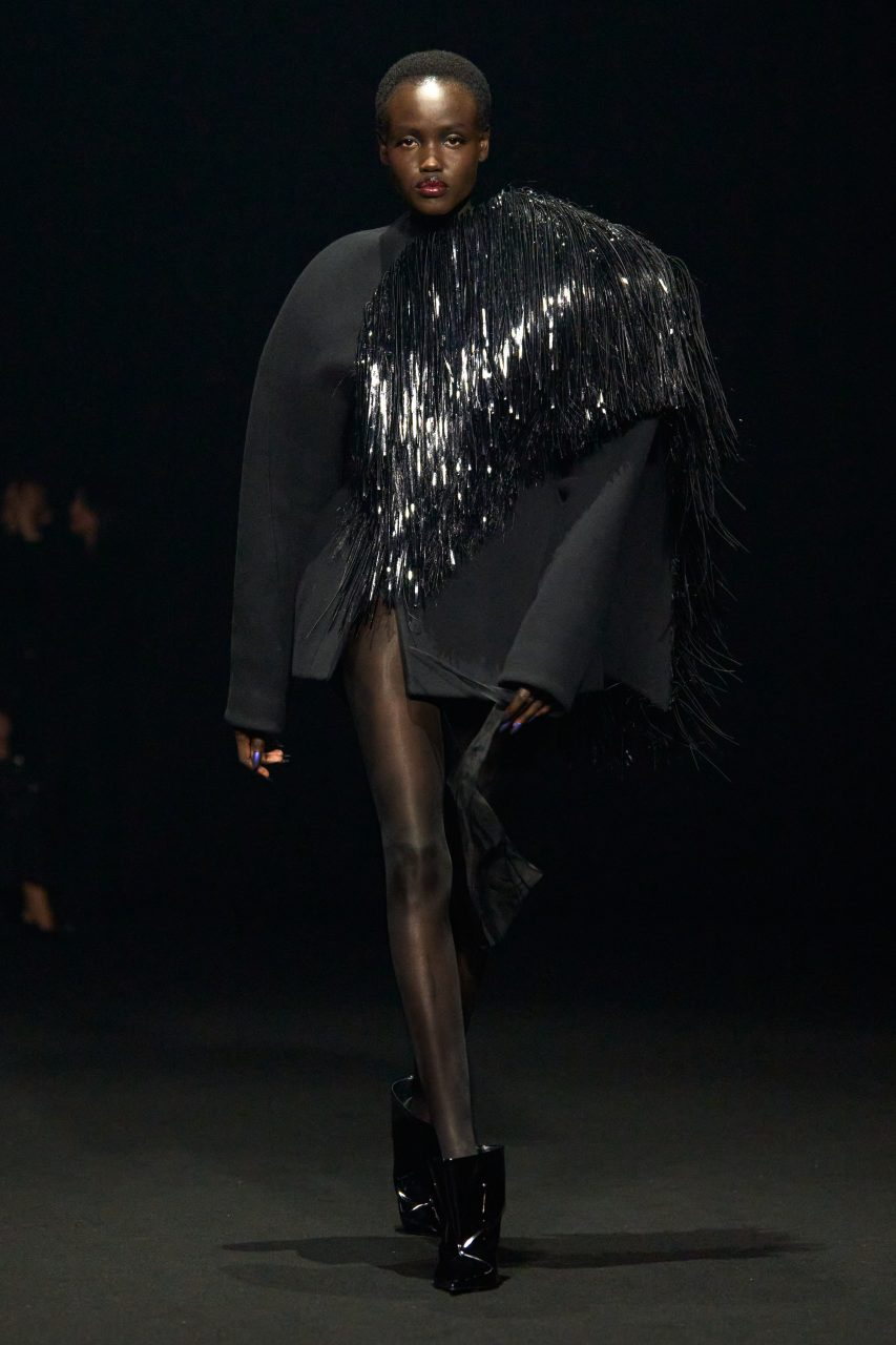 Casey Cadwallader透過建築感廓形為最後一部分的晚裝設計增加了華麗感,墊肩設計與褶皺細節巧妙融合,將曼妙身材勾勒得恰到好處。繭形大衣的肩膀處搭載一片巨大的流蘇,於行走間飛揚,呈現飄逸靈動效果,凸顯著剛勁與柔和線條的對比。