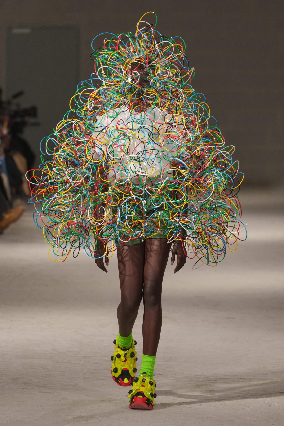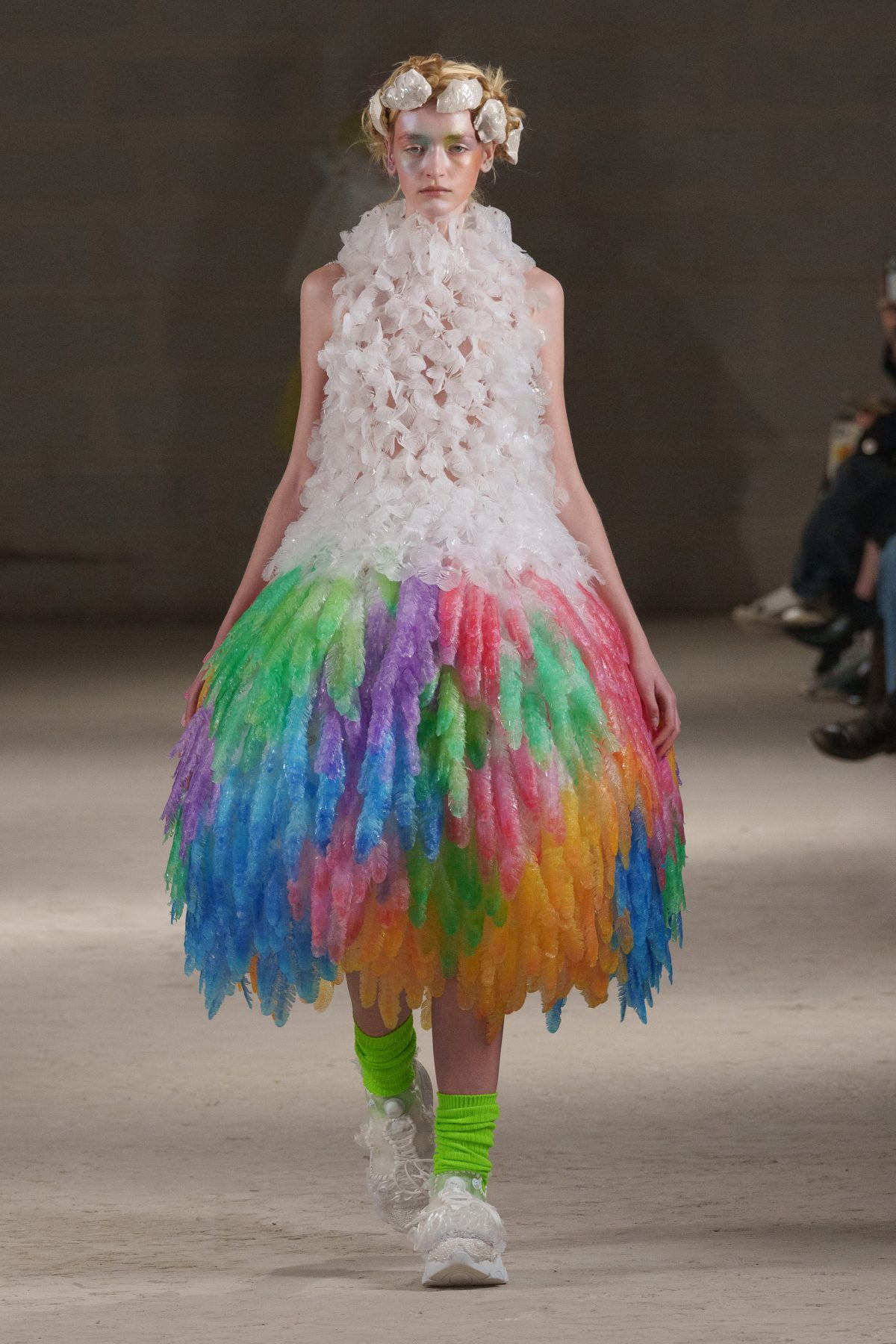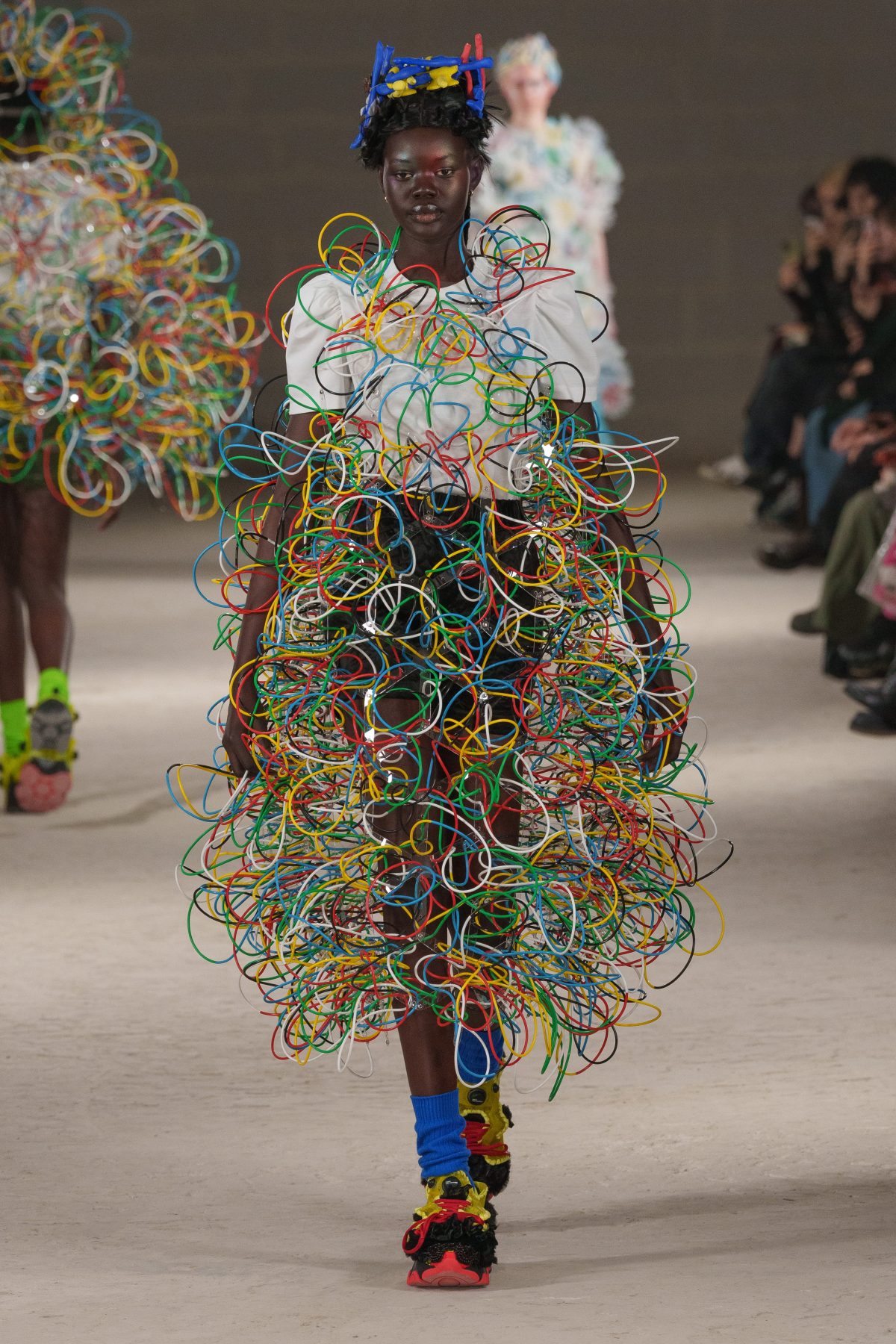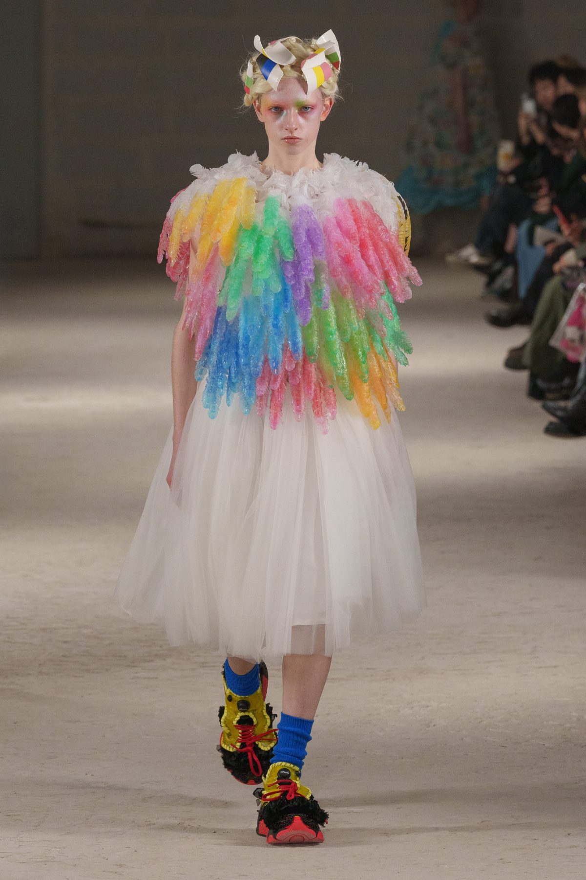 前兩款作品模特兒被彩色塑料線圈環繞,令人聯想到纏繞的電線,凌亂而富有韻律。隨後電線圈透過折扭的形式,變成花朵的輪廓,與薄紗相輔相成,營造出夢幻的氛圍感。宛若彩虹般的羽毛在薄紗裙上進行堆疊,搭載建築感裙擺,頌讚色彩與工藝之美。設計師Kei Ninomiya將絨毛與薄紗進行巧妙搭配,團狀的絨毛被染成糖果色,與輕盈感粉色紗裙相得益彰,於行走之間流露甜美氣息。紙花透過不同形式進行堆疊,呈現出立體生動的美感,而透明紙花以PVC材質呈現,透視效果彰顯精湛的制衣工藝。