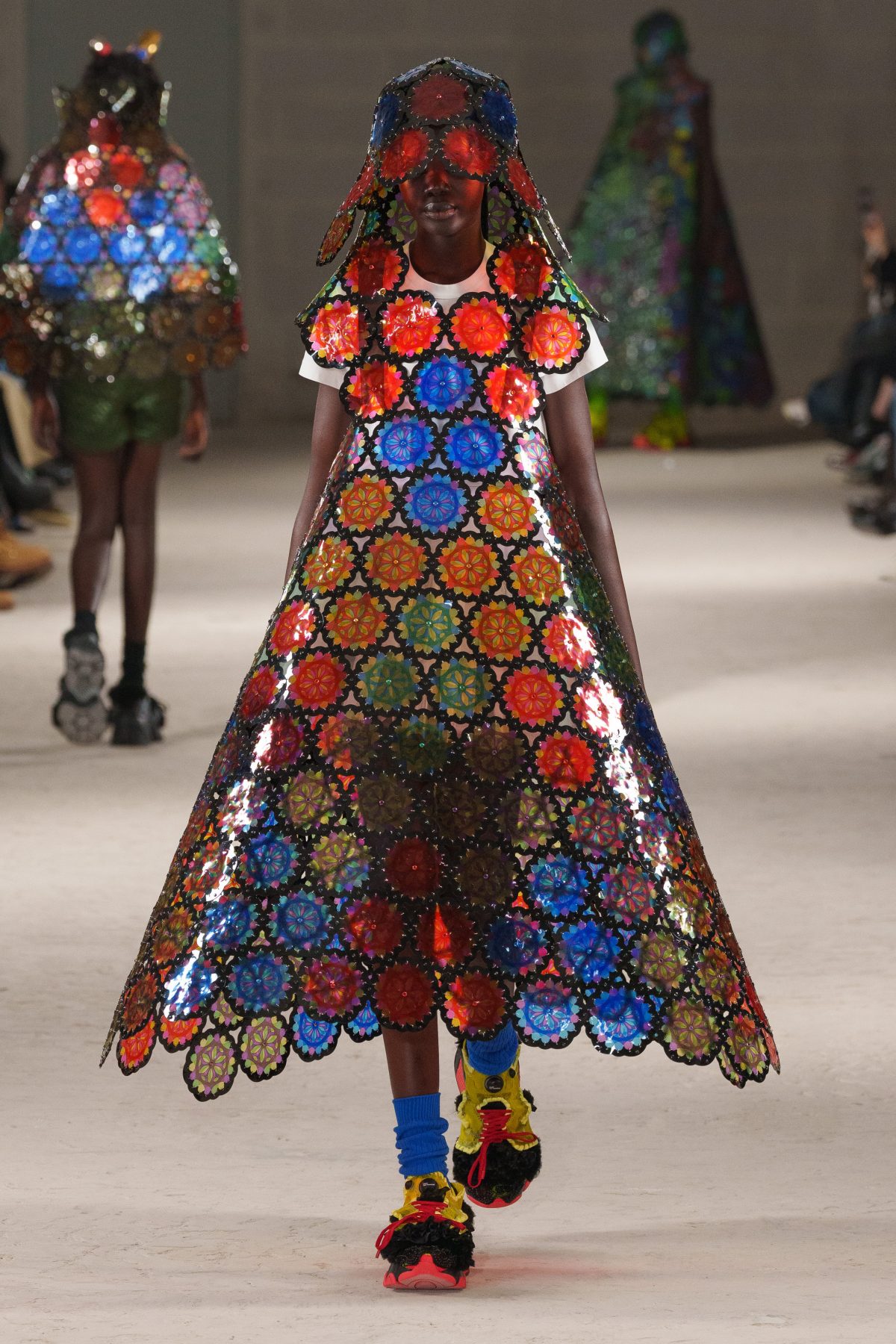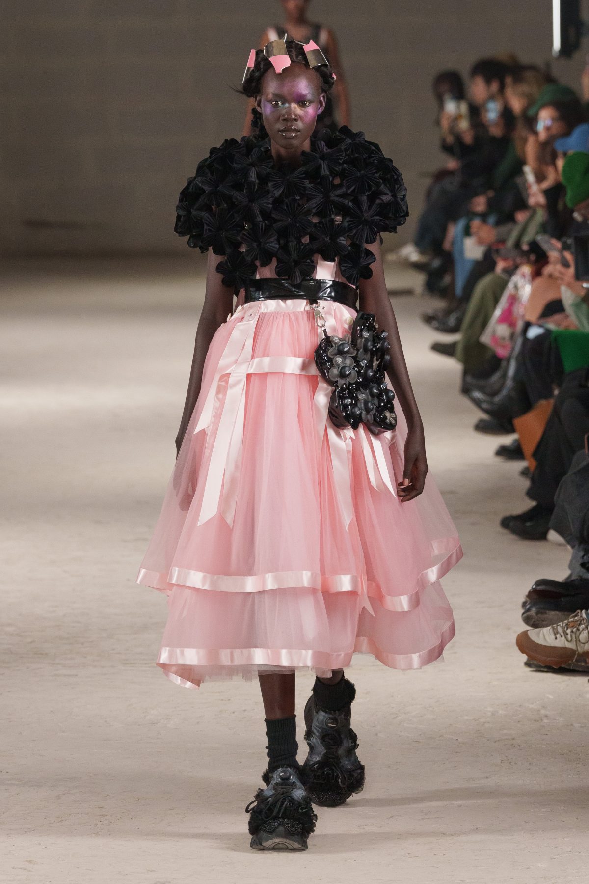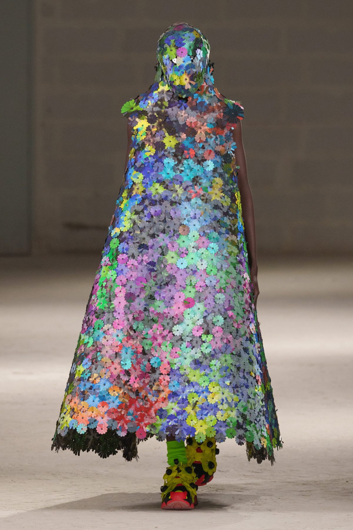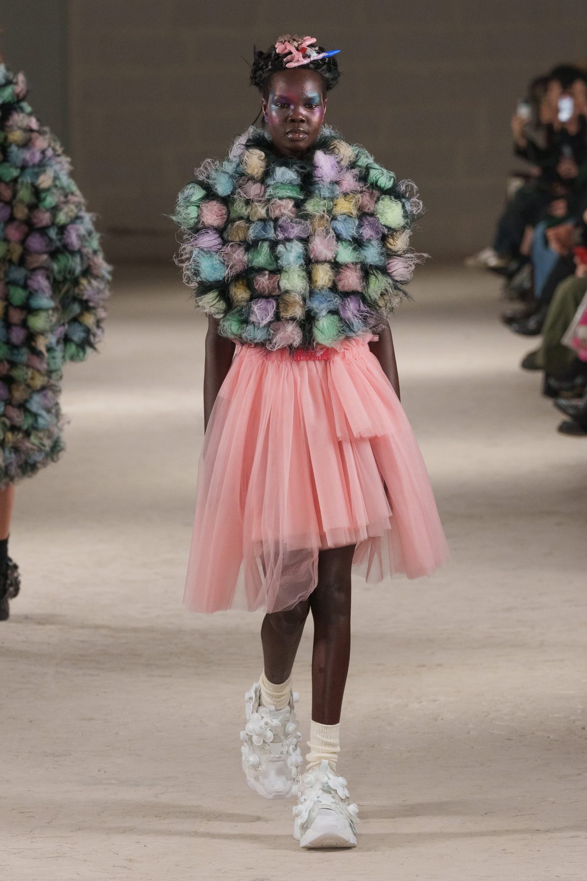 前兩款作品模特兒被彩色塑料線圈環繞,令人聯想到纏繞的電線,凌亂而富有韻律。隨後電線圈透過折扭的形式,變成花朵的輪廓,與薄紗相輔相成,營造出夢幻的氛圍感。宛若彩虹般的羽毛在薄紗裙上進行堆疊,搭載建築感裙擺,頌讚色彩與工藝之美。設計師Kei Ninomiya將絨毛與薄紗進行巧妙搭配,團狀的絨毛被染成糖果色,與輕盈感粉色紗裙相得益彰,於行走之間流露甜美氣息。紙花透過不同形式進行堆疊,呈現出立體生動的美感,而透明紙花以PVC材質呈現,透視效果彰顯精湛的制衣工藝。