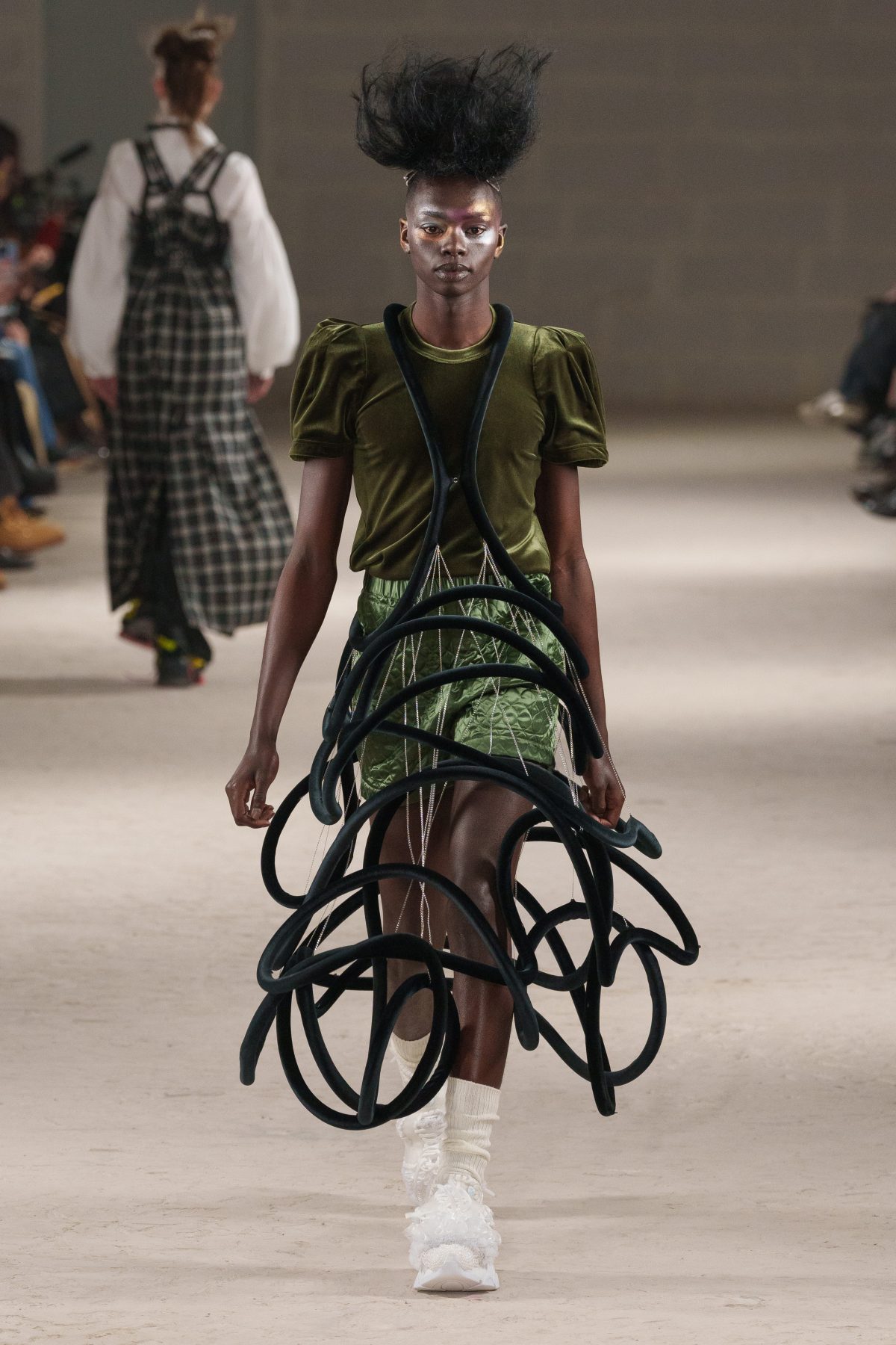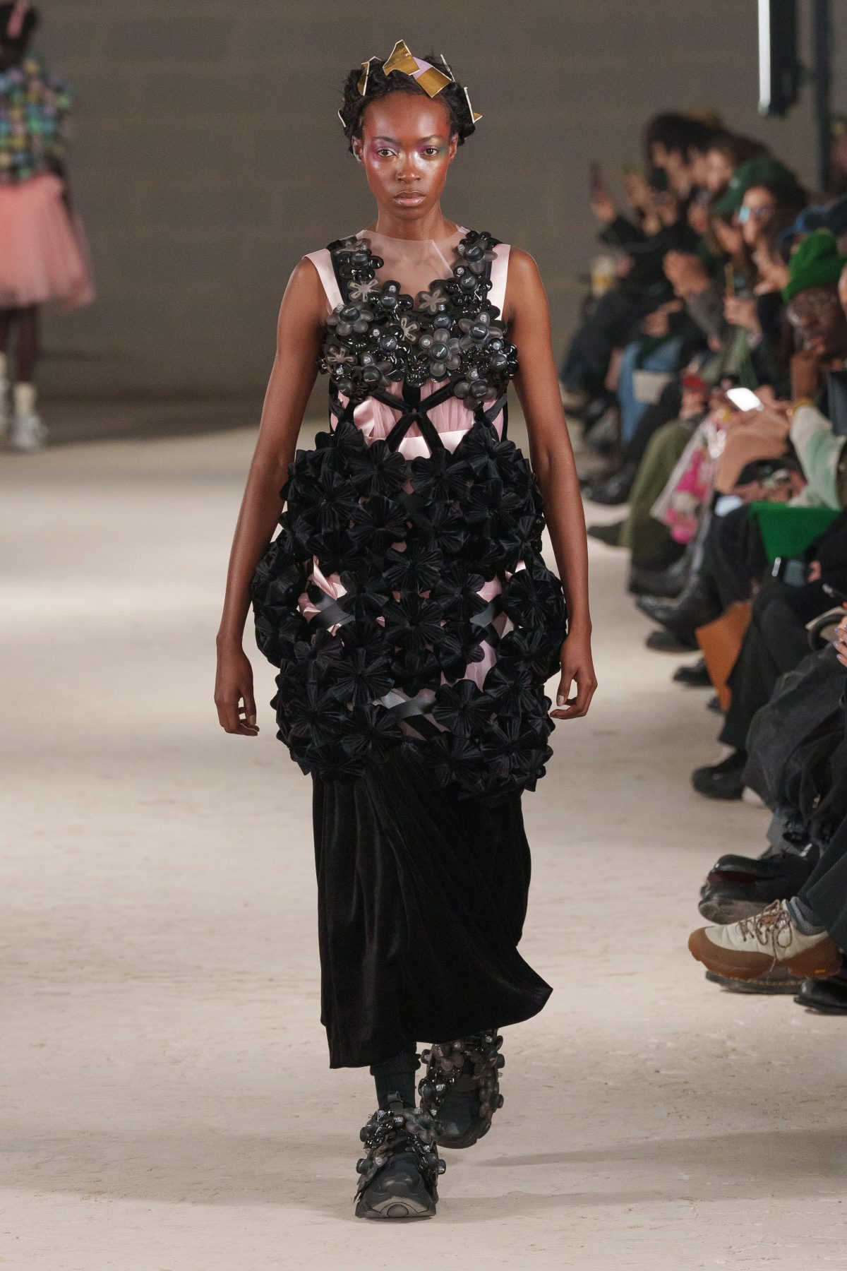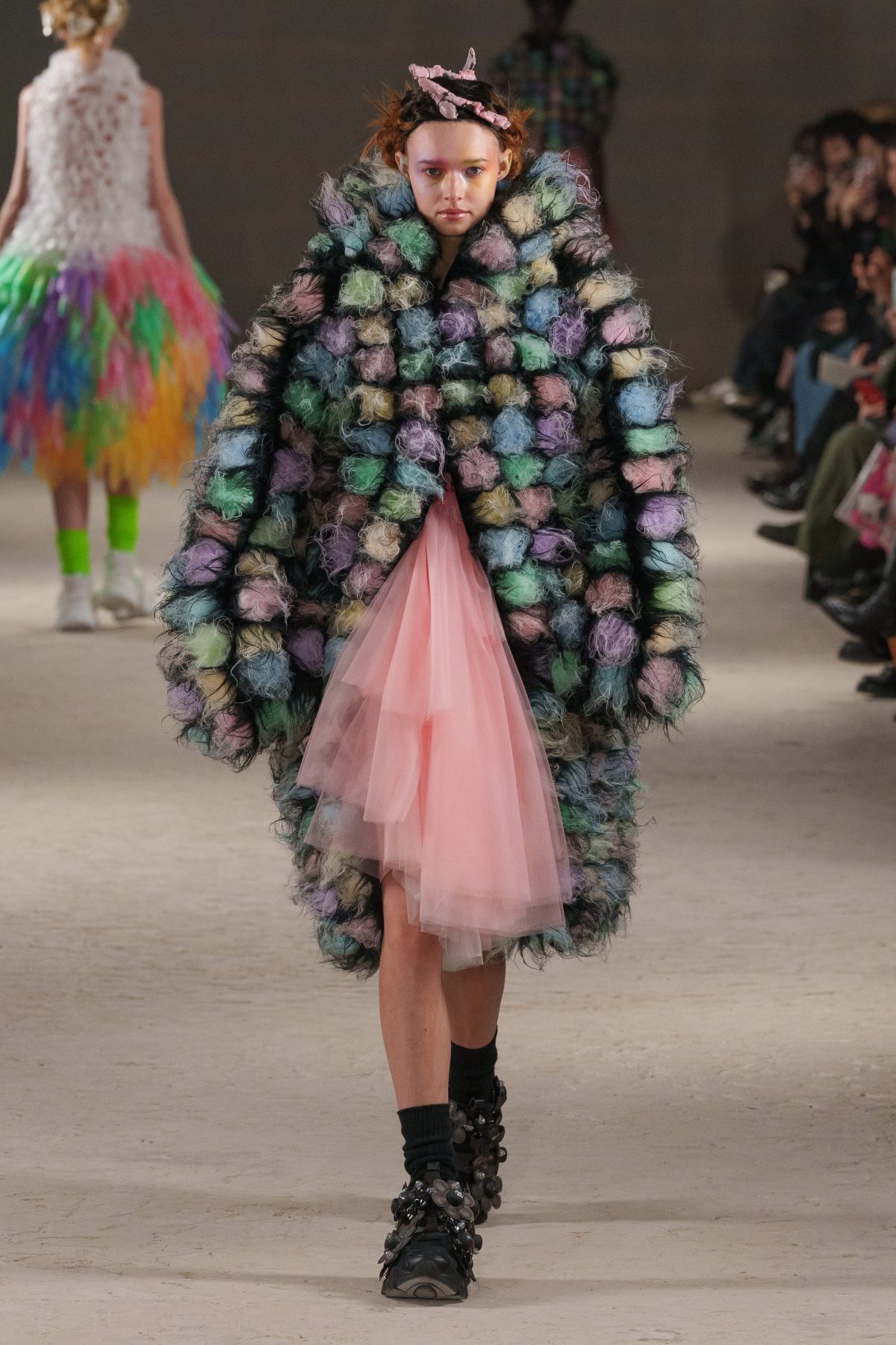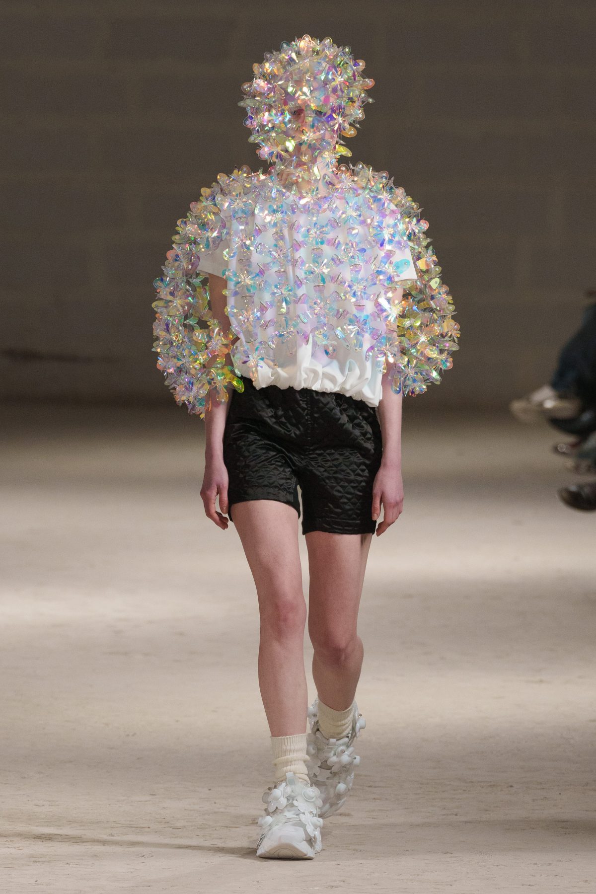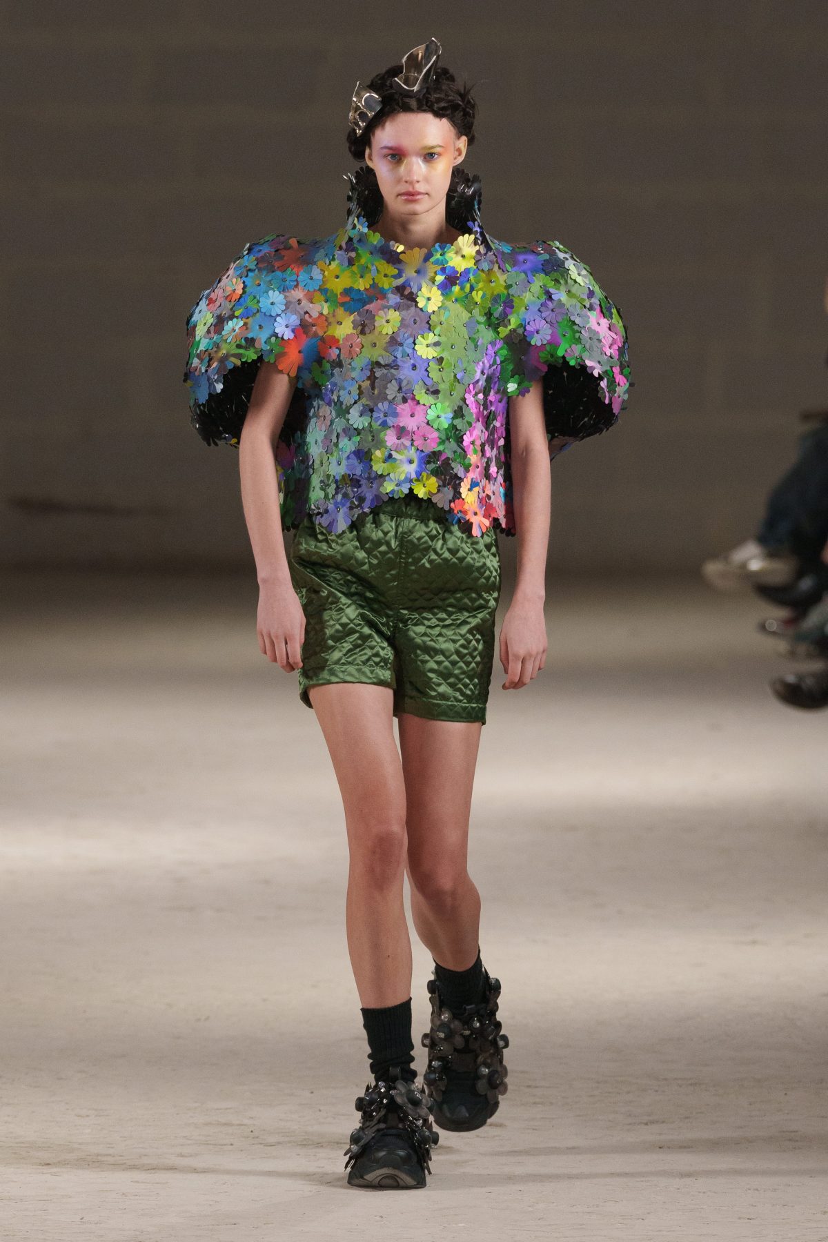 前兩款作品模特兒被彩色塑料線圈環繞,令人聯想到纏繞的電線,凌亂而富有韻律。隨後電線圈透過折扭的形式,變成花朵的輪廓,與薄紗相輔相成,營造出夢幻的氛圍感。宛若彩虹般的羽毛在薄紗裙上進行堆疊,搭載建築感裙擺,頌讚色彩與工藝之美。設計師Kei Ninomiya將絨毛與薄紗進行巧妙搭配,團狀的絨毛被染成糖果色,與輕盈感粉色紗裙相得益彰,於行走之間流露甜美氣息。紙花透過不同形式進行堆疊,呈現出立體生動的美感,而透明紙花以PVC材質呈現,透視效果彰顯精湛的制衣工藝。