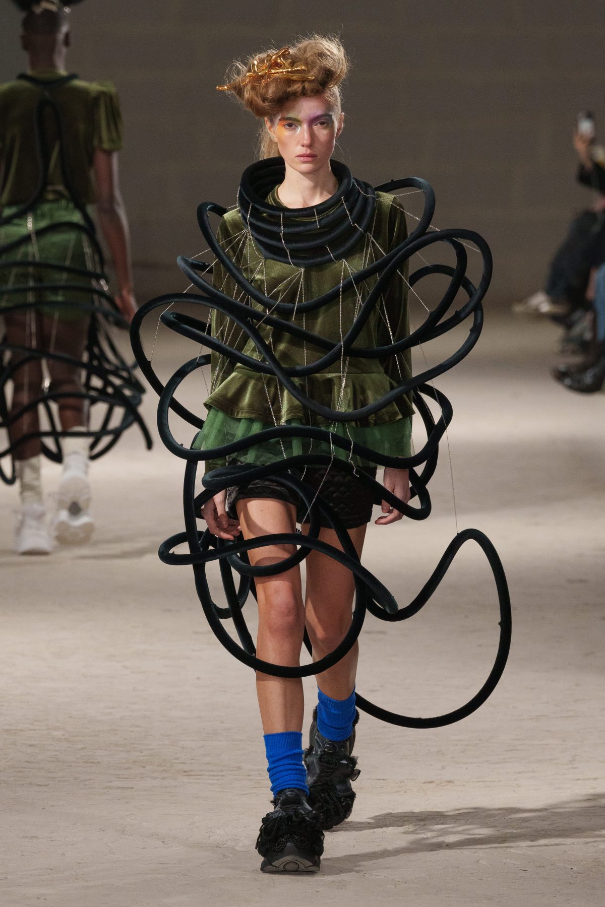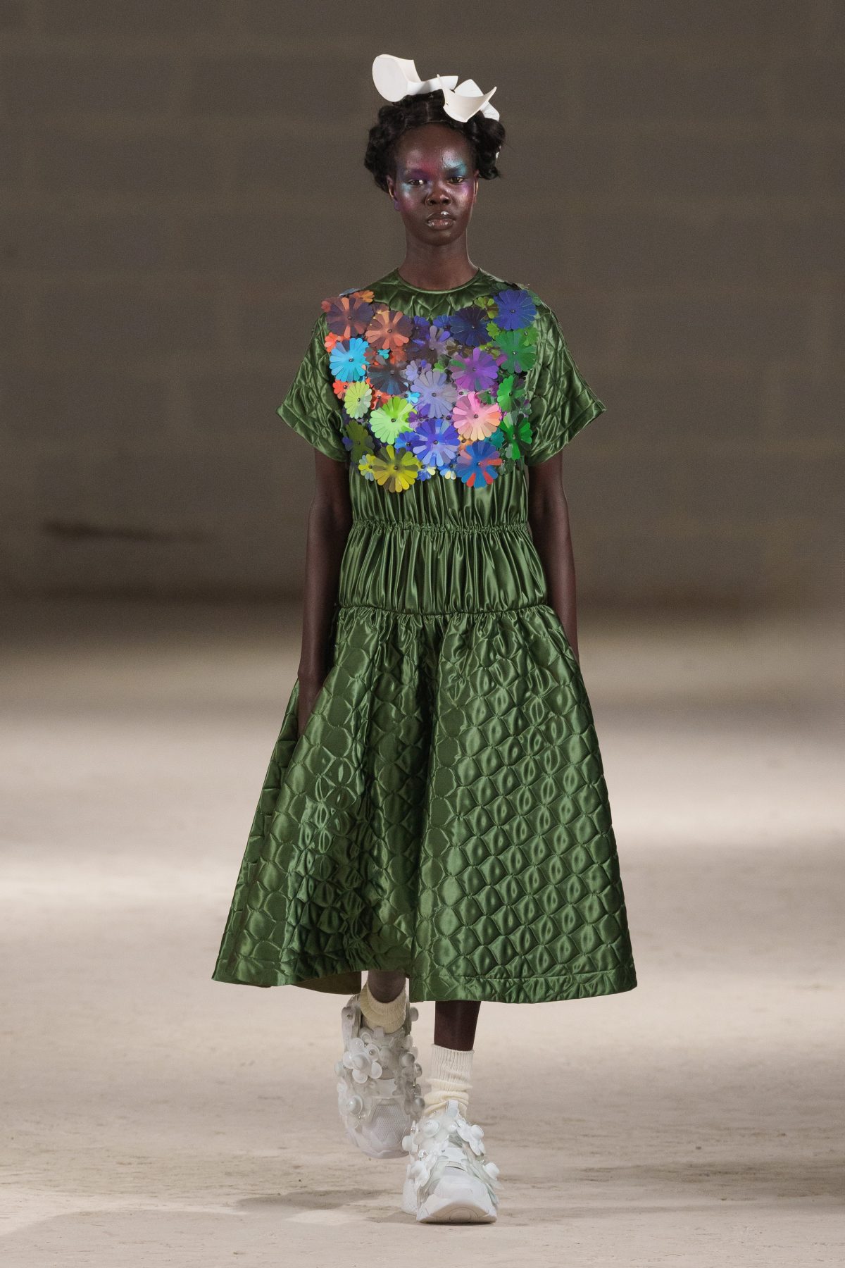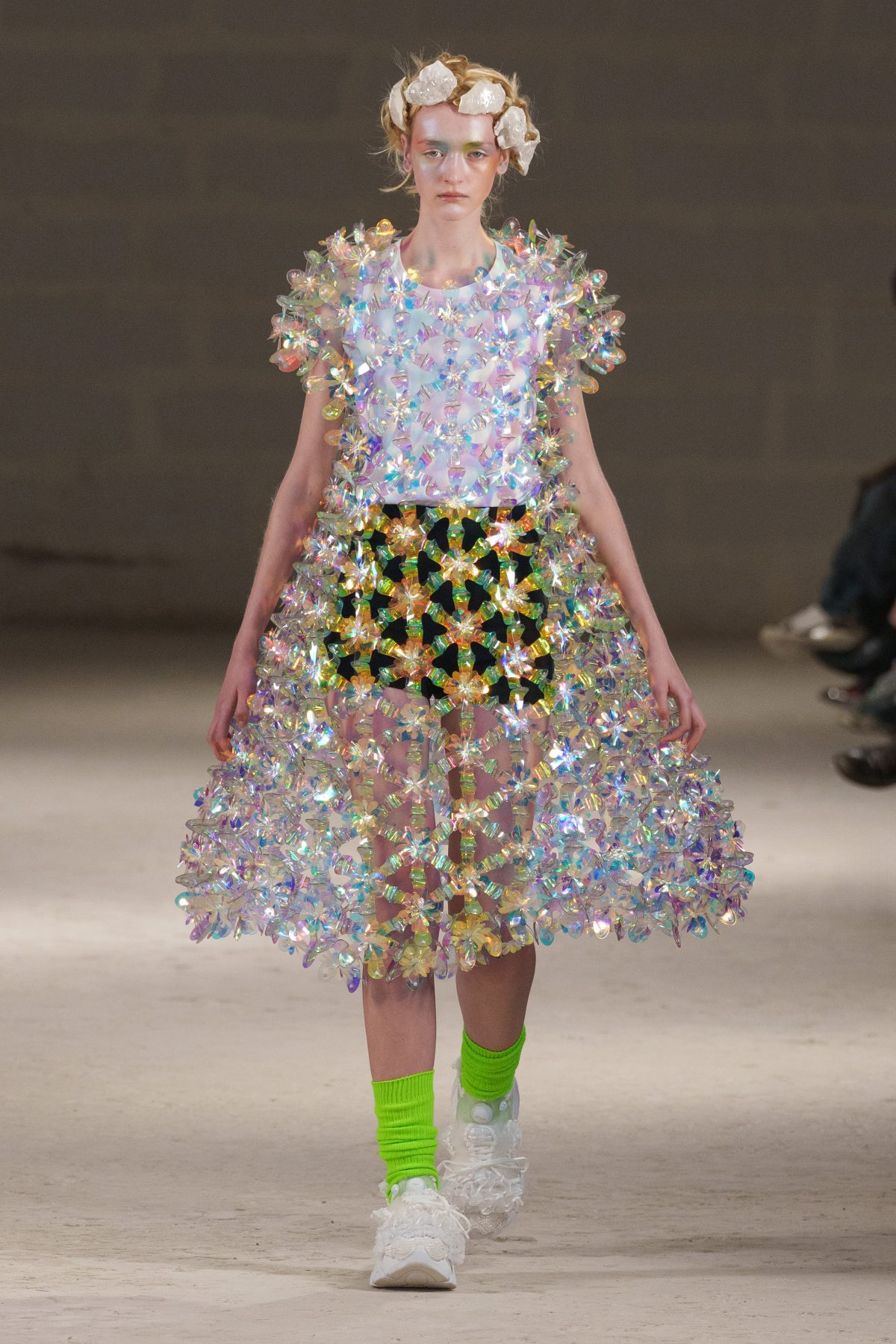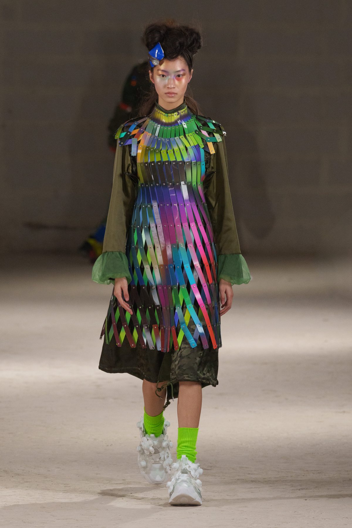 前兩款作品模特兒被彩色塑料線圈環繞,令人聯想到纏繞的電線,凌亂而富有韻律。隨後電線圈透過折扭的形式,變成花朵的輪廓,與薄紗相輔相成,營造出夢幻的氛圍感。宛若彩虹般的羽毛在薄紗裙上進行堆疊,搭載建築感裙擺,頌讚色彩與工藝之美。設計師Kei Ninomiya將絨毛與薄紗進行巧妙搭配,團狀的絨毛被染成糖果色,與輕盈感粉色紗裙相得益彰,於行走之間流露甜美氣息。紙花透過不同形式進行堆疊,呈現出立體生動的美感,而透明紙花以PVC材質呈現,透視效果彰顯精湛的制衣工藝。