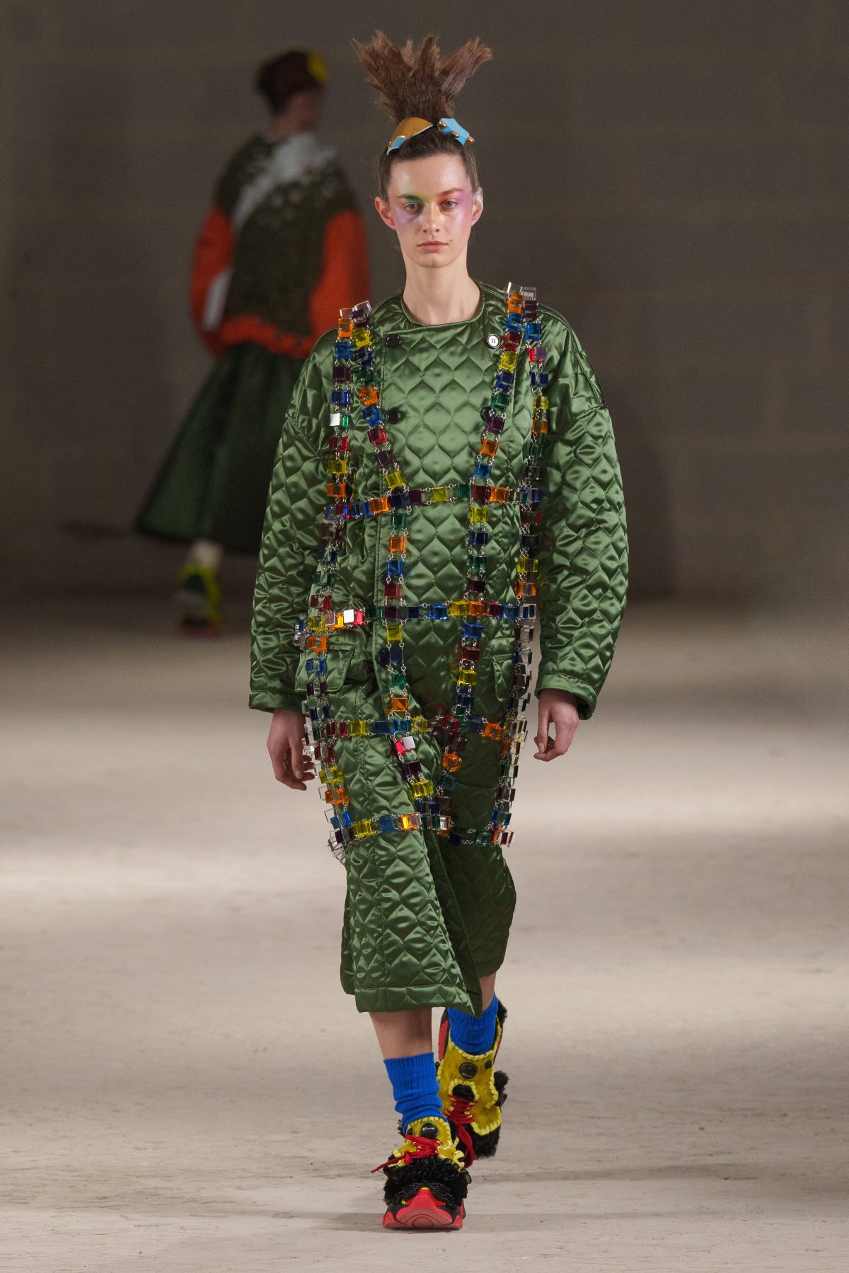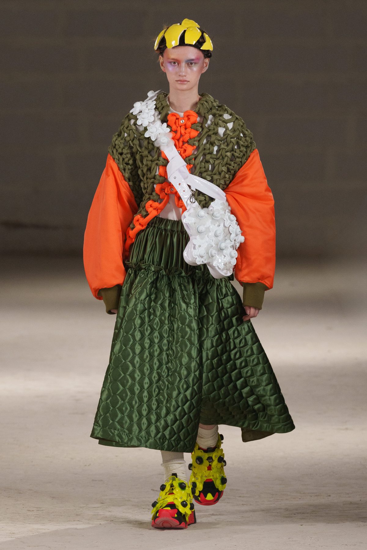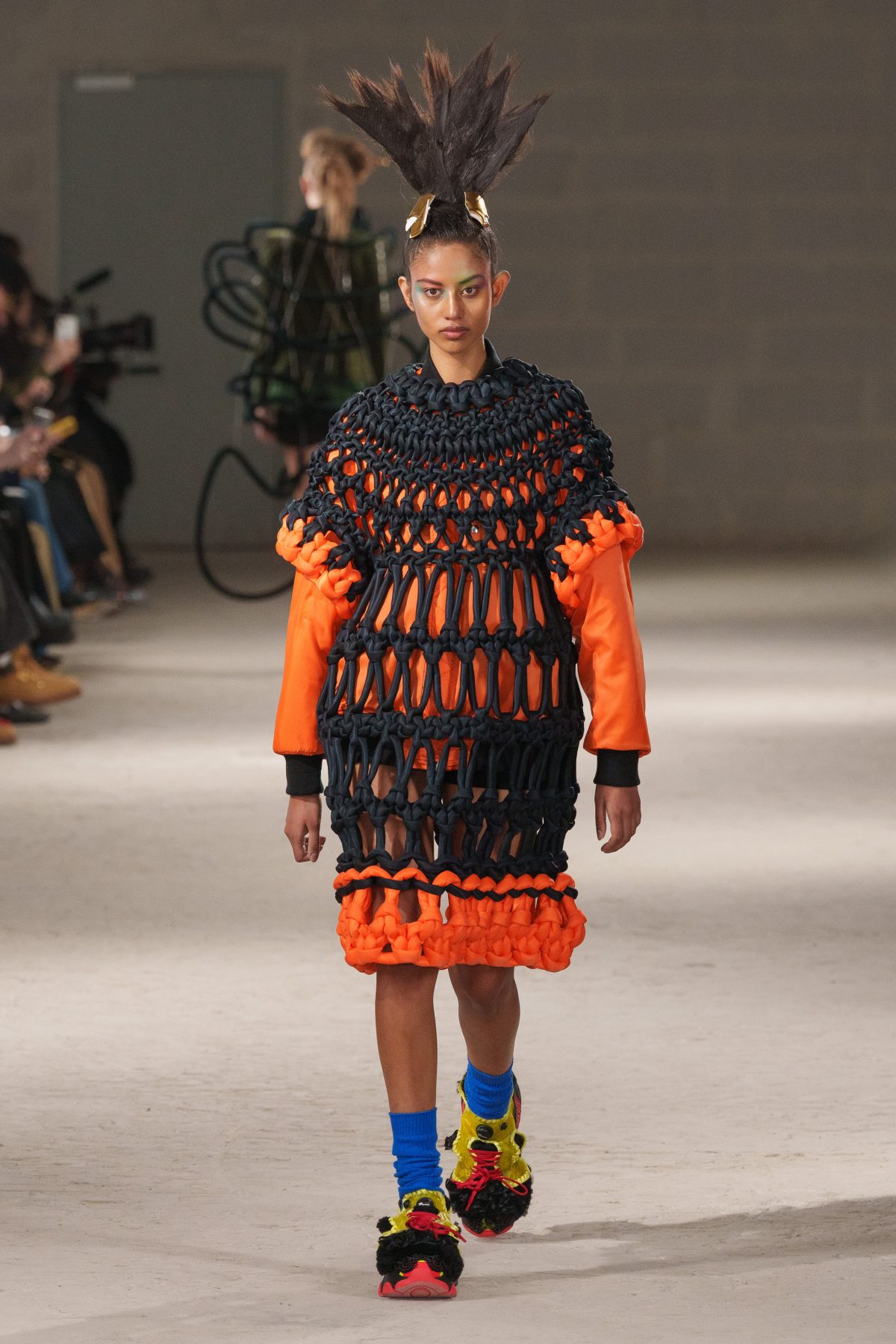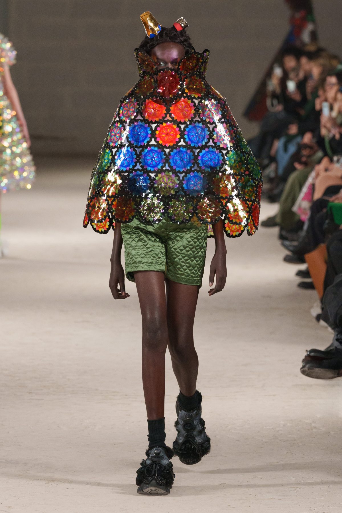 前兩款作品模特兒被彩色塑料線圈環繞,令人聯想到纏繞的電線,凌亂而富有韻律。隨後電線圈透過折扭的形式,變成花朵的輪廓,與薄紗相輔相成,營造出夢幻的氛圍感。宛若彩虹般的羽毛在薄紗裙上進行堆疊,搭載建築感裙擺,頌讚色彩與工藝之美。設計師Kei Ninomiya將絨毛與薄紗進行巧妙搭配,團狀的絨毛被染成糖果色,與輕盈感粉色紗裙相得益彰,於行走之間流露甜美氣息。紙花透過不同形式進行堆疊,呈現出立體生動的美感,而透明紙花以PVC材質呈現,透視效果彰顯精湛的制衣工藝。