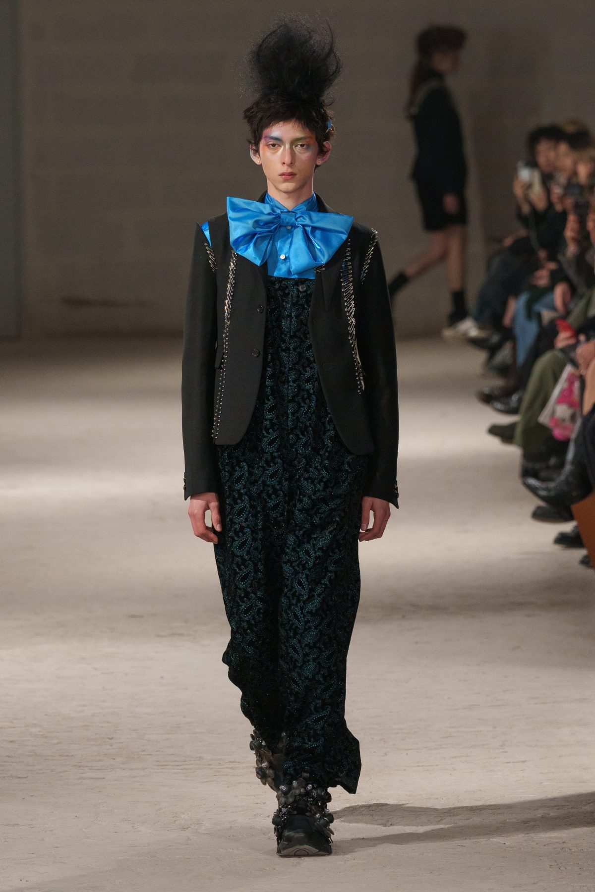 Noir Kei Ninomiya於巴黎發佈2024秋冬系列,時裝展現場有位男配音員為每位模特兒的出場進行報數,隨後取而代之的是一位兒童在打擊樂的伴奏下,一直重複著「OK」,再加入模特兒們穿上飾滿花朵元素的服裝和鞋履,令現場充滿童趣色彩。