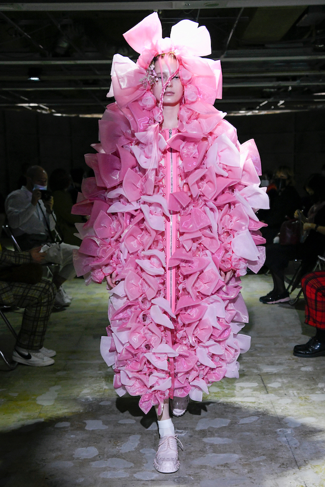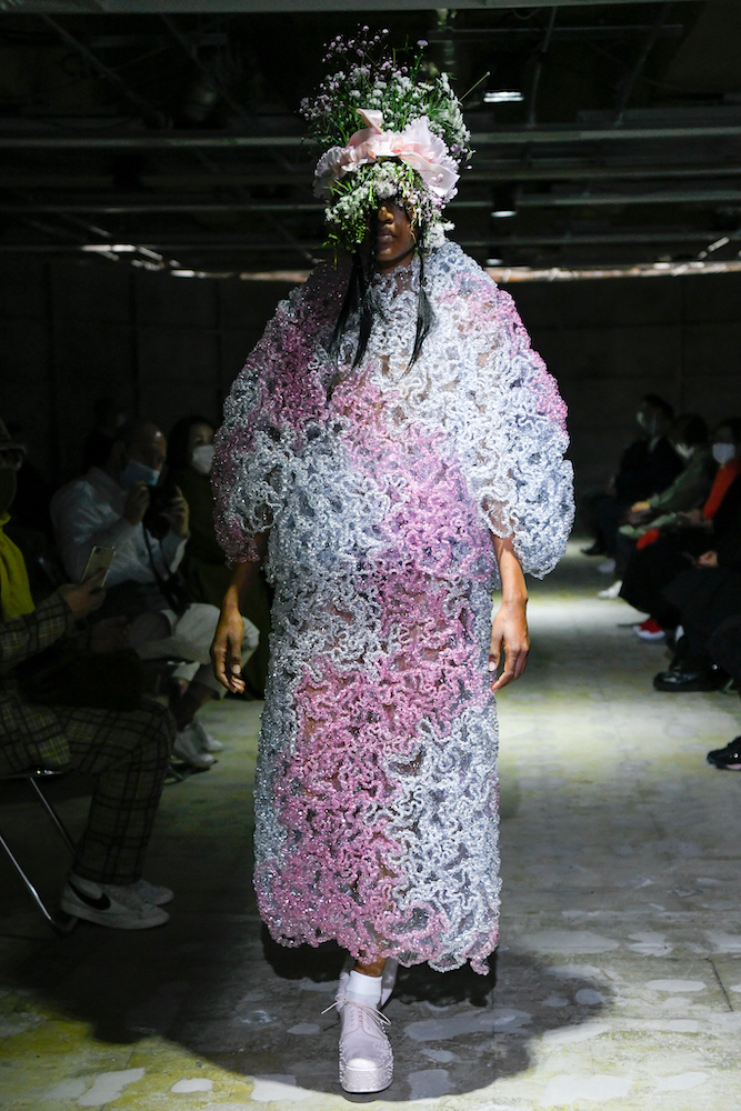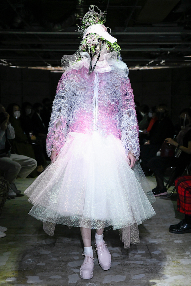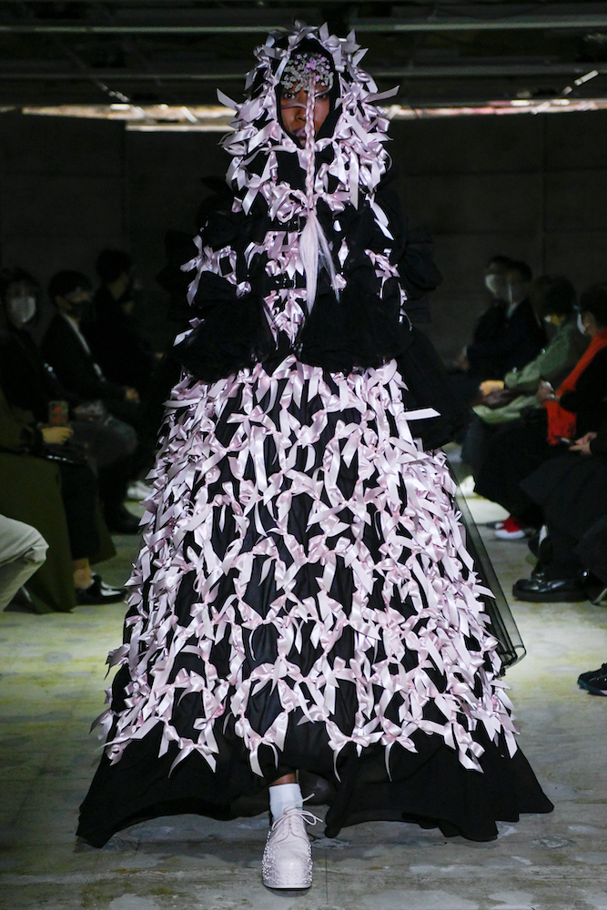 Comme des Garçons 在東京的辦公室在過去的幾星期裏一直舉辦小型時裝展現,當中包括 Noir Kei Ninomiya 的2021 春夏系列也在這裏展出。Noir Kei Ninomiya 充分利用了相對狹小的空間,打造了一條貫穿房間三倍長度的天橋,觀眾坐在通道之間的椅子上觀賞。
