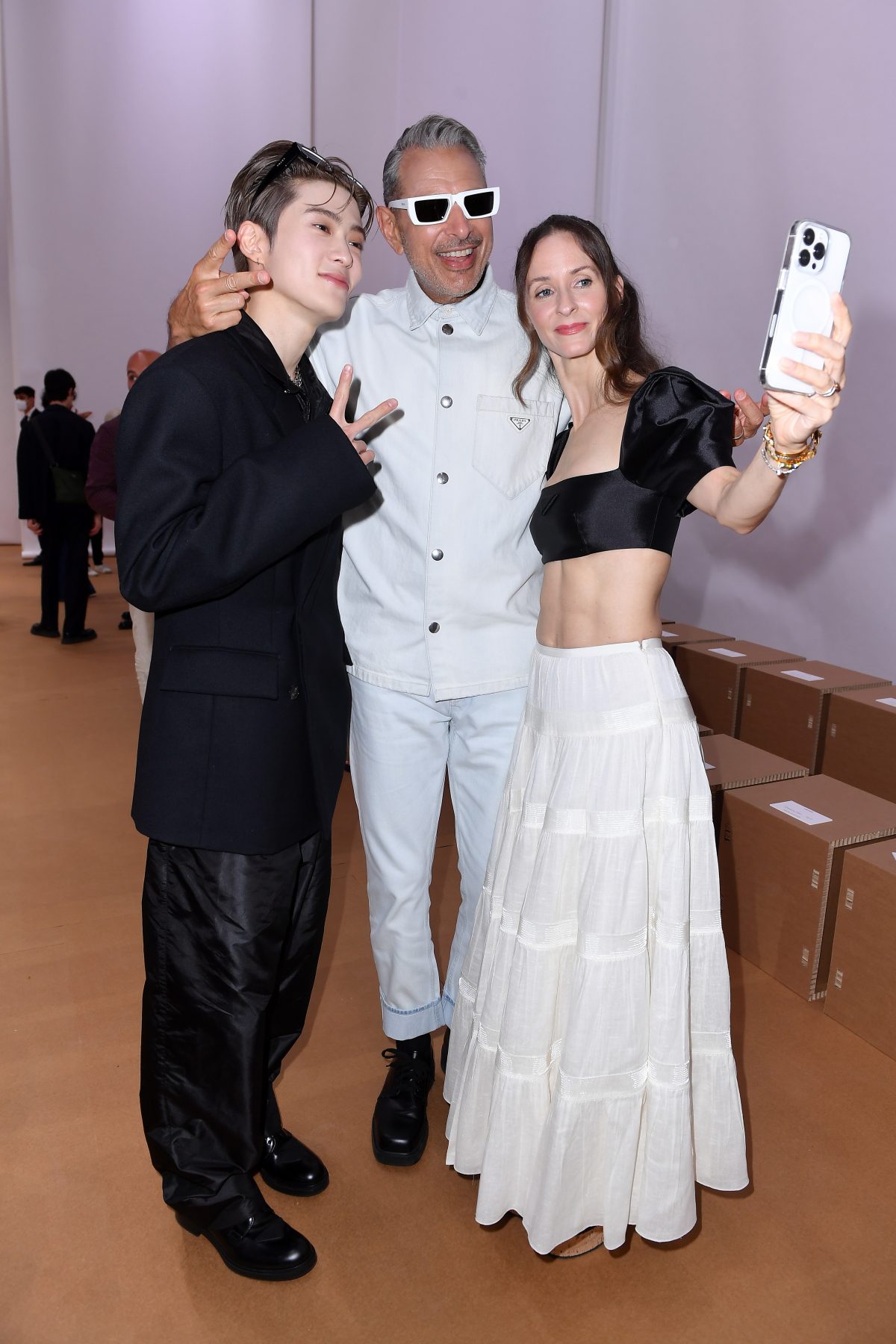 MILAN, ITALY - JUNE 19: Jaehyun, Jeff Goldblum and Emilie Goldblum attend Prada Spring/Summer 2023 Menswear Fashion Show on June 19, 2022 in Milan, Italy. (Photo by Jacopo M. Raule/Getty Images for Prada)